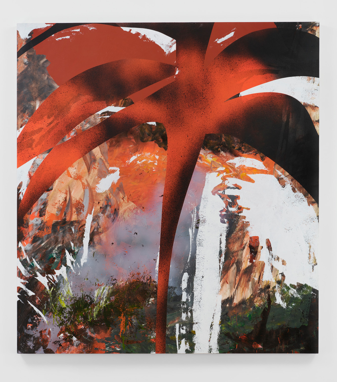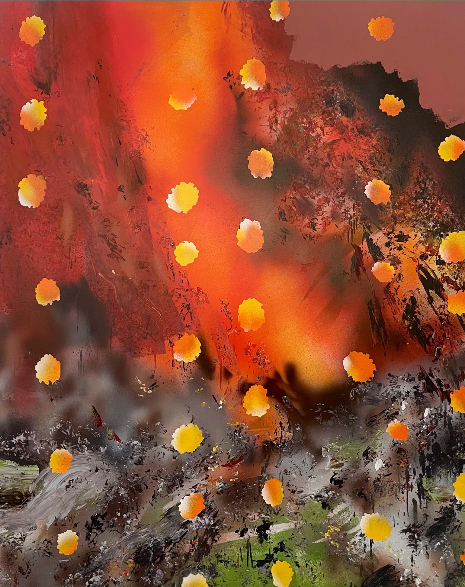 Hou Zichao, Mountain booms, smoke appears, trees on fire, banana temple, 2021. Acrylic on linen, 78 3/4 × 86 1/2 in / 200 × 220 cm