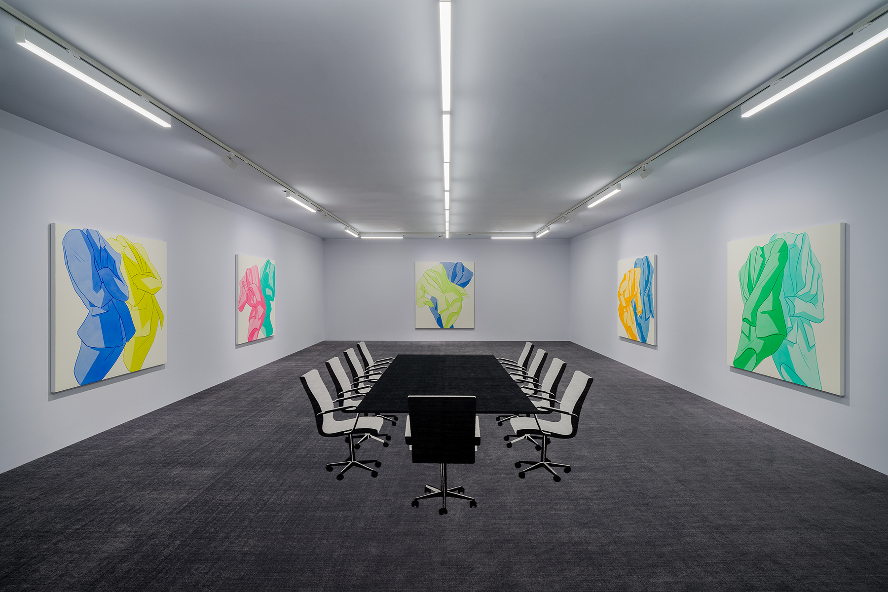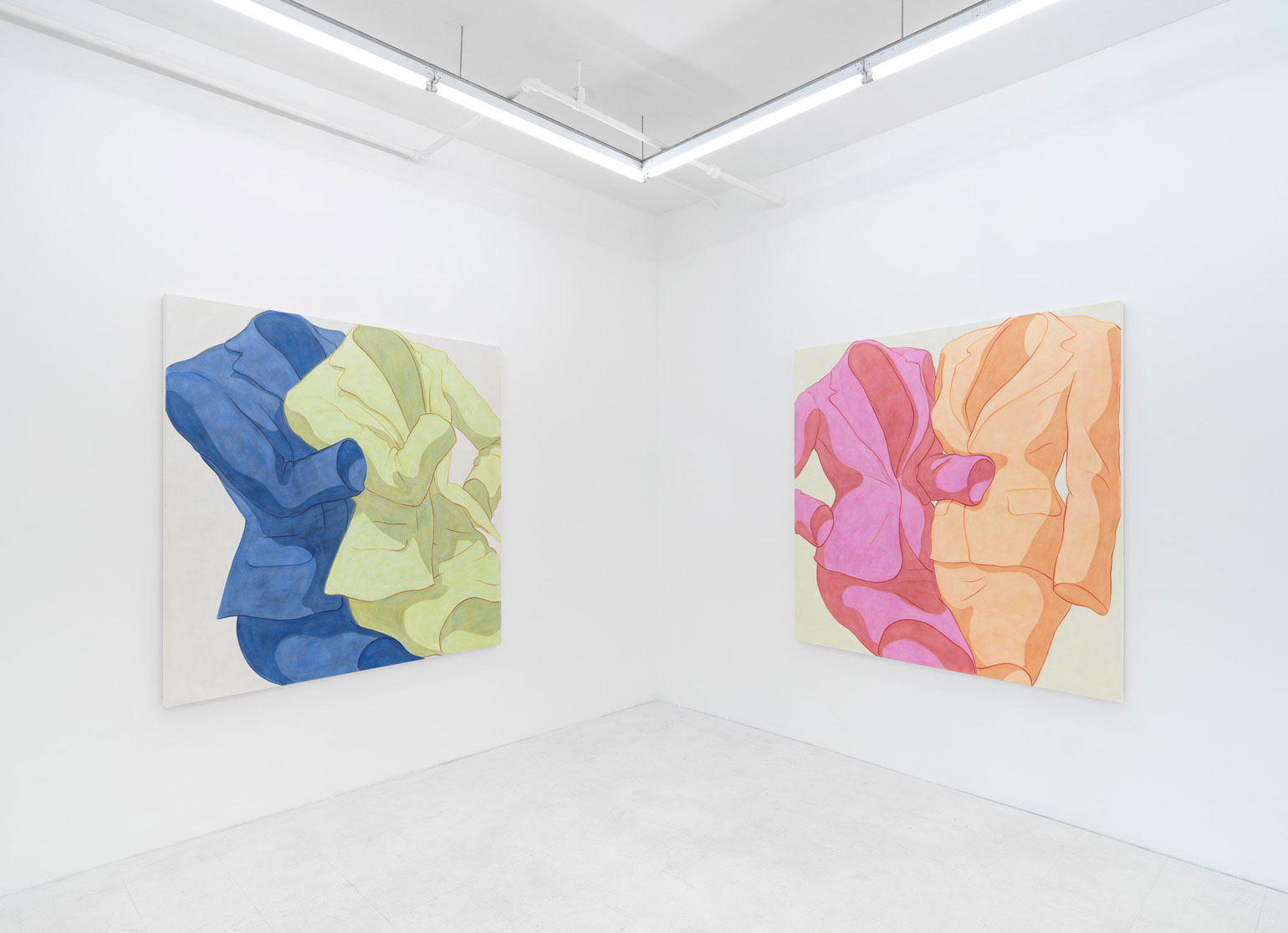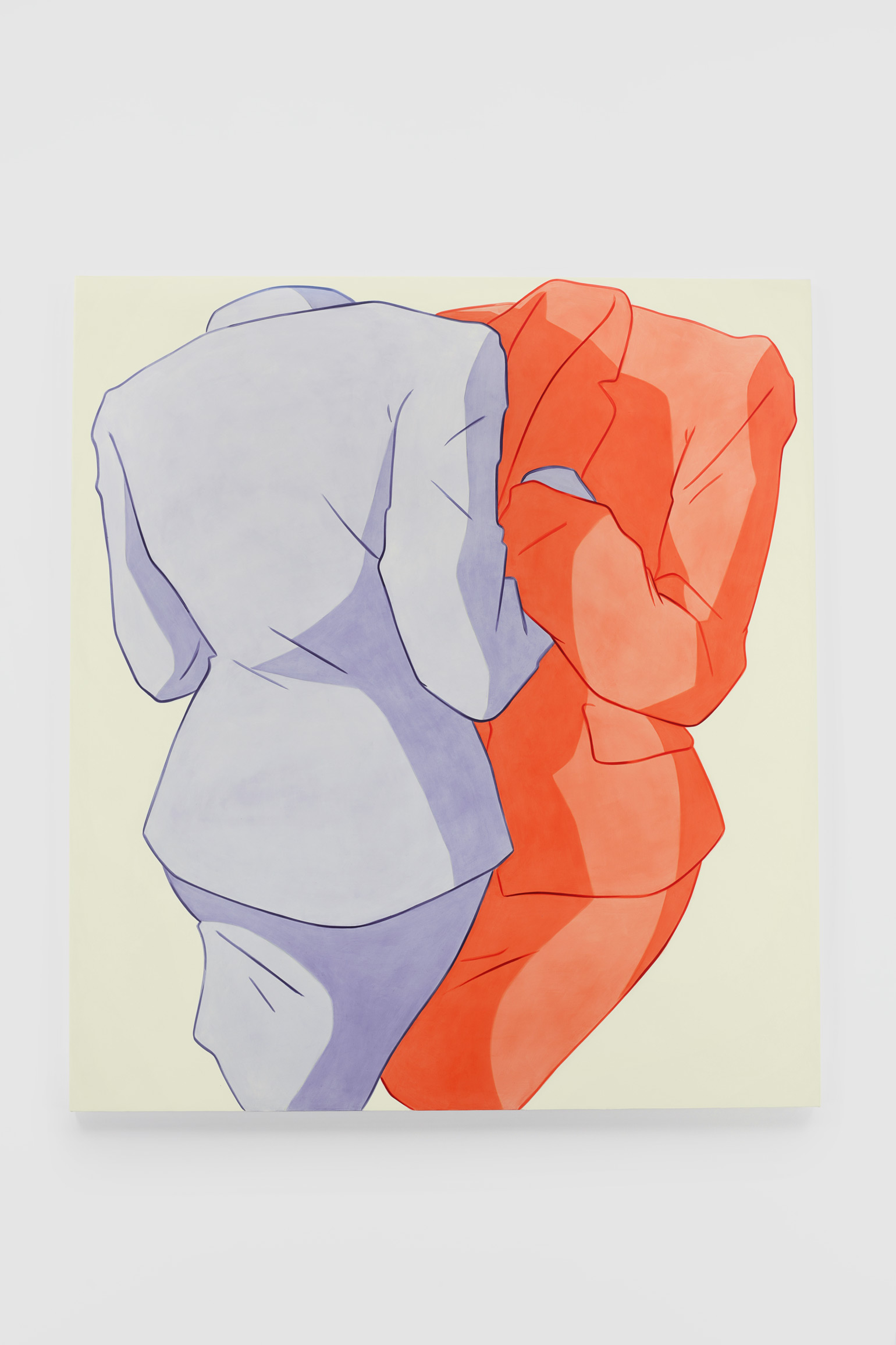 Ivy Haldeman, Two Suits, Face to Face, Cuff Grasped (Smalt, Red), 2021. Acrylic on canvas, 67 3/8 × 60 1/4 in / 171 × 153 cm
