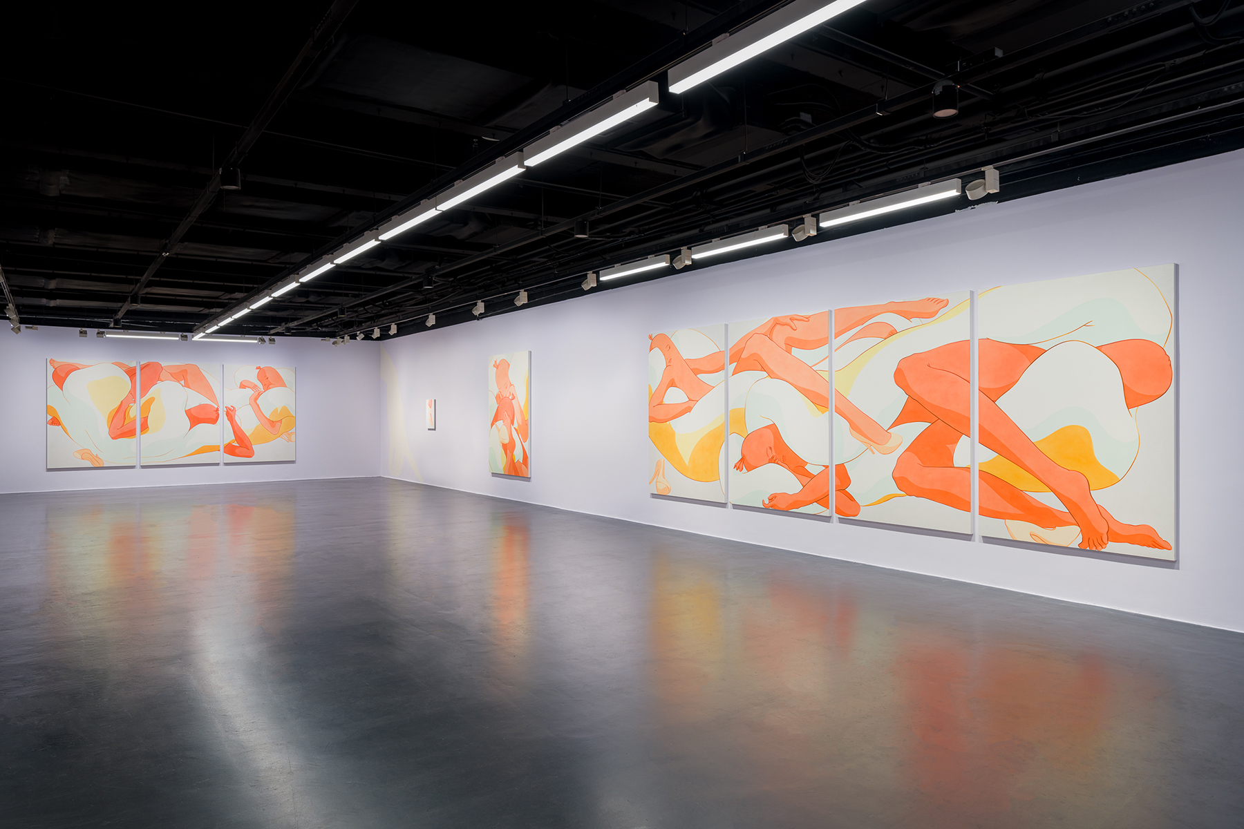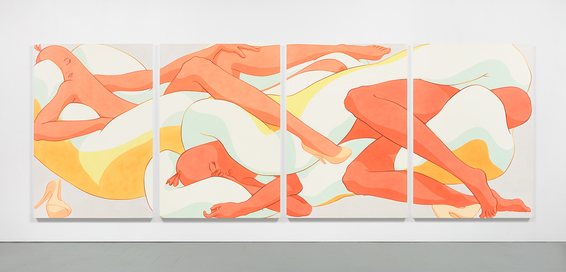 Ivy Haldeman. Two Figures, Eyes Closed, Arm Outstretched, Leg Dangles, Forearms Cross, Toe Touches Edge, 2022. Acrylic on canvas, 4 panels, each: 84 × 58 in / 213,3 × 147,3 cm