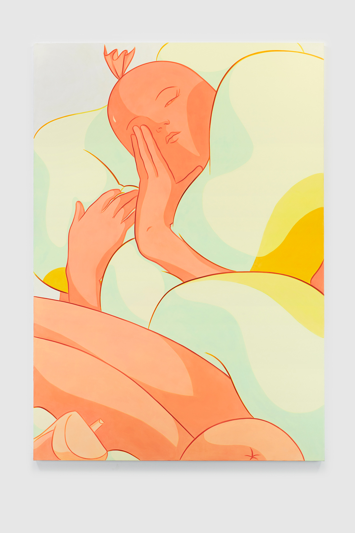 Ivy Haldeman. Twice, Eyes Half Closed, Bun Puff to Nose, Pinkies Up, 2022. Acrylic on canvas, 83 3/4 × 57 3/4 in / 213 × 147 cm