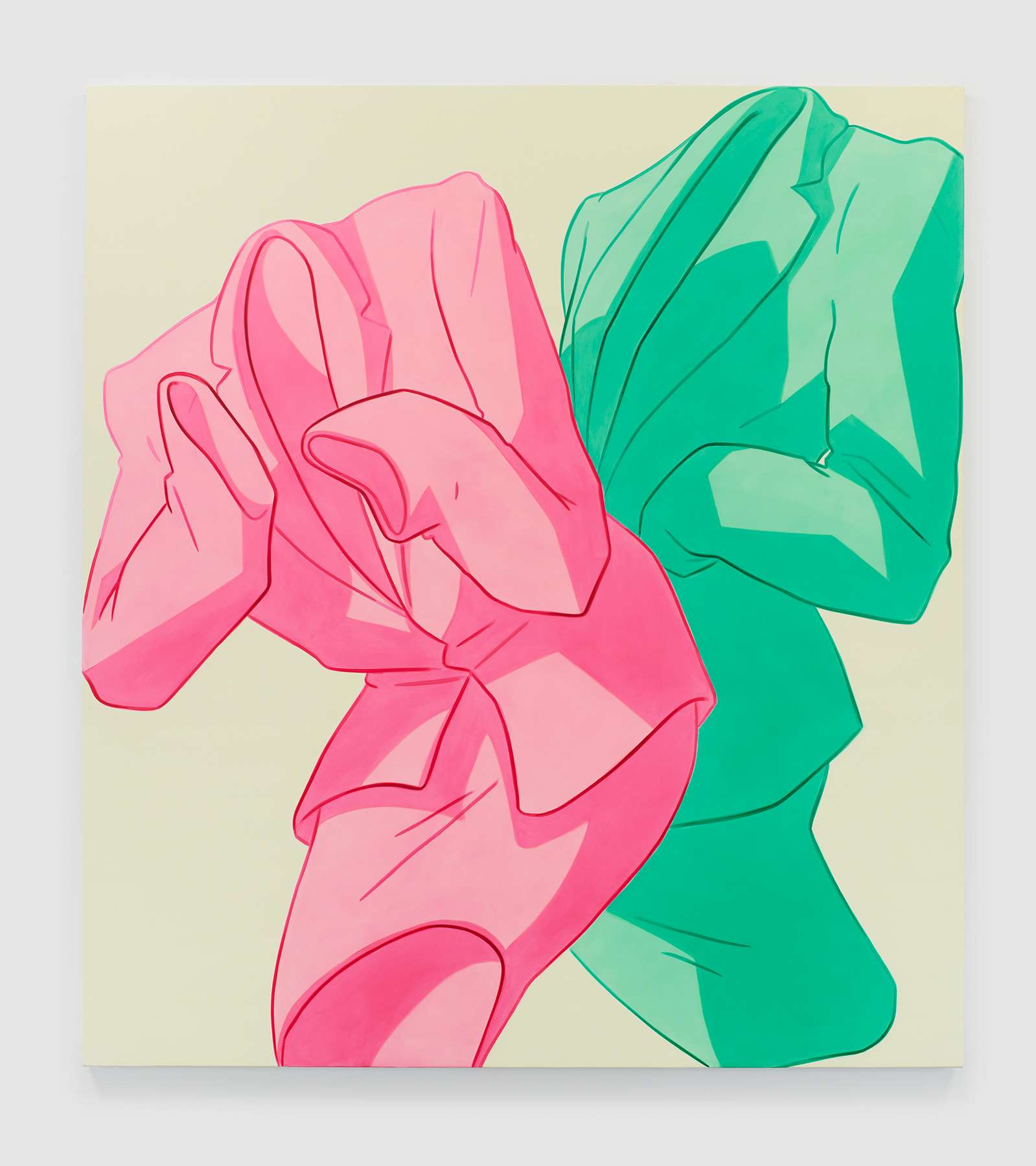 Ivy Haldeman. Two Suits, Bend, Cuff to Waist (Quinacridone Red, Phthalo Green Deep), 2022. Acrylic on canvas, 67 × 63 3/4 in / 170 × 162 cm