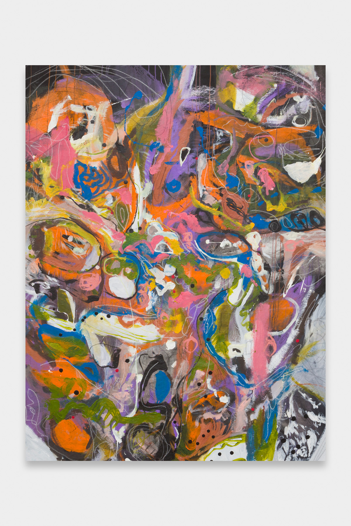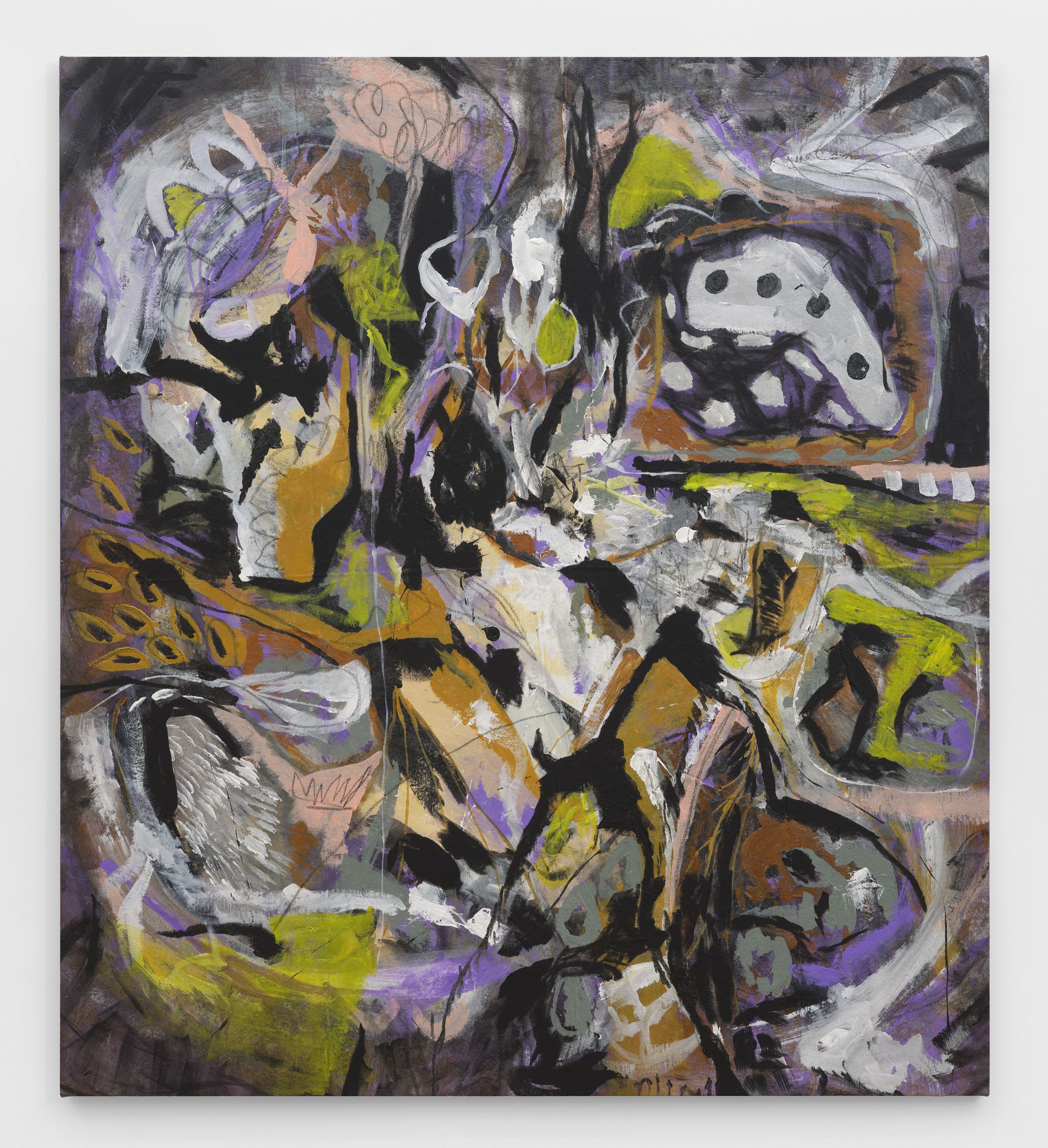 Nizhonniya Austin, There's Always Some God To Battle... Some Mountain To Climb... Some Song To Dance To, 2024. Acrylic and wax pencil on canvas, 74 × 58 in / 187,9 × 147,3 cm