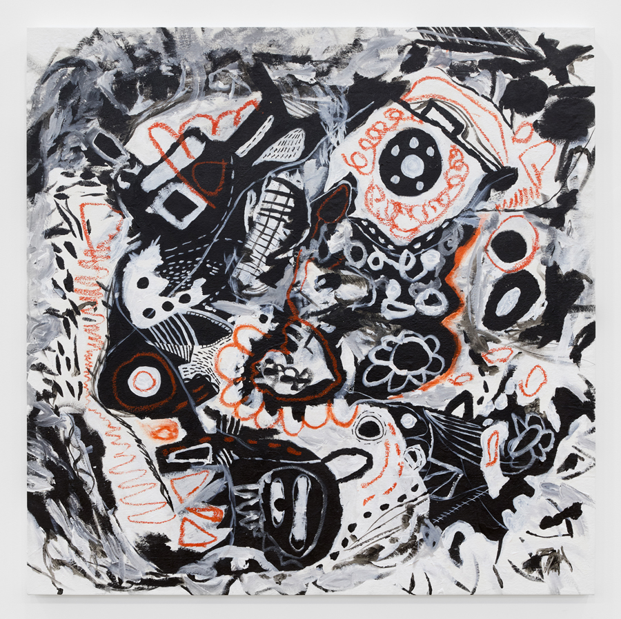 Nizhonniya Austin, The Problem Wasn't Us It Was the World, 2024. Acrylic and wax pencil on canvas, 52 × 46 1/4 in / 132,1 × 117,5 cm