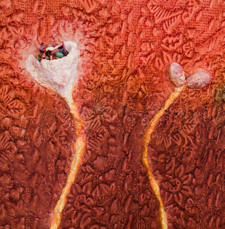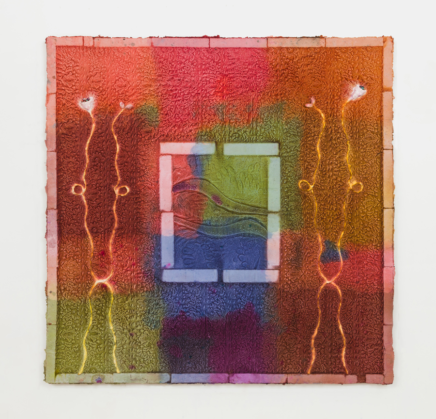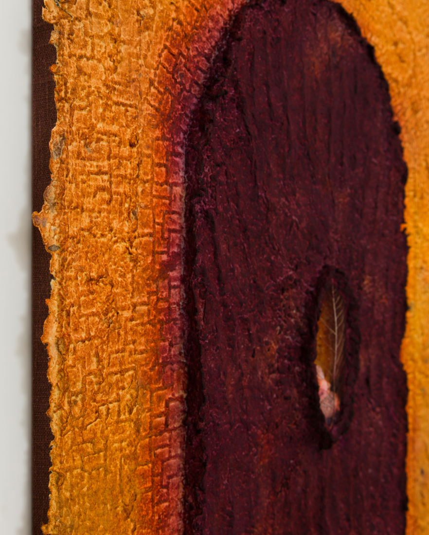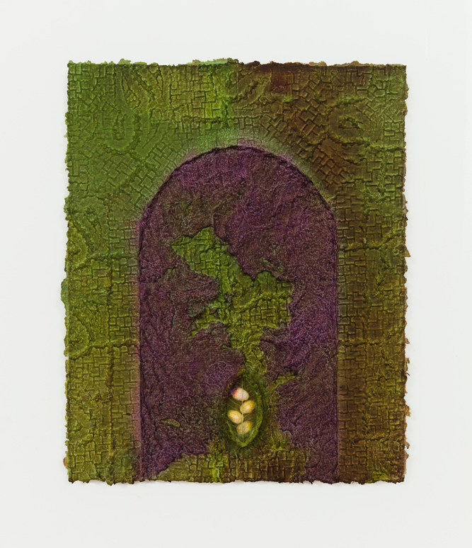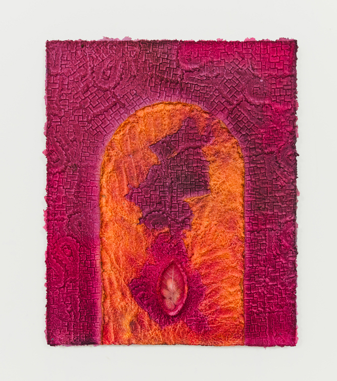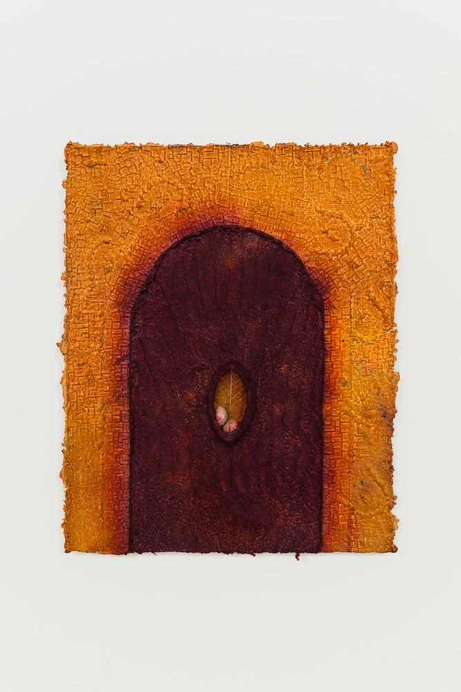 From a material perspective, Minai’s works are born from a laborious process of first producing and then molding paper pulp into various forms that come together as one complete whole. The remains of a prior work always find their way into the next, generating a harmonious cycle of rebirth. The color in this new body of work deviates from the earth-toned palette with which Minai has been known to use. This shift reflects an experience akin to that of a seed sprouting above the ground for the first time, marking a shift in the practice she’s spent years excavating. While in the studio, Minai attempted to tap into the sensation of what one’s first experience of seeing color or witnessing a sunset might feel like to unfamiliar eyes.