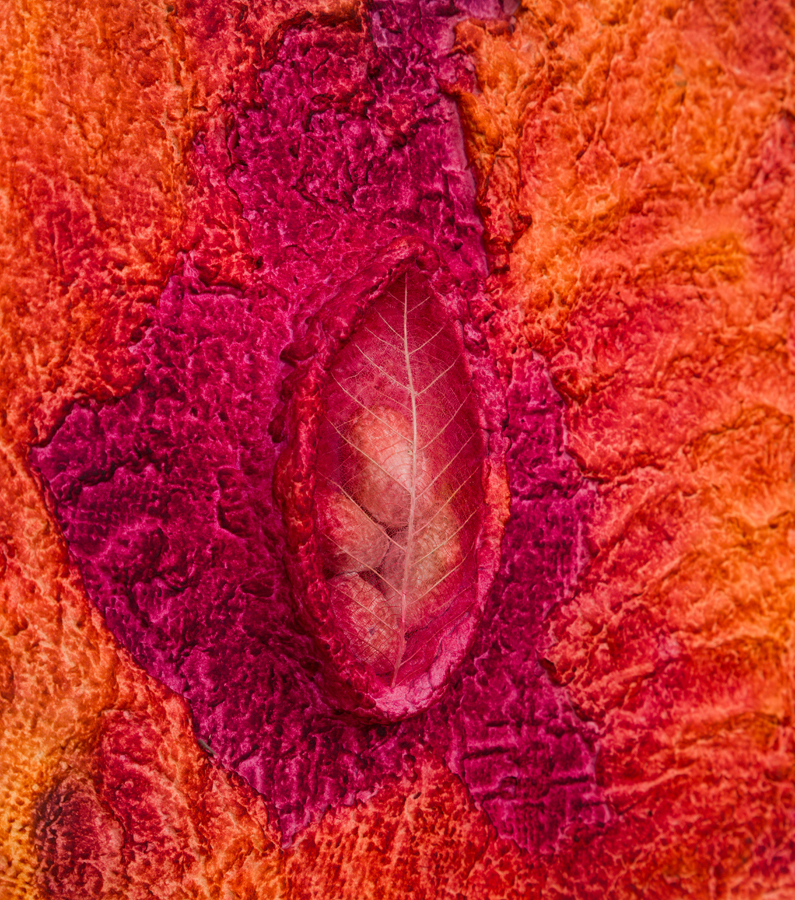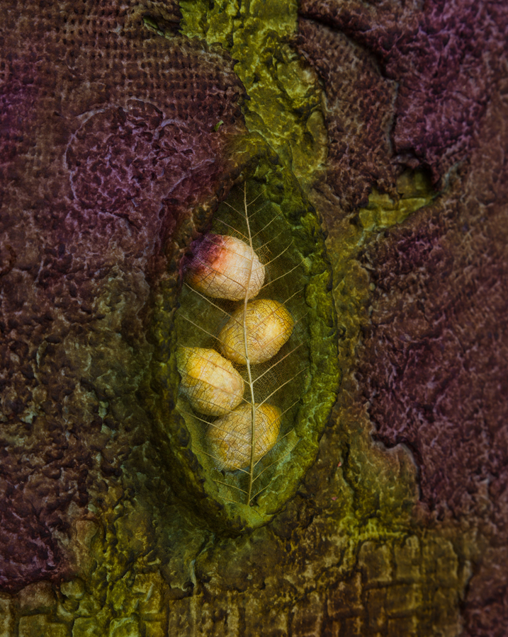 The smaller works in the exhibition are part of Minai’s ongoing Seed series, made in homage to the Woman, Life, Freedom movement enduring in Iran. Crafting an enclosed structure with the skeleton of a leaf, the artist creates a womb-like space holding new life forms, representative of the safe spaces she hopes will one day exist for Iranian women.
