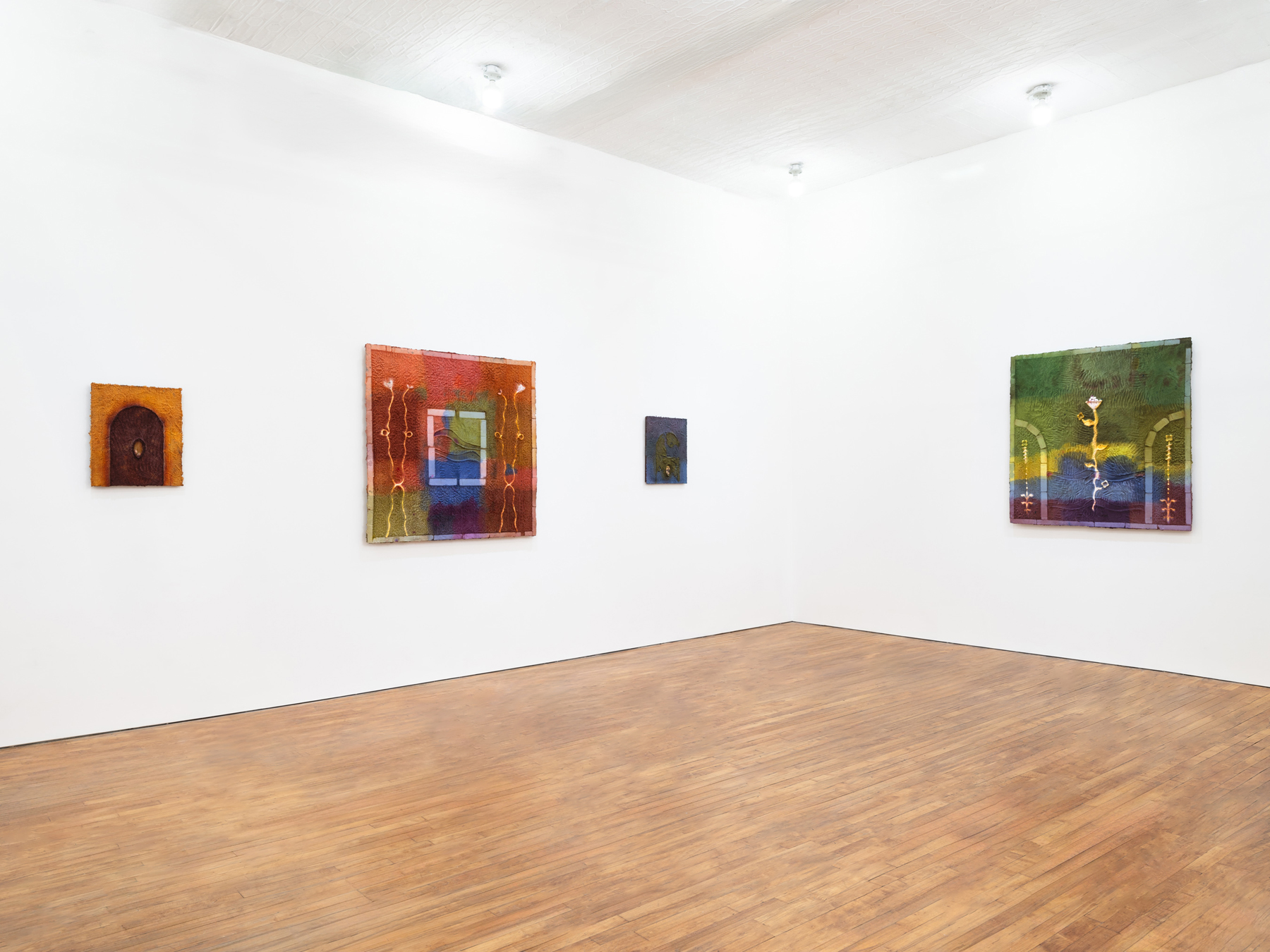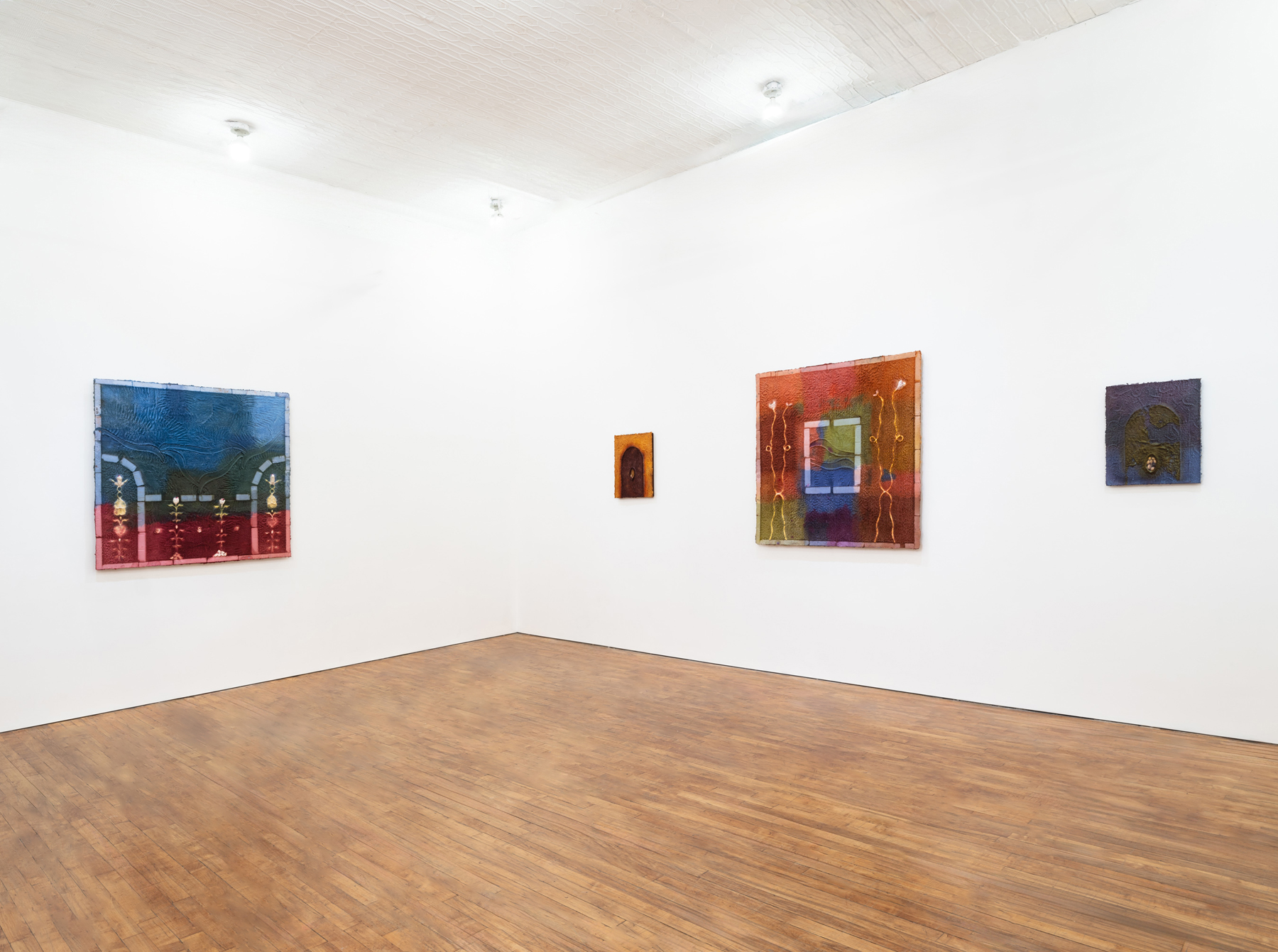 The exhibition centers around Bedroom II, an homage to the bedroom Minai inhabited during her childhood and adolescence in Iran. Working in opposition to her fading memories of this space, Minai memorializes the room, using key elements of her practice – stencils and woodblocks sourced from her home country – to mimic the wallpaper pattern she spent countless hours encircled by.