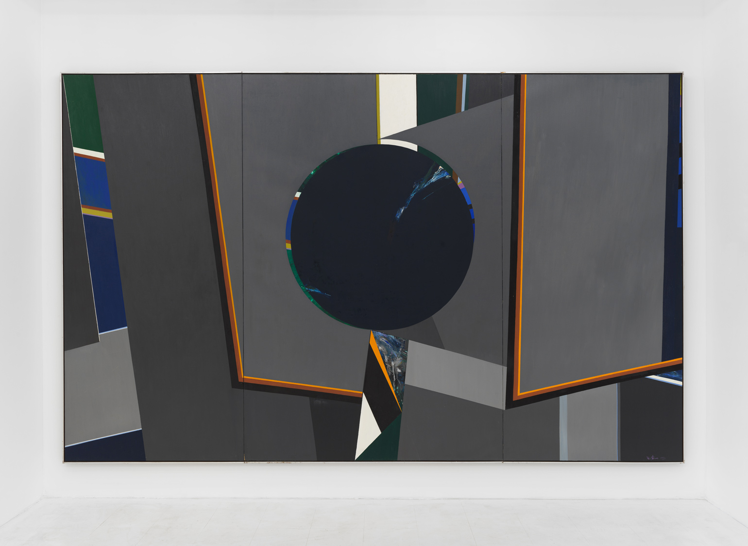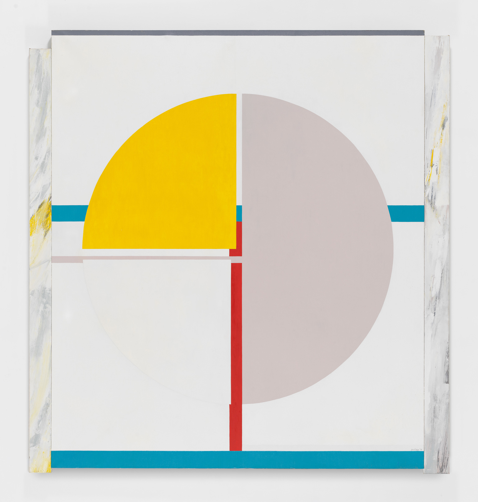 Hopkins’s hard-edged forms are unpretentious in their materiality—passages are stained with domestic paint, revealing the grain of the canvas below, or sections of chalky acrylic flatly admit the brushwork that composed them. But the areas of expressive gesture often have the additional effect of trompe l’oeil, mimicking in oil paint the fractured surface of marble. If Hopkins meant to make reference to this classical material in the marginal under-passages of his paintings, it may have been to suggest that, in the background of all our design is the urge toward reason.