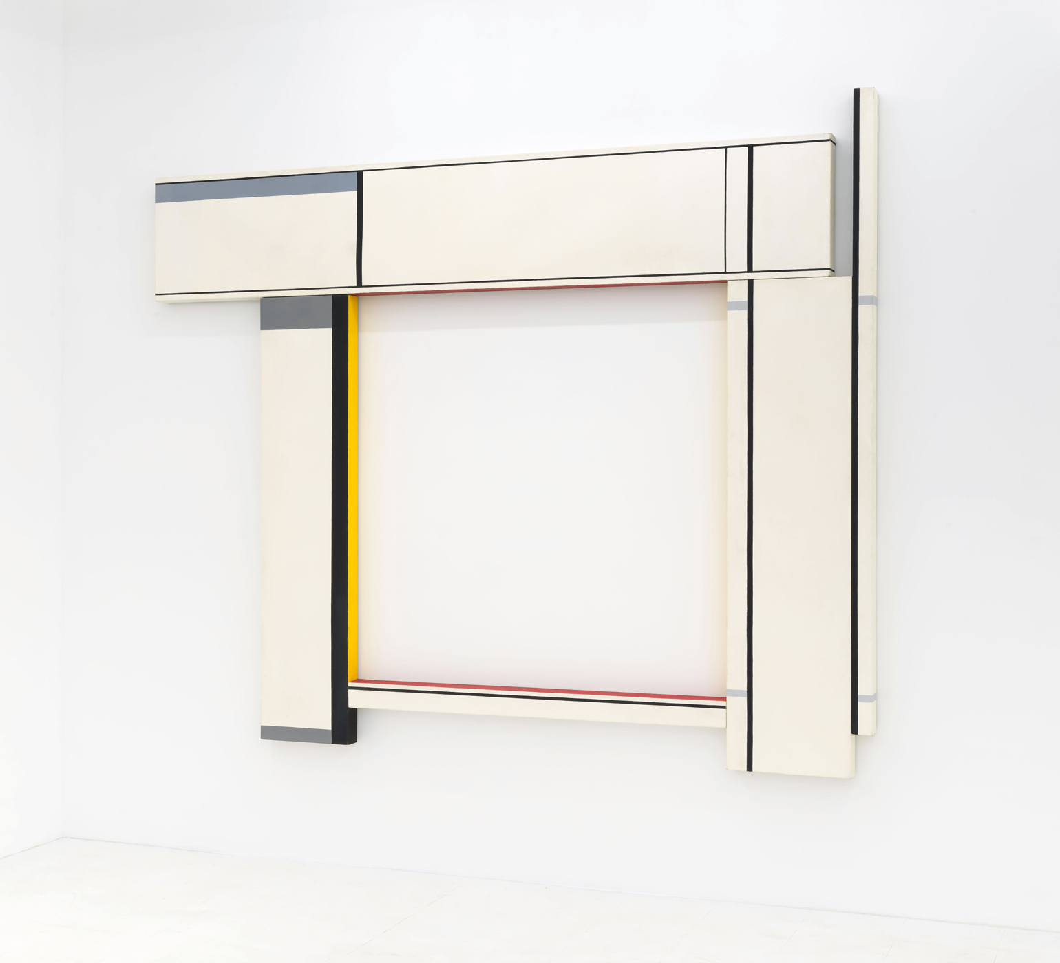 In the early ’70s, Hopkins expanded the disjunctive rhetoric of his paintings by incorporating several discrete canvases into single works. White City Wall, 1974, comprises a square flatly-painted canvas, white with an intervening gray and yellow circle, flanked by two narrow, gestural canvases that are mounted to its sides. Mondrian-like lines of cyan and red divide the central canvas, and a thin horizontal grey line is painted at its top, suggesting an improbable shadow and creating a register at which the top of the right columnar canvas begins—the top edges of these conjoined canvases do not level with the central one by significant margins. As is also made explicit in the five-canvas construction Hera’s Wall Temple, 1978—in which painted lines of varying weights obscure the actual seams between canvases—this body of work takes the structural exploration of Mondrian and makes it architectural.