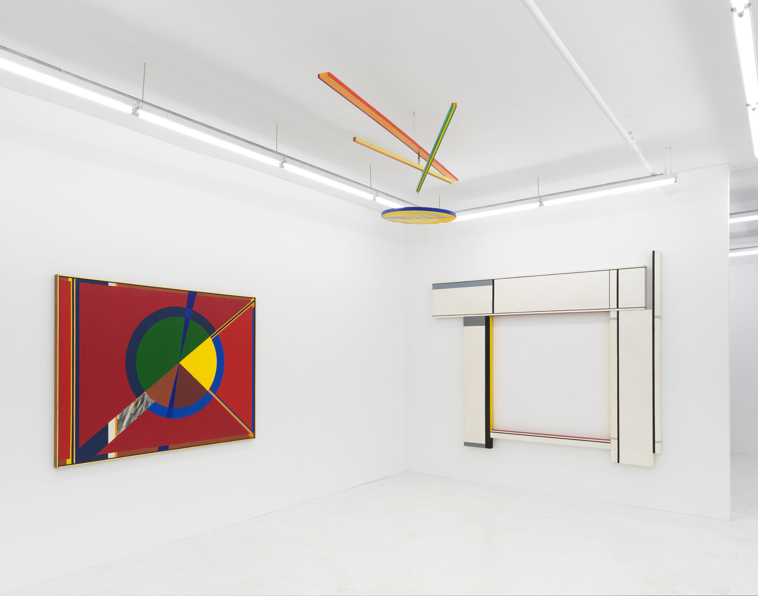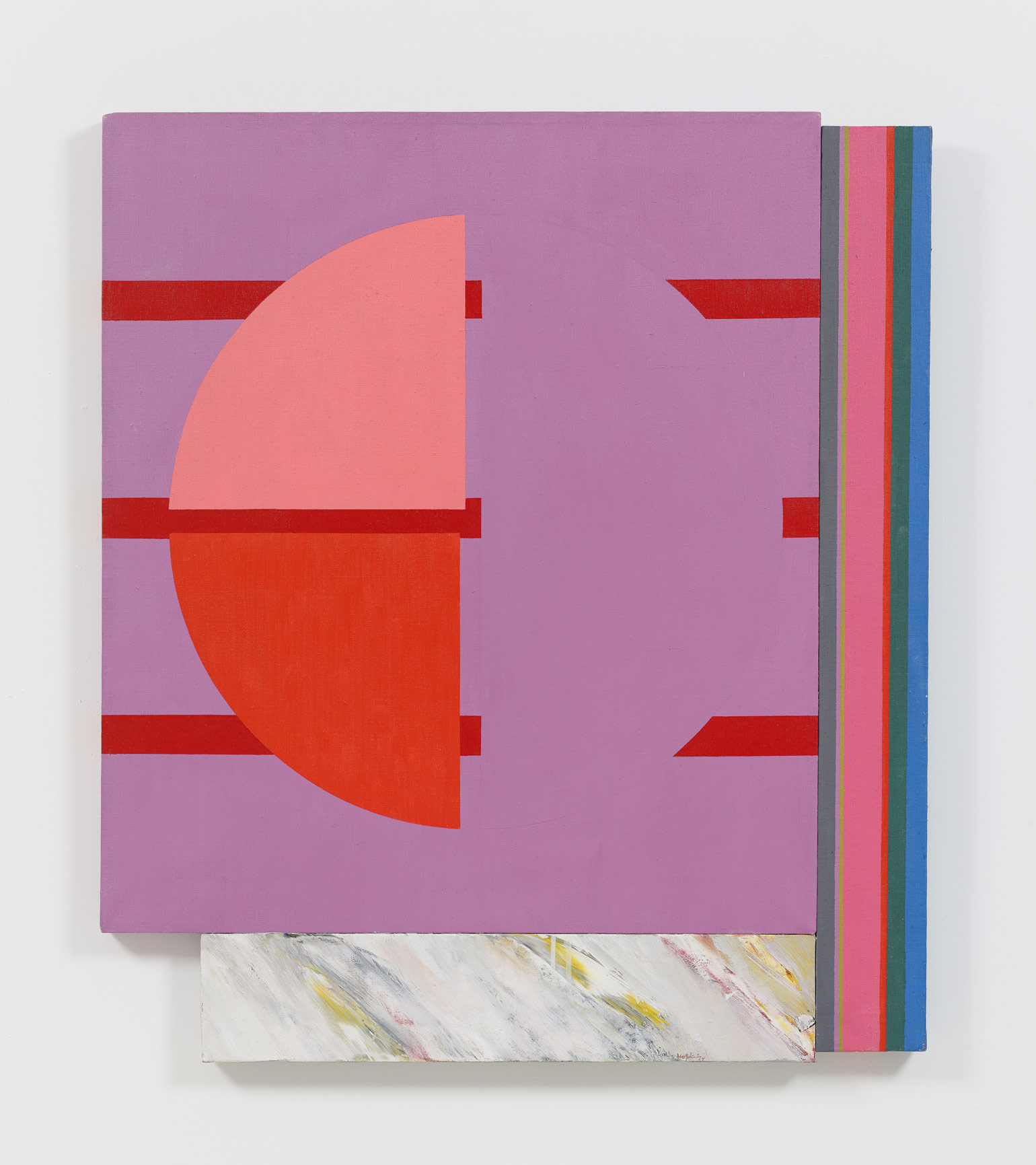 Indeed, there is a superficial dualism built into Hopkins’s identity and his work alike. His mature paintings arrived in the early 1960s with the combinatory impulses of late-modernism, via Fernand Leger’s Cubism, El Lissitzky’s prouns, and Kenneth Noland’s flatbed targets. But they aren’t ahistorical pastiches. His canvases—in southwestern or Memphis design-like palettes of bold primary colors augmented by muted hues—feature hard-edged geometric compositions interrupted by searing passages of gestural abstraction. The latter moments are rendered such that they appear to inhabit a plane under that of the flatly painted forms, which themselves create optical illusions. In Tropaz, 1969, for example, a central lavender circle shares a plane with a fractured mauve ground, which is bifurcated just below the painting’s center horizon. Each resulting half is painted so that a slightly uneven border with the canvas’ edge reveals planes of forest green and turquoise underneath. These verdant planes are subsequently partitioned by stripes of yellow, orange, and umber. None of these geometries align—the eye is perpetually thrown off mark. Just below the central circle, the mauve breaks into tooth-like shapes to make way for a view to brushy white impasto. In one of the painting’s suggested dimensions, an “all-over” lurks. Hopkins’s pictorial spaces assemble and then contradict and unravel the very internal logic of the assemblage. And in this way, the viewer is foreclosed from registering any one gestalt.
