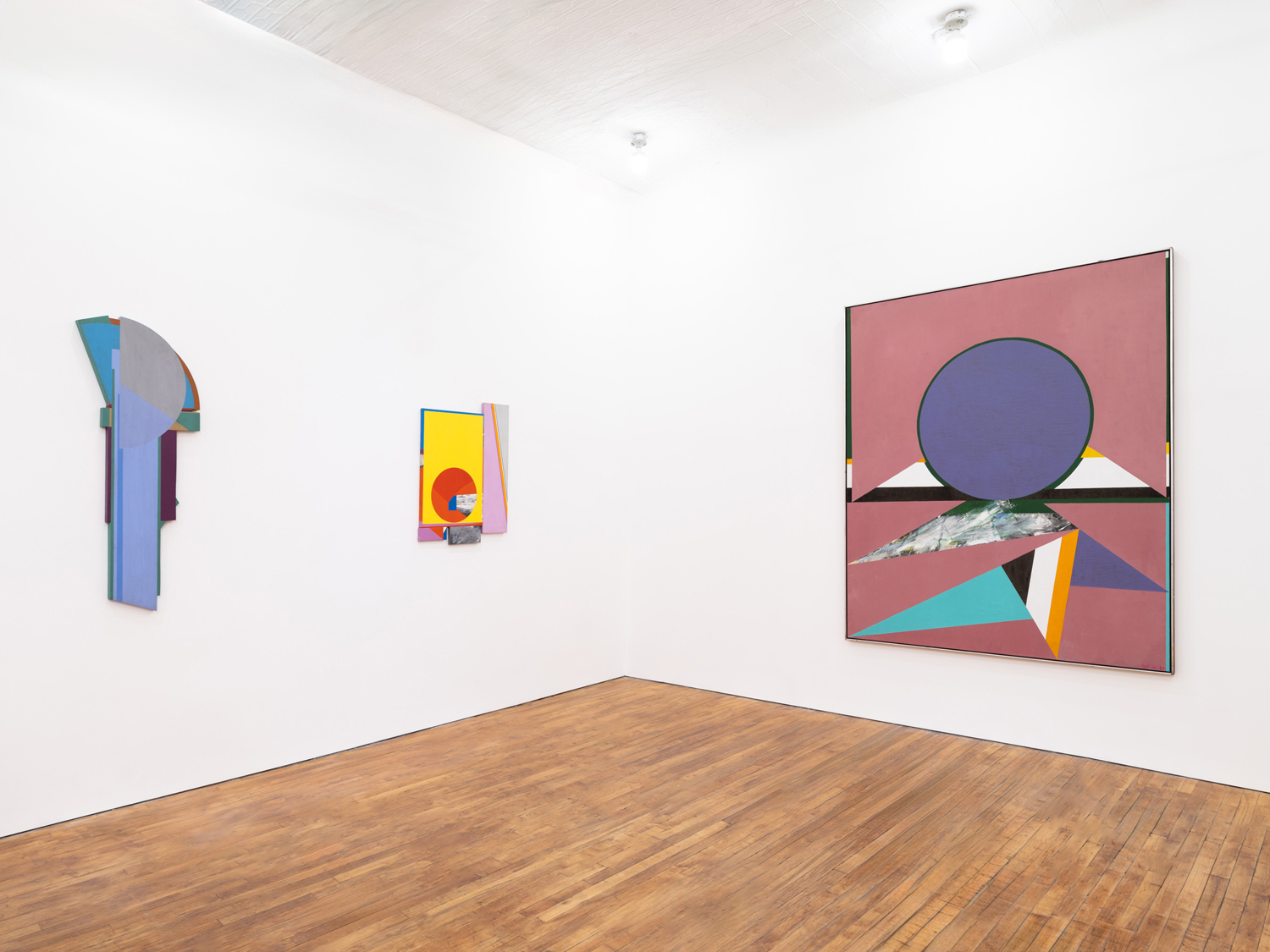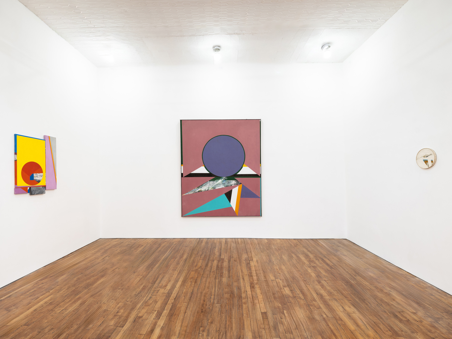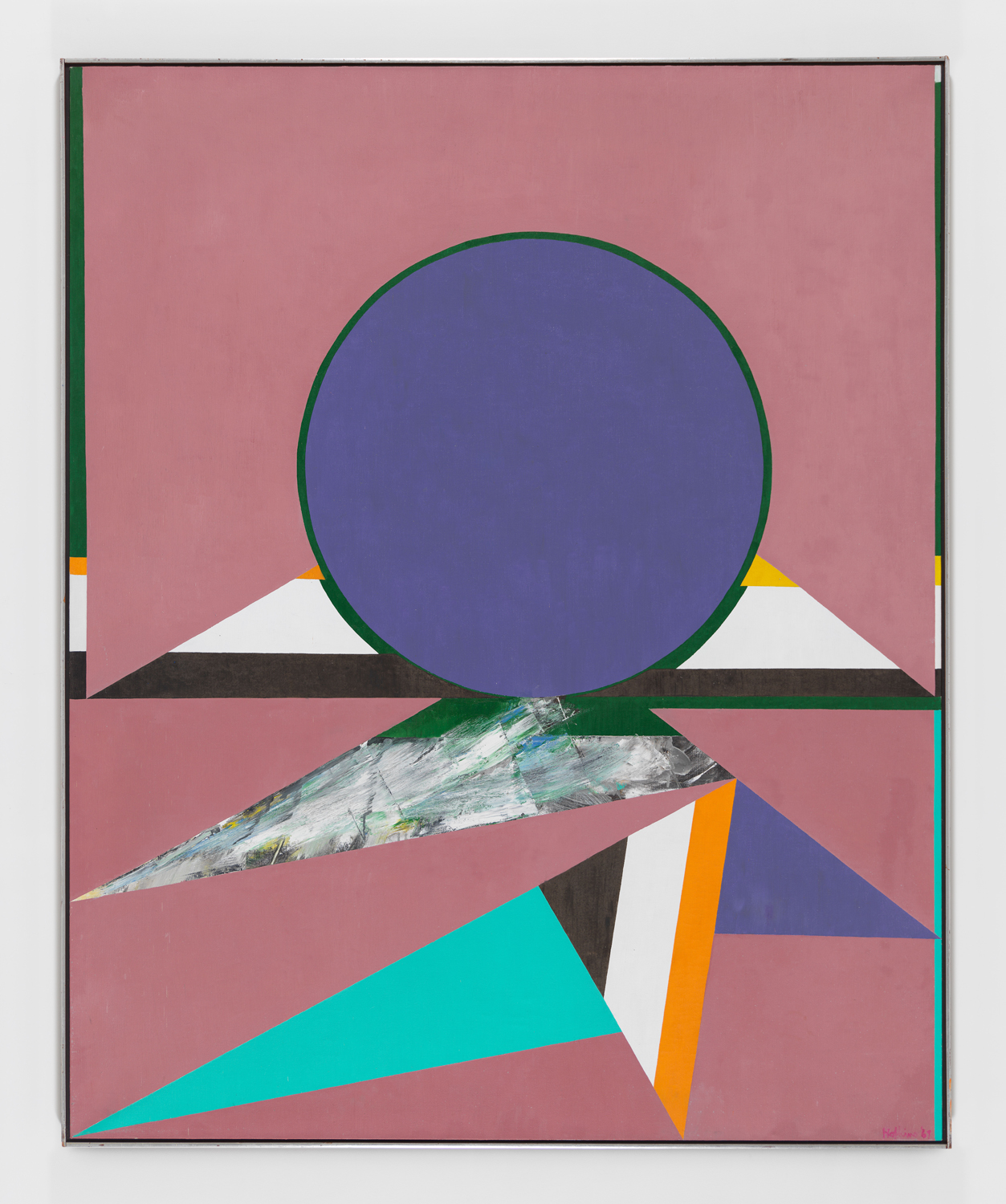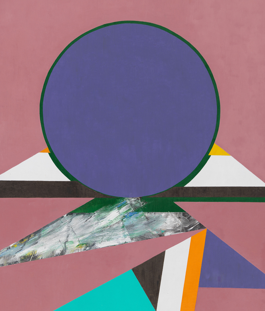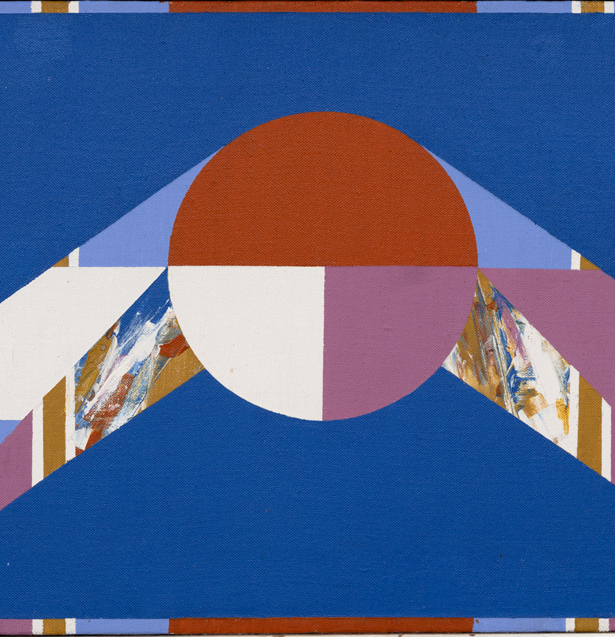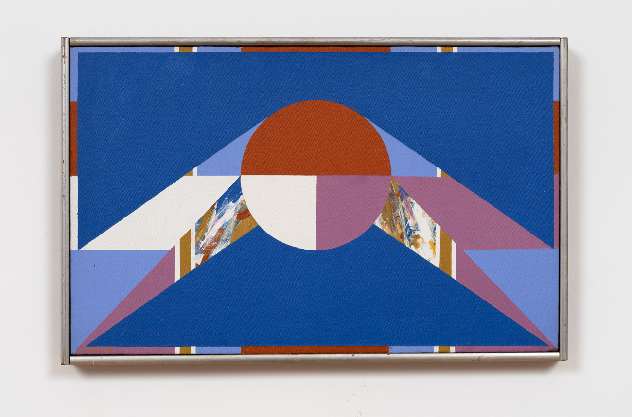 Tropaz, 1969, the exhibition’s monumental centerpiece, evinces the disjunctive logic animating Hopkins’ practice. Crystallizing collagist experiments into a unified field, Topaz pairs flat, interwoven planes of color that seem to conceal another, more expressionist work beneath. All are subsumed by the central, often recurrent, motif of the dominating solar form. We begin to name the appropriate references – Frank Stella, Jackson Pollock, Josef Albers – and then such associations begin to fade. The cosmology of forms overtakes us and we find ourselves in an alternate landscape, composed of flat surfaces rendered in dusty pink and purple navy, cool shades of turquoise and emerald green. Relinquishing ourselves temporarily in front of Tropaz, we begin to glean what Hopkins intended when he disavowed a purely aesthetic interpretation of his work – that each painting holds its own evocative tentativeness, a unique emotive tenor, and, finally, within it, “a sense of arrival.”