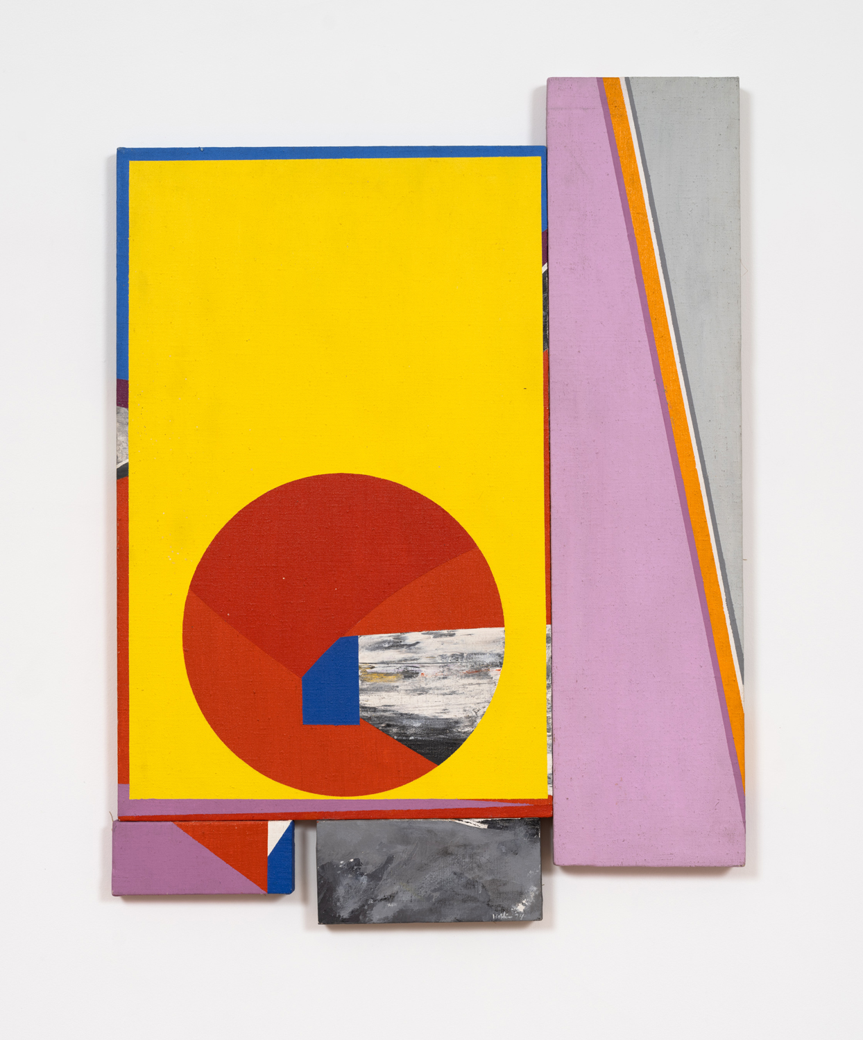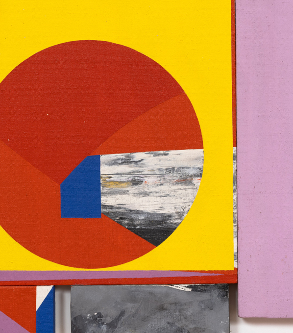 Kline and Pollock and de Kooning – these are among the names who inform Hopkins’ highly combinatory practice. To this list we might add Mondrian, whose sense of geometric abstraction lend Hopkins’ paintings their structuring force, and Matisse, who often inspired these works’ brilliant sense of color. With City Slant, 1974, the “fervid energy” of urban life becomes the subject of the work itself: washes of stone, marble, and cement grey intrude on the characteristic array of primary reds, blues, and yellows, and the arrangements of form begin to suggest a mechanical process we cannot quite grasp. Although the work transcends its influences, it remains willfully inscribed in them. At the time, the critic Roberta Smith wrote that, “once you start thinking about the parts of these paintings on their own, it’s obvious that Hopkins is merely combining other people’s styles without adding enough of himself, despite his color and his craftsmanship.” Yet what was once read as mere pastiche now appears prescient, a harbinger of post-conceptual painting practices, particularly that of Peter Halley, emergent in the second half of the 1980s. Early on, these works on view demonstrated the means and strategies by which painting could sustain itself, indeed convincingly address itself to the public, once the scaffolding of formalist modernism and its attendant discourses had been disassembled. The logic of collage, the practice of juxtaposition, and the construction of multiple, co-existent systems within a single work all provided Hopkins with passageways of escape from the totalizing impulse of the artists he admired, those who directly preceded him.