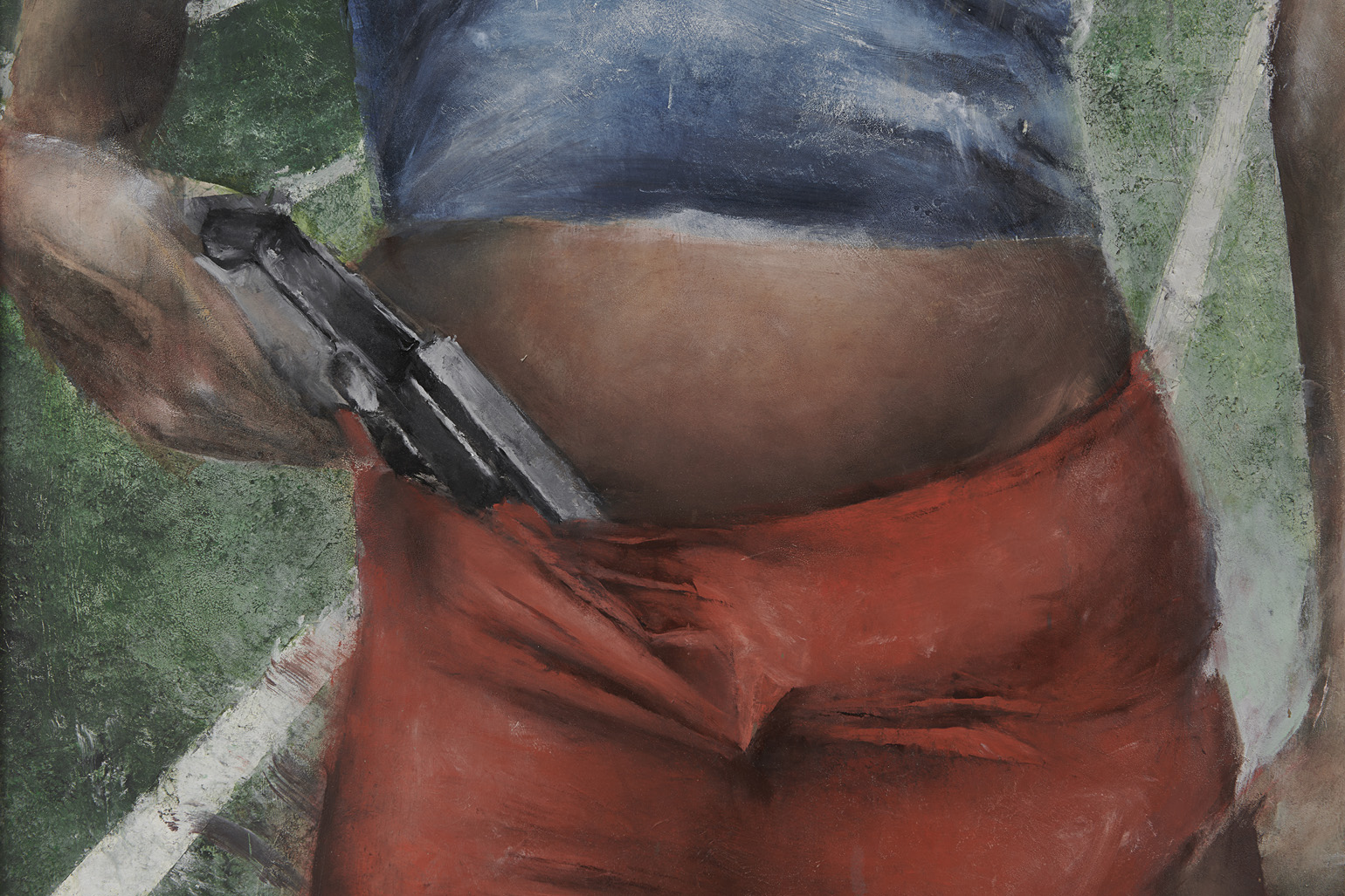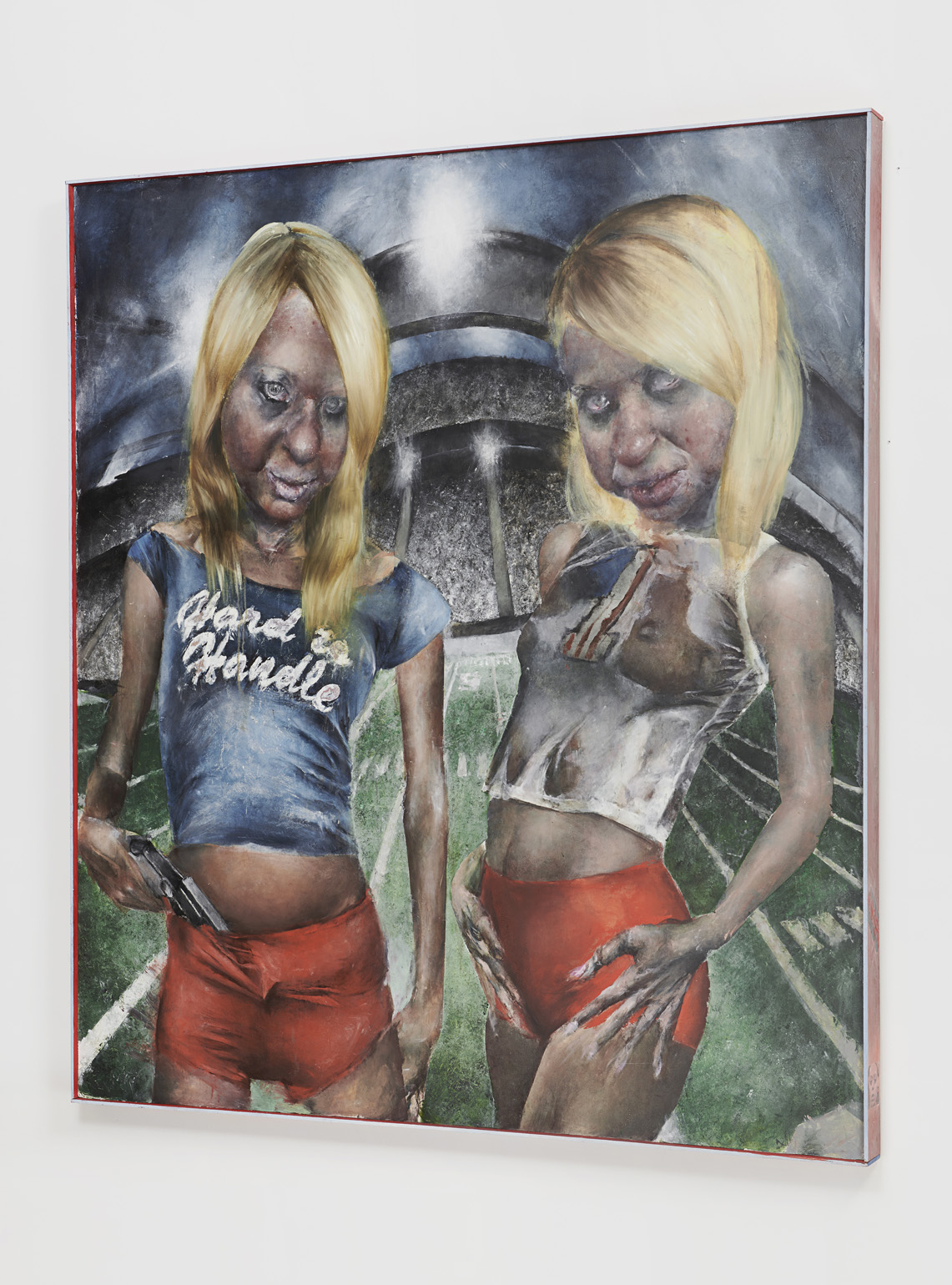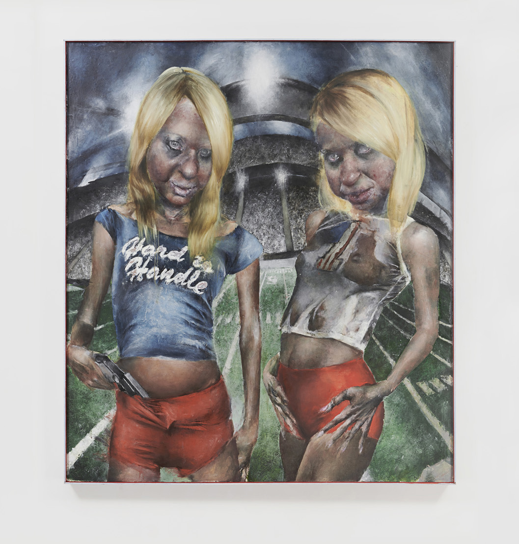 With Bad Girls Club, the artist’s first solo exhibition at Tara Downs, Mulligan retrieves us from the current malaise, the implacable mundanity of the Biden era, and returns us to the tomorrow once promised to us, the future that never quite arrived. Framing this regressive moment through the lens of young adulthood, Mulligan populates her works with latter-day demimondes, figures whom almost always arrive equipped with suburban signifiers or bridge-andtunnel accoutrements, regardless of whether they organically inhabit their roles or merely play at them. In one of the works on view, Blondes, 2023, two bobbling figures of Bratz-doll proportions, dressed in Hooters shorts and distressed graphic tees, pose in front of a kind of Futurist rendition of an American football stadium. Together, the twins announce the violent ebullience of the exhibition, and not only because one of them is stashing a handgun. As the exhibition’s eponymous bad girls, they in turn allude to the ones we once saw on TV, living and partying with one another, but mostly fighting. If this particular mid-2000’s reference appears somewhat foggy, therein lies the point. Lamenting the demise of monoculture, the sort of consensus required to render the artist’s pop references immediately legible, Mulligan’s strange paintings propose a return to the precise moment of mass media’s disintegration, as a form of hauntological survey, or, more directly, as a homecoming.