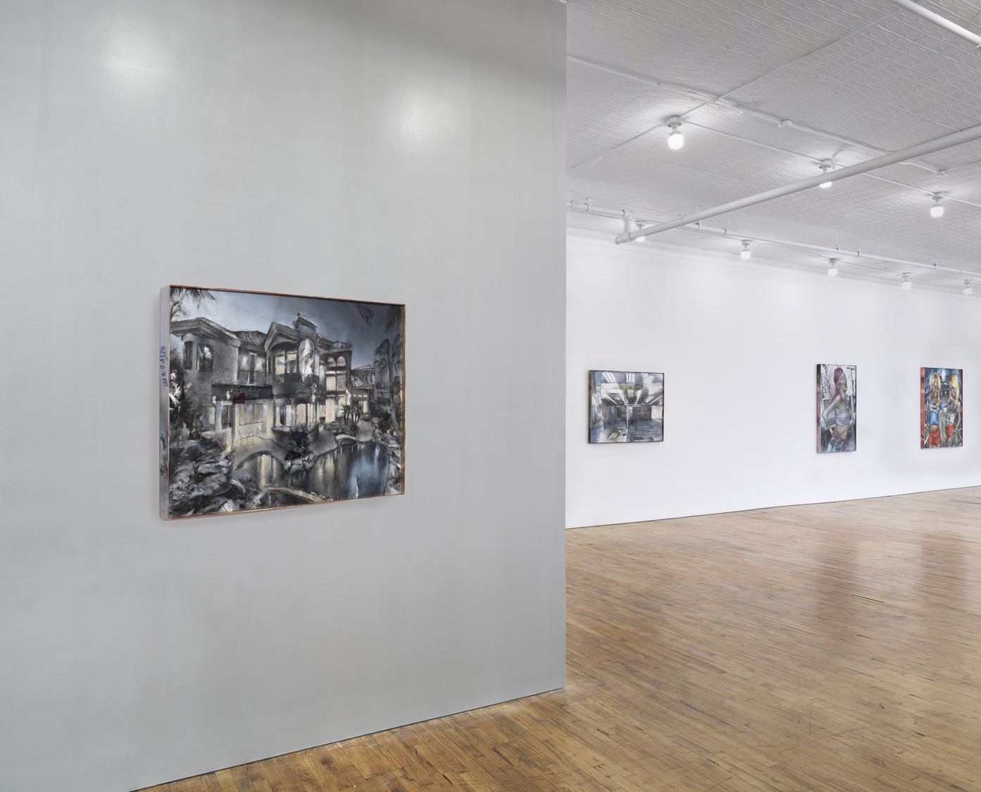 Hers are paintings that reanimate the undead and deploy them in service of a singularly lugubrious vision, a transgressive fairytale reimagining of the recent past, or, perhaps, a comically literal take on the often pejorative term “zombie figuration.” While Mulligan’s past paintings in oil depicted similar stock characters – models who bore some semblance to the second-rate stars of tabloid and reality TV – the disjunctive backdrops of her recent works have become more intrinsic to their meaning, more pointedly tethered to current events and their consequential debasements. In Hitchhiker, 2023, the livingdead subject of the painting bends and snaps against a grisaille landscape, an autumnal scene punctured by a yard sign advertising the anti-abortion services of ProLife Across America, legible between the crook of the main character’s posed body and bent arm. Elsewhere, Mulligan abandons her signature figures entirely, preferring instead to present vacant architectural scenes redolent of the establishing shots of long-running reality TV shows like Big Brother and, indeed, Bad Girls Club, where the improvised, real-time construction of the program’s narrative is mirrored by the ad-hoc staginess of the set.