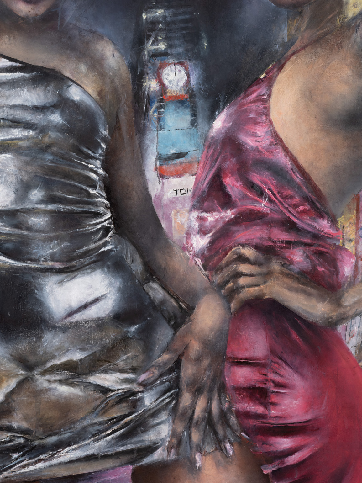 Catherine Mulligan, Clubbers 2, 2023 (detail). Oil on canvas with unique frame, 55 1/2 × 49 1/2 in / 141 × 125,7 cm