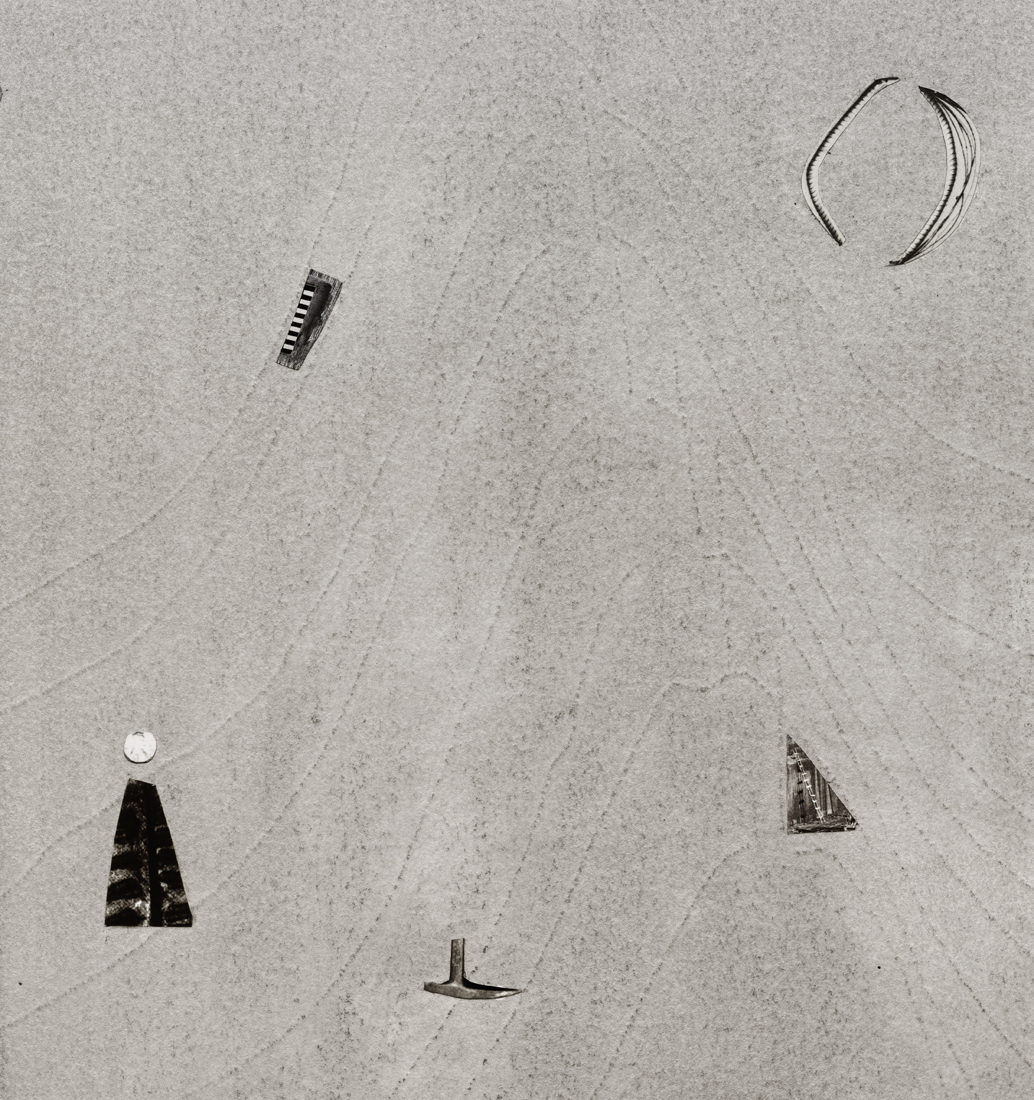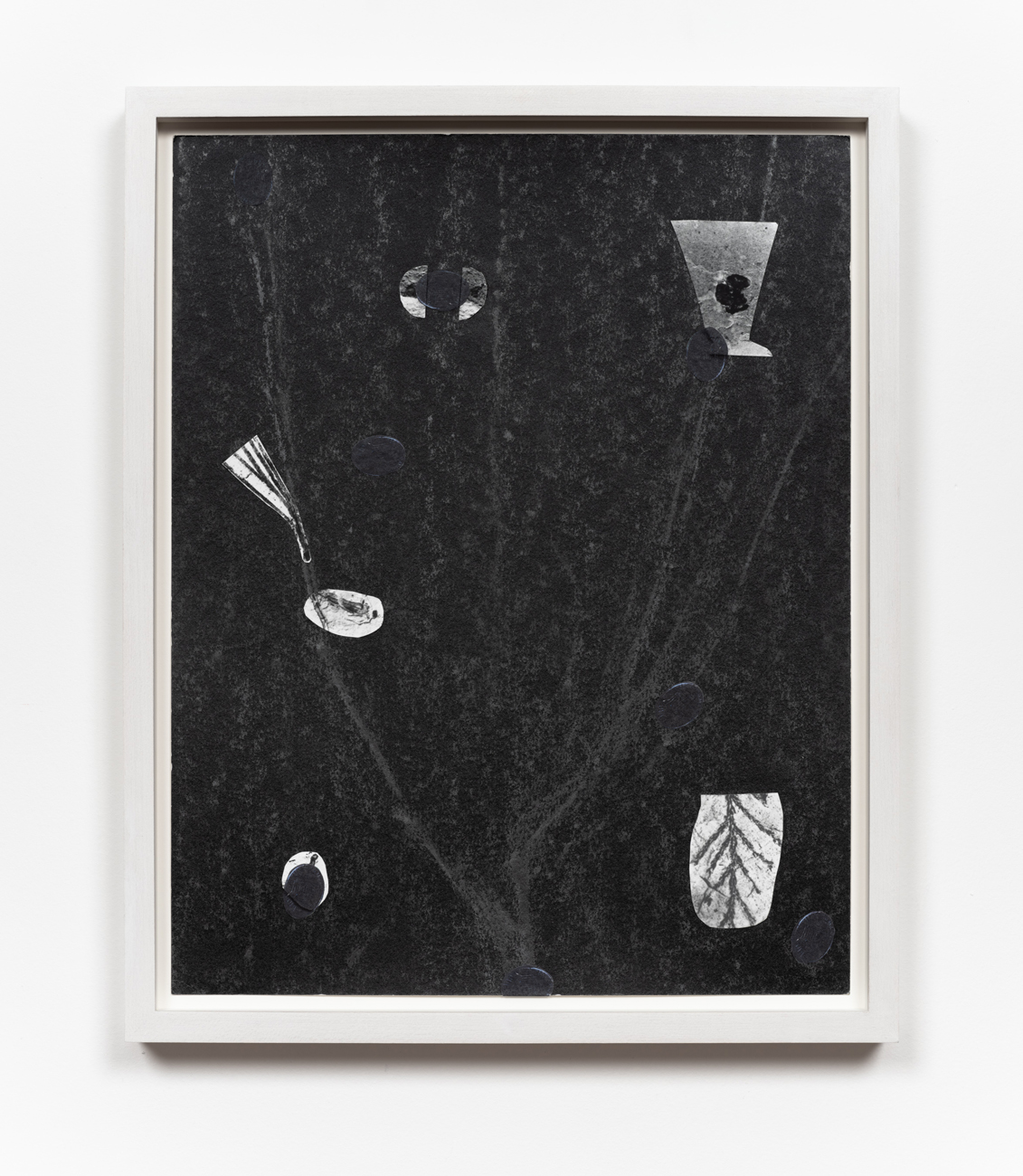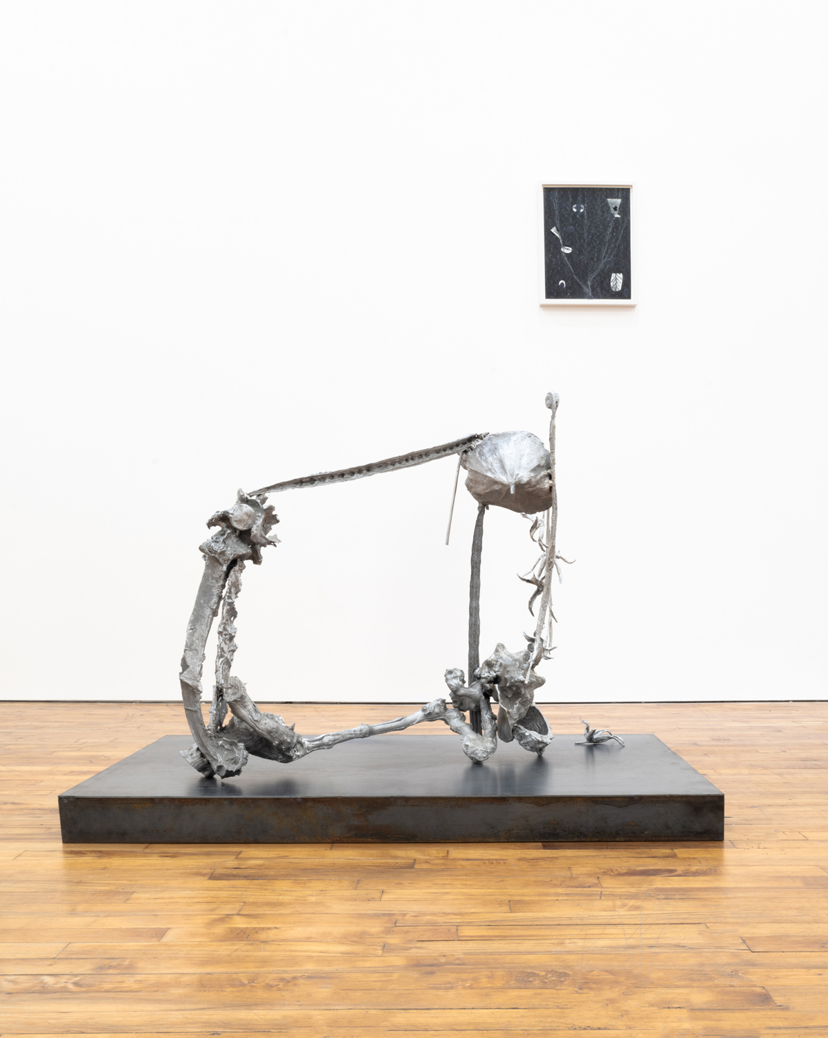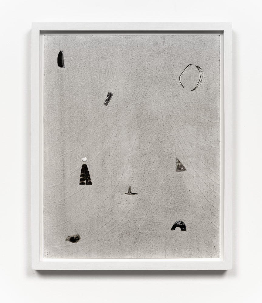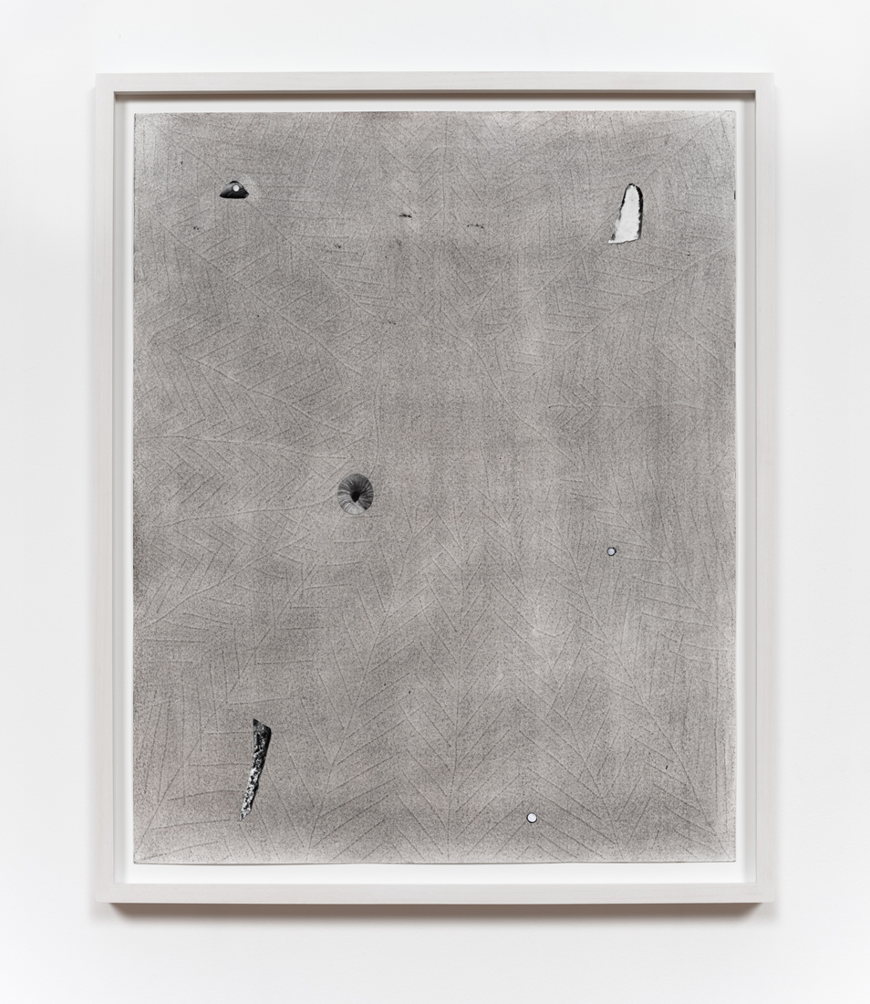 The works in this exhibition share a fossil-like alchemy. The creatures represented in these collages and castings were once in motion but have now come to a standstill. These pieces are testaments to the range of movements living things possess, but they also record the movements of the artists’ own muscles in their acts of creation. The result is less a freezeframe of arrested motion than it is a study in diachrony, multiple timescales operating simultaneously in an echo of natural processes. In Lee’s Fault Condition 5, for instance, we see found, decontextualized fragments of geological artifacts arranged on darkened paper that her hands have bent so many times the photographic emulsion has fallen off along the creases. Lee’s photographs push the medium beyond its physical limits to find resonance with the land itself and the ways it has been inhabited, transformed, and defaced over eons. The unified form of Rodriguez’s Flow, swarm, follow, sprint obliterates traditional biological taxonomy. The exact species of the plants and animals from which these fragments were cast are intentionally obscured by machined cuts. Teeth sockets, the striations of wood, the veins of a leaf, and interrupted lengths of bone are unified by welded joints. And something else entirely emerges that is lightweight and monochrome and wild and that embodies an incomprehensible sentience.