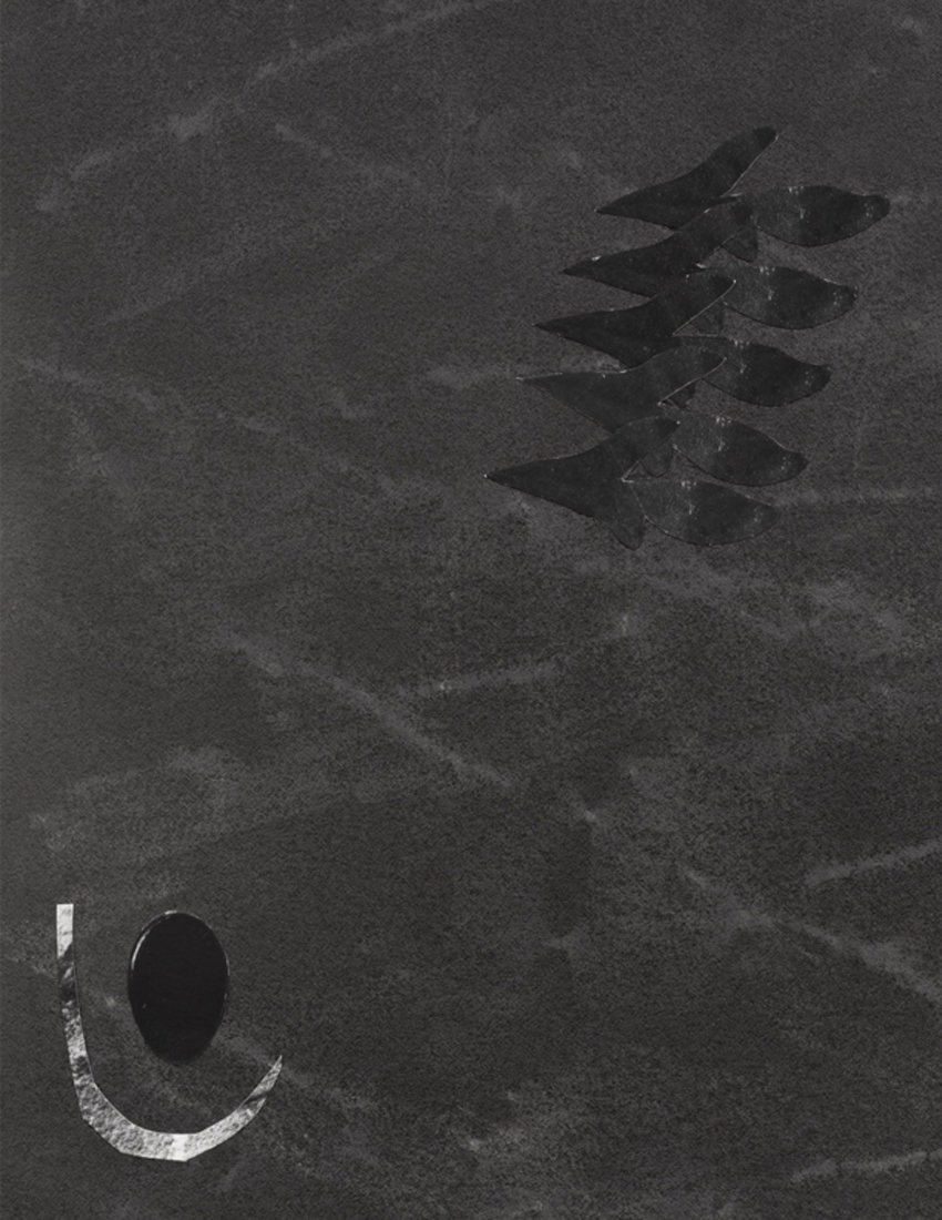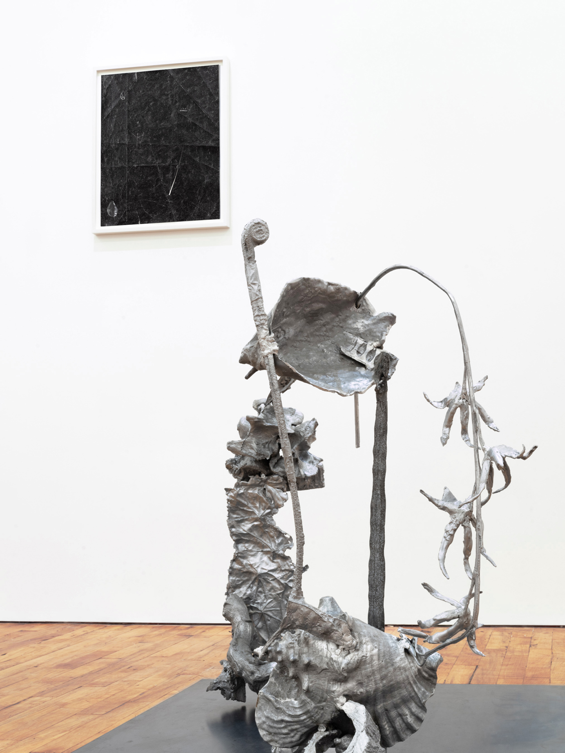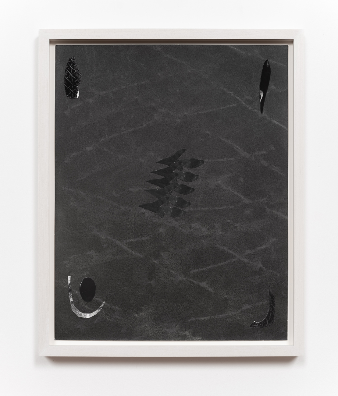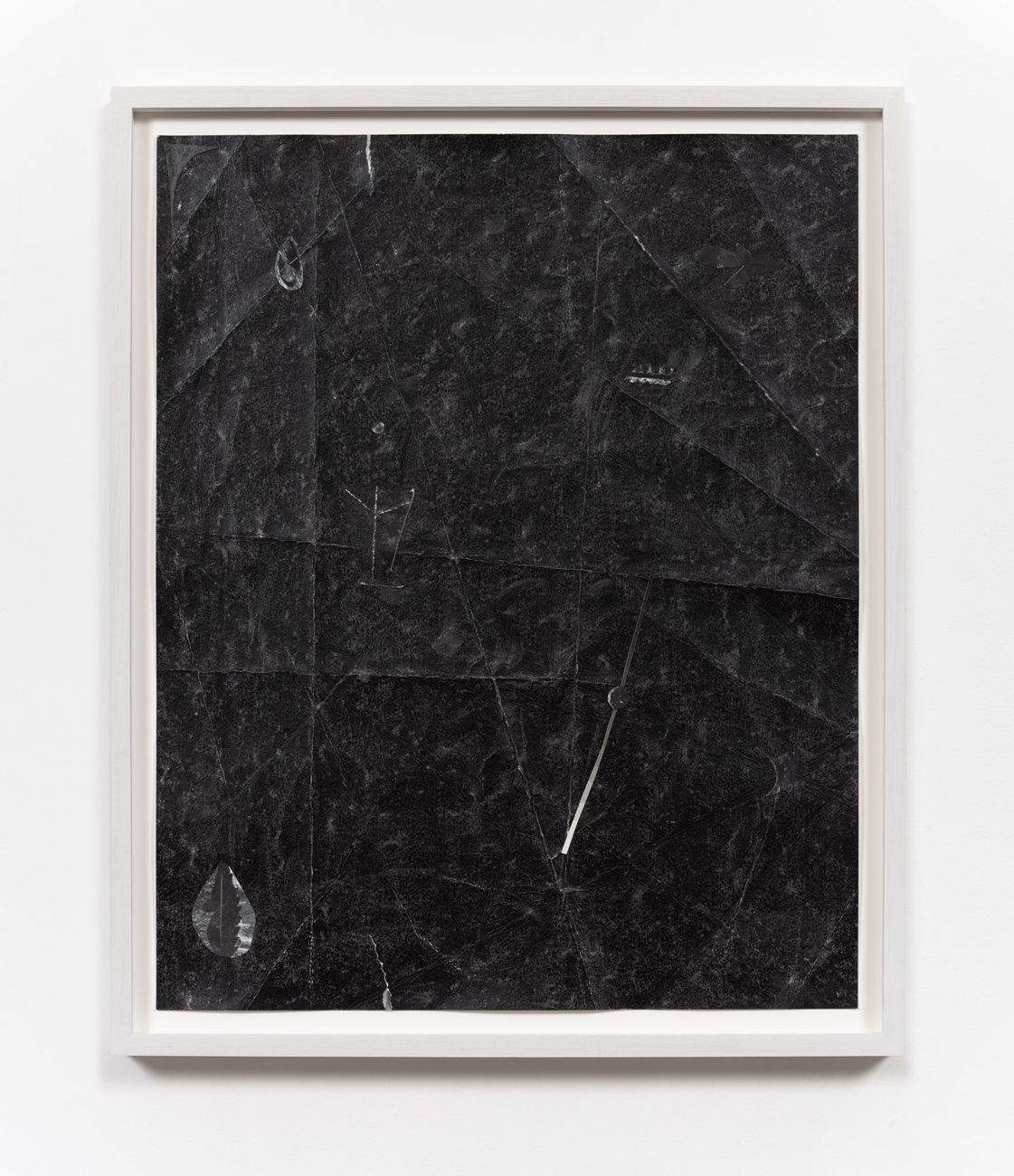 The works in this exhibition share a fossil-like alchemy. The creatures represented in these collages and castings were once in motion but have now come to a standstill. These pieces are testaments to the range of movements living things possess, but they also record the movements of the artists’ own muscles in their acts of creation. The result is less a freezeframe of arrested motion than it is a study in diachrony, multiple timescales operating simultaneously in an echo of natural processes. In Lee’s Fault Condition 5, for instance, we see found, decontextualized fragments of geological artifacts arranged on darkened paper that her hands have bent so many times the photographic emulsion has fallen off along the creases. Lee’s photographs push the medium beyond its physical limits to find resonance with the land itself and the ways it has been inhabited, transformed, and defaced over eons. The unified form of Rodriguez’s Flow, swarm, follow, sprint obliterates traditional biological taxonomy. The exact species of the plants and animals from which these fragments were cast are intentionally obscured by machined cuts. Teeth sockets, the striations of wood, the veins of a leaf, and interrupted lengths of bone are unified by welded joints. And something else entirely emerges that is lightweight and monochrome and wild and that embodies an incomprehensible sentience.