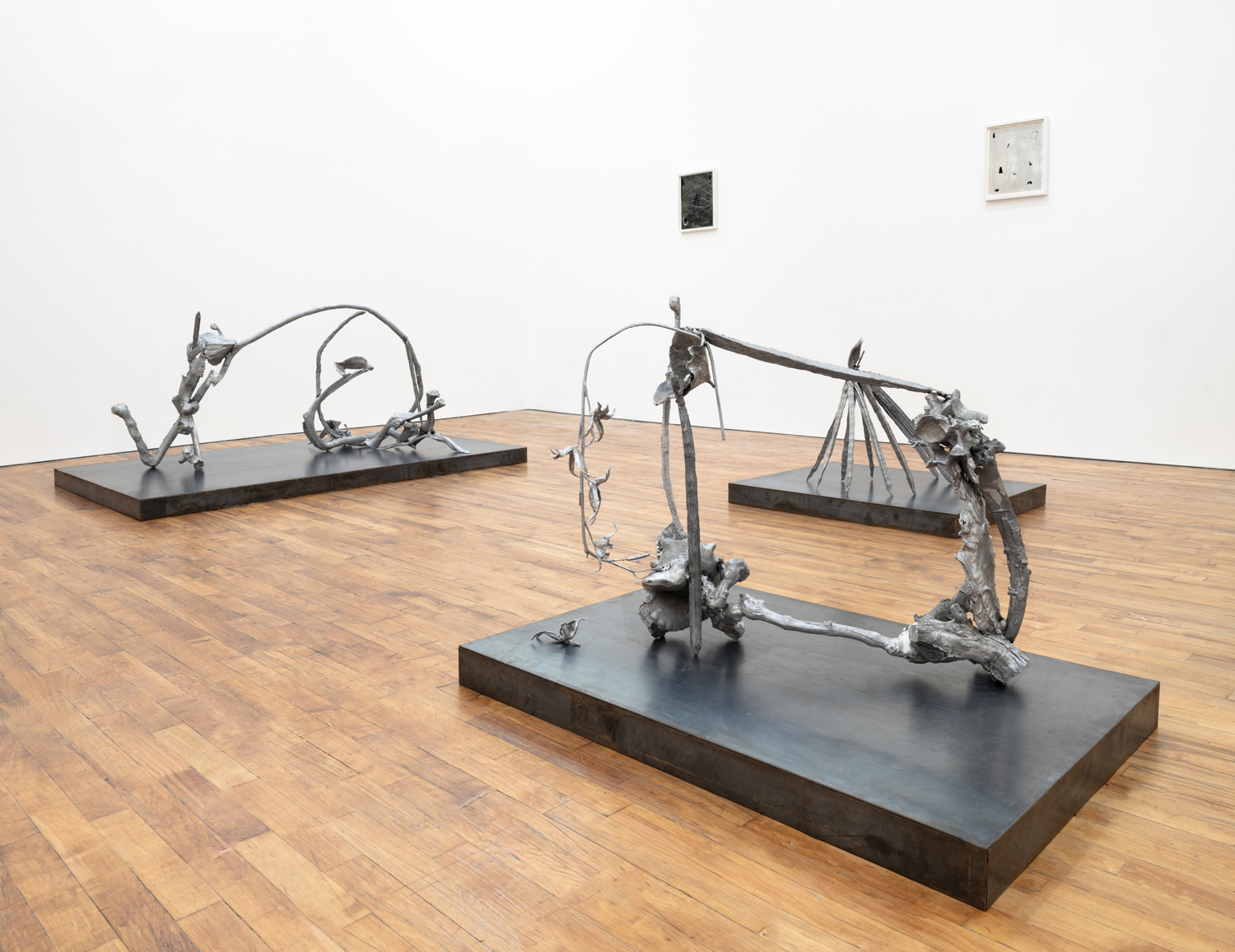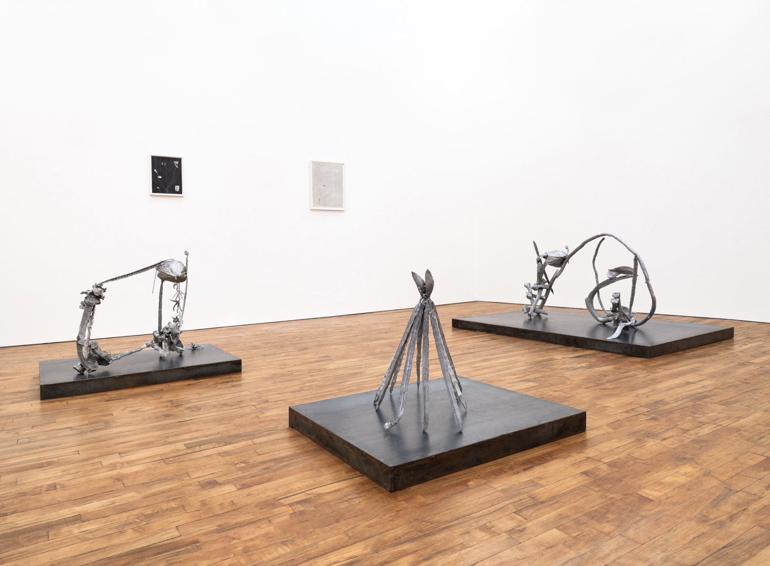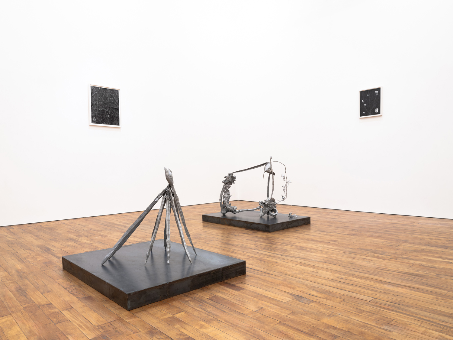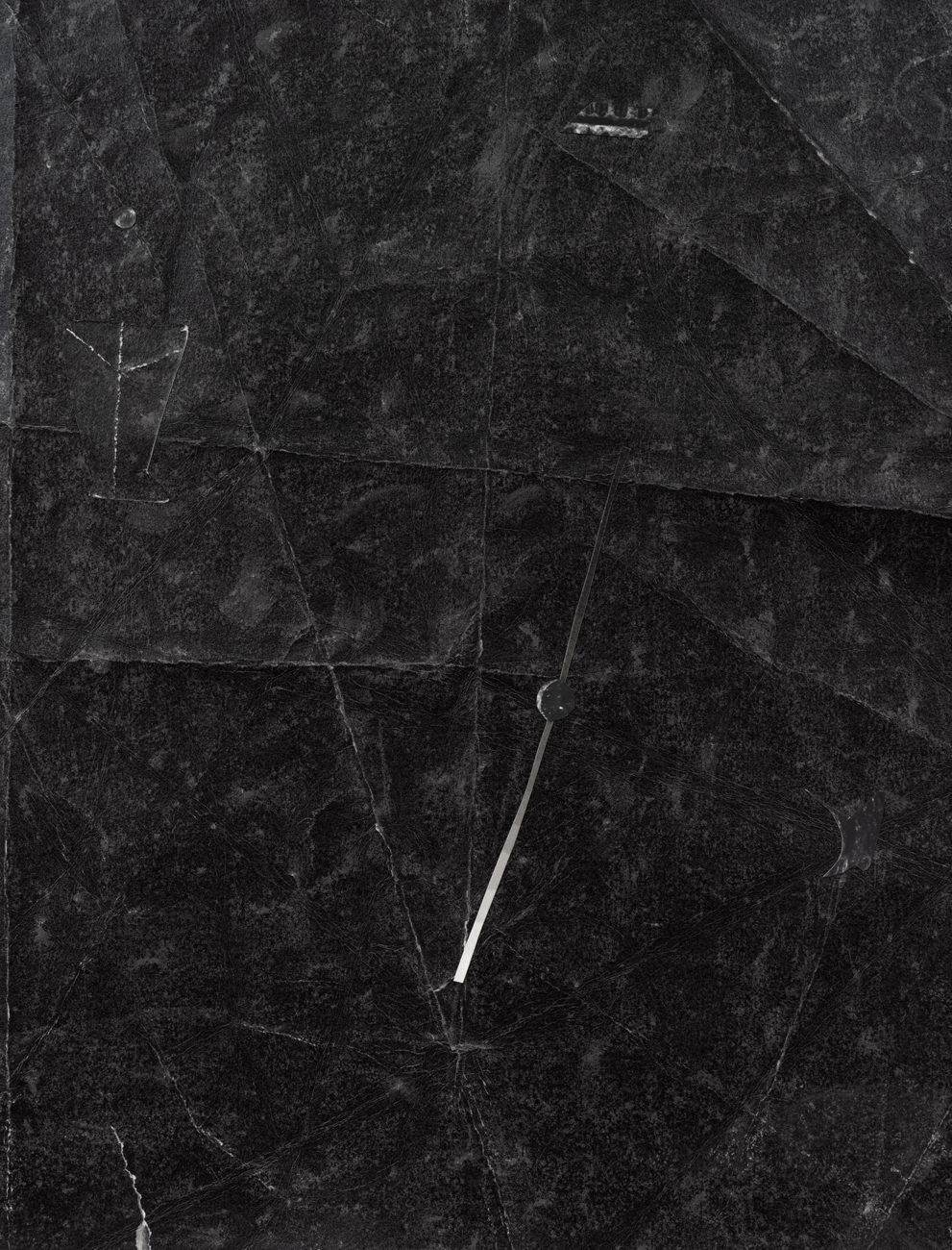 The works in this exhibition share a fossil-like alchemy. The creatures represented in these collages and castings were once in motion but have now come to a standstill. These pieces are testaments to the range of movements living things possess, but they also record the movements of the artists’ own muscles in their acts of creation. The result is less a freezeframe of arrested motion than it is a study in diachrony, multiple timescales operating simultaneously in an echo of natural processes. In Lee’s Fault Condition 5, for instance, we see found, decontextualized fragments of geological artifacts arranged on darkened paper that her hands have bent so many times the photographic emulsion has fallen off along the creases. Lee’s photographs push the medium beyond its physical limits to find resonance with the land itself and the ways it has been inhabited, transformed, and defaced over eons. The unified form of Rodriguez’s Flow, swarm, follow, sprint obliterates traditional biological taxonomy. The exact species of the plants and animals from which these fragments were cast are intentionally obscured by machined cuts. Teeth sockets, the striations of wood, the veins of a leaf, and interrupted lengths of bone are unified by welded joints. And something else entirely emerges that is lightweight and monochrome and wild and that embodies an incomprehensible sentience.