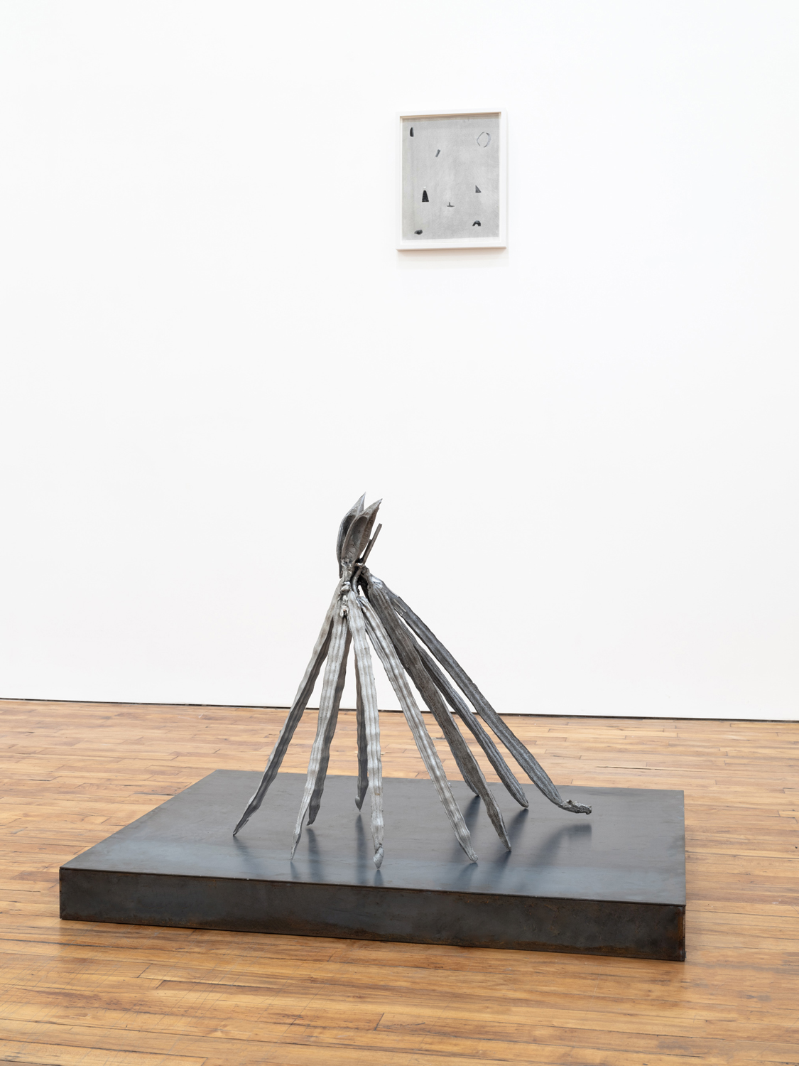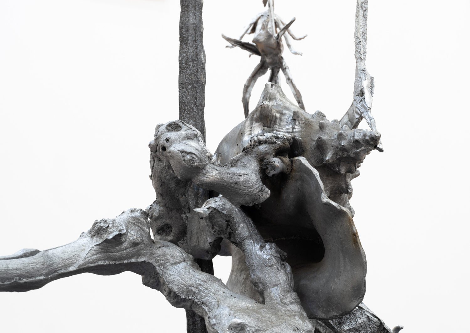Sarah Rodriguez’s sculptures are studies in an imagined, horizontal evolutionary process. In this alternative ecology, beings connect with each other and change in ways that do not produce “higher” forms of life but rather move into the future having sloughed off the baggage of hierarchy and purity so embedded in traditional evolutionary theory. These works are made of aluminum which, in the second half of the twentieth century, became known as a quintessential industrial metal. This was thanks in large part to the unprecedented expansion of aluminum plants for military applications during the world wars. Its rustproofness, lightness, and durability lent aluminum its high modernist connotations, but this obscures its more primordial meaning. Unlike steel, the ubiquitous metal of capitalism, or bronze, the classic alloy of art history, aluminum is elemental, an unreducible, fundamental substrate of the known universe. In this way it is closer to stone than it is to high-technological fabrications. It is one of the most common elements in existence though it has no known biological function. This is particularly interesting because the baseline materials from which Rodriguez casts her sculptures are all organic forms. Rodriguez is a meticulous and ethical collector, selecting seedpods, shells, bones, and other plant and animal remains for their texture, weight, and line quality. These materials come from the disparate landscapes of Hawai’i and New Mexico, brought together under the auspices of their aesthetic qualities rather than political or ecological boundaries. The sculptures that result have a reliquary quality; the original biological matter has been completely burned away in the casting process, but their forms continue to exist in an altered state.