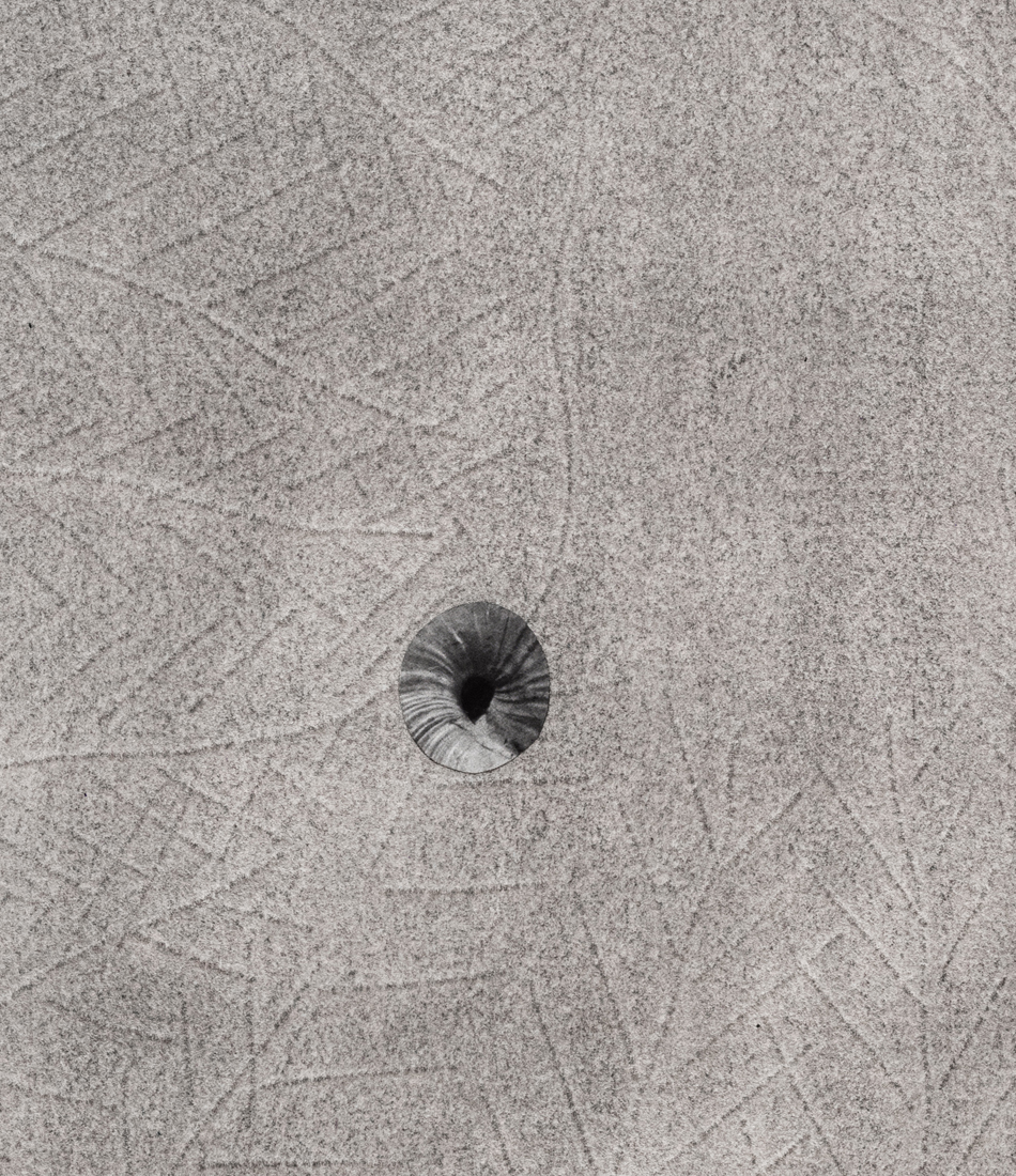 Through a range of physical gestures that include scanning and photocopying geology textbooks and field guides, cutting directly from them, applying both soft and hard pressure to the back of the paper to create lines in relief on its surface, gluing, bending, drawing, and erasing, Lee makes images that should be understood as single landscape photographs. But instead of representing actual, cartographically authorized places, these landscapes are meditations on the fleeting meaning of the land itself. They reach toward the aesthetics of fossils but do not mimic them. They call to mind topographic unevenness and marks upon the ground but do not add up to a functioning map. They strictly eschew horizon lines, further destabilizing traditional landscape photographic convention as well as our sense of scale. They are at once about the deep past, the tools humans use to touch and penetrate and measure the earth, and a possible deep future in which our own bodies have mineralized and become fossils themselves. You cannot extract positive identifications of the excerpted found photographs in these collages, nor can you itemize a definitive iconography. The logic of Enlightenment science and its aspirations to certainty are withheld. Instead, these photographs invite the viewer to find their balance amid spatial and temporal disorientation.