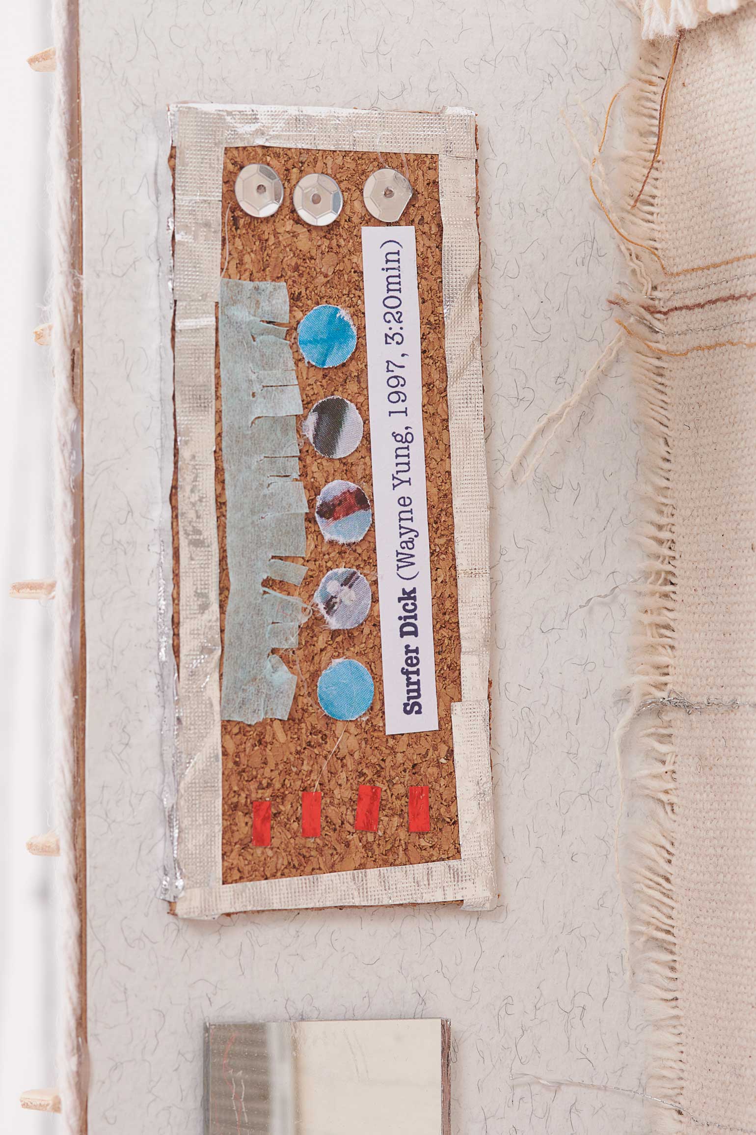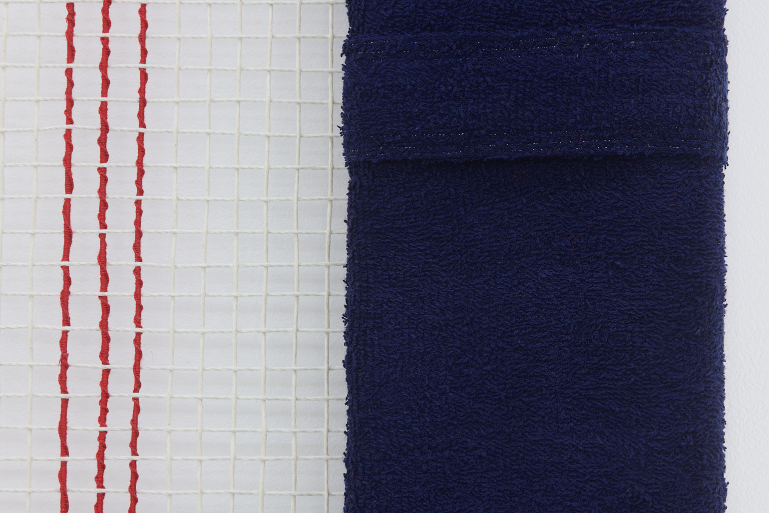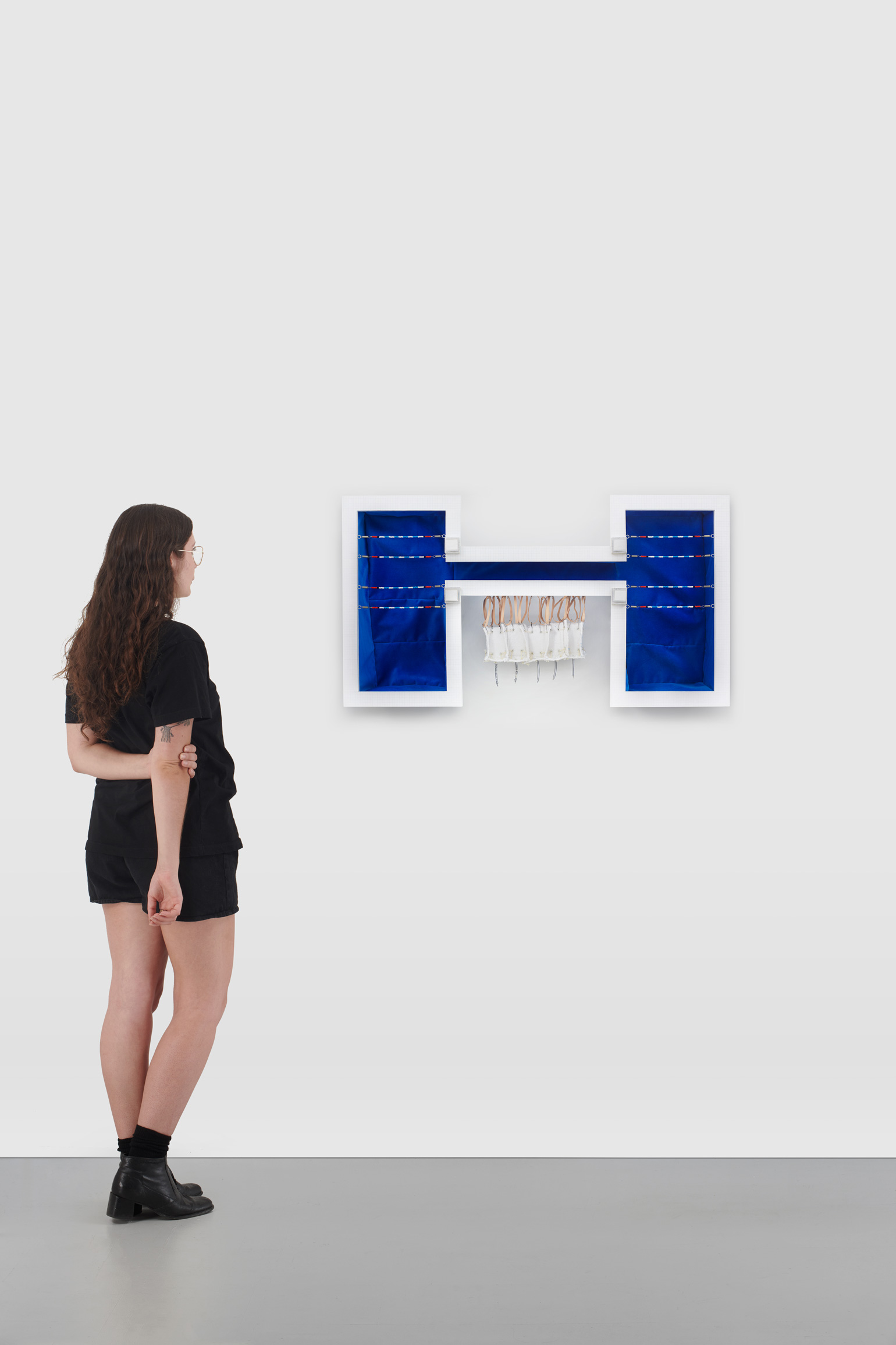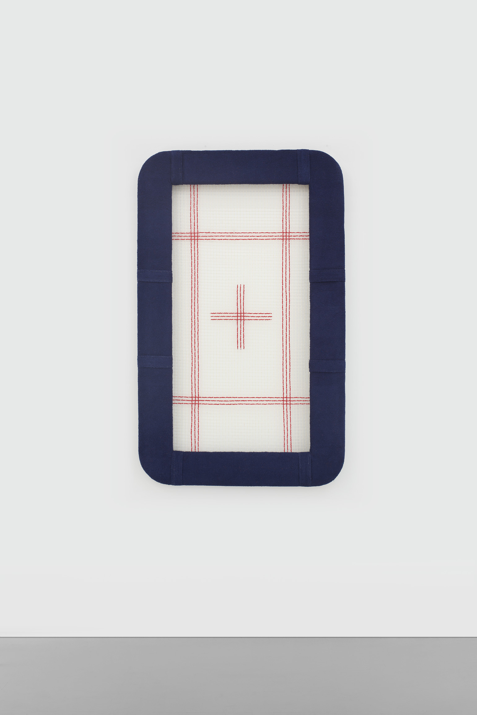Switching from front crawl to back, Watt casts his eyes toward the sky, the sun, the rain, through the aquatic centre’s concrete skylight. Skylight Banner (2021) is an accessorized fabric facsimile of the imposing brutalist ceiling affixed dramatically to the wall with four 8” iron nails. In a libidinal flush, one might say it has the energy of a switch—on one hand, sparkly and pert, and on the other, heavy, unwavering. “Here, the sky is so strange. It’s almost solid… as if it were protecting us from what’s behind,” utters John Malkovich’s character Port, in The Sheltering Sky (1990) while fucking his wife on the precipice of a cliff in the Maghreb—an expanse the pair can’t resist tunnelling further and further into, relinquishing all safeguards. Is the sky benevolent or merciless? Protective or oppressive?