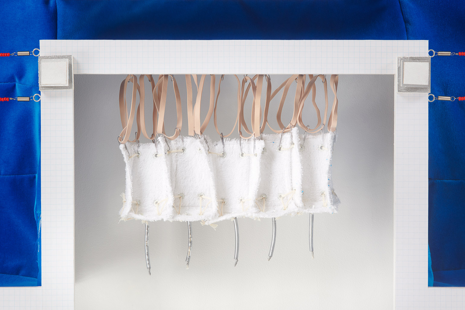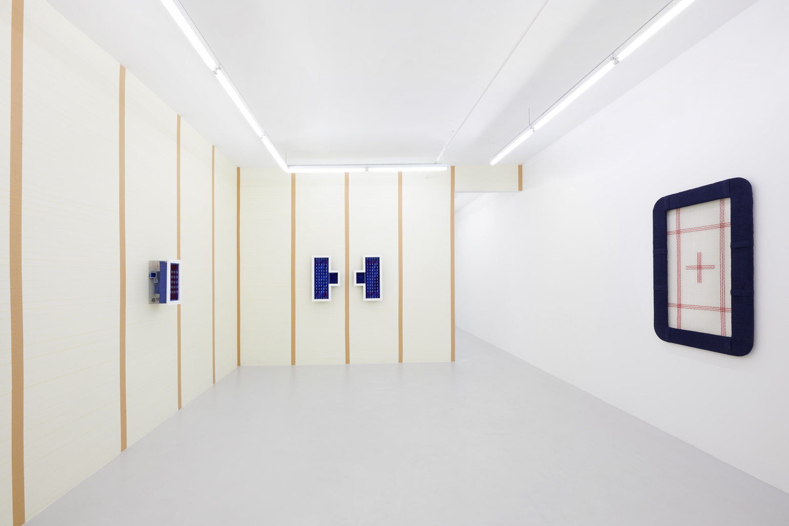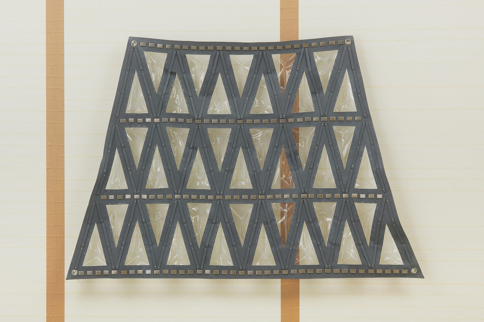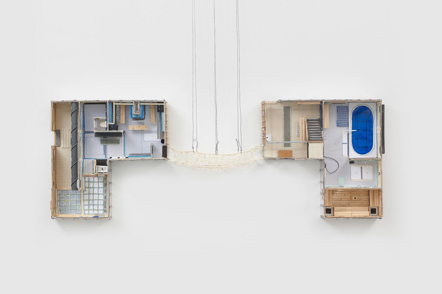 Switching from front crawl to back, Watt casts his eyes toward the sky, the sun, the rain, through the aquatic centre’s concrete skylight. Skylight Banner (2021) is an accessorized fabric facsimile of the imposing brutalist ceiling affixed dramatically to the wall with four 8” iron nails. In a libidinal flush, one might say it has the energy of a switch—on one hand, sparkly and pert, and on the other, heavy, unwavering. “Here, the sky is so strange. It’s almost solid… as if it were protecting us from what’s behind,” utters John Malkovich’s character Port, in The Sheltering Sky (1990) while fucking his wife on the precipice of a cliff in the Maghreb—an expanse the pair can’t resist tunnelling further and further into, relinquishing all safeguards. Is the sky benevolent or merciless? Protective or oppressive?