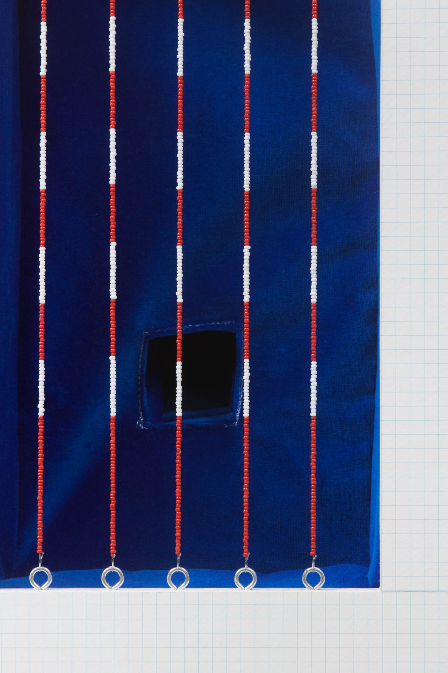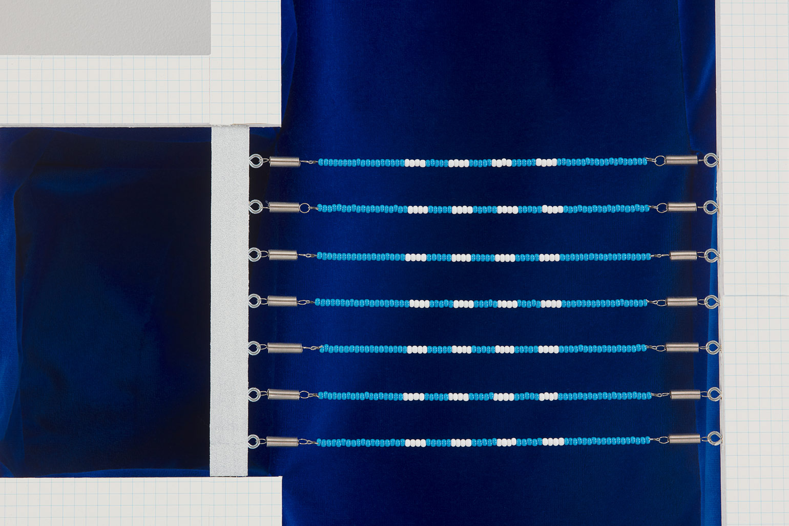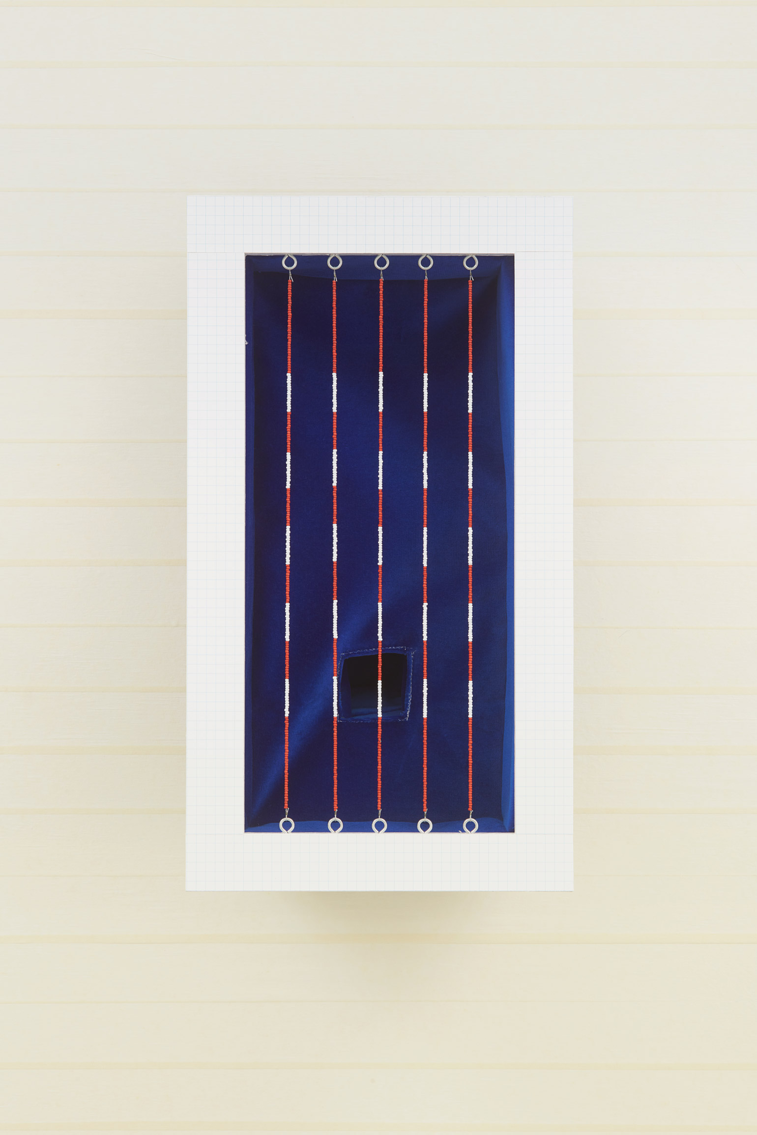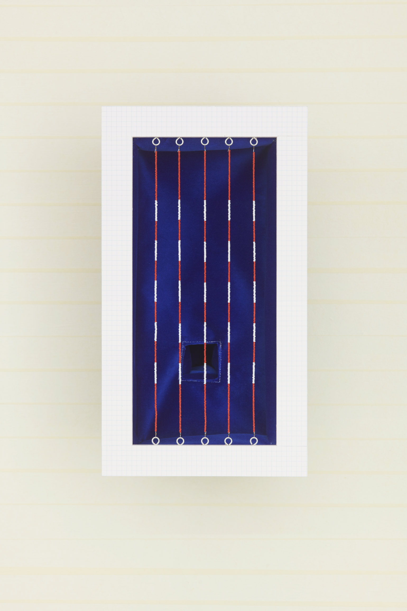 These heterogenous decisions around how in control the artist appears to be produce a bouquet of spindly arrows that allude to another question of control. Watt tells me he’s interested “in internal turmoil, epiphany, ecstasy, creative rushes experienced in ordered, manmade environments,” instantly invoking cruising, but more broadly highlighting a tension between excesses of feeling and spaces where expression is coded in specific ways—the swimming pool being one such example. This new body of work might be thought of, then, as an experiment in reproducing that tension for the viewer; a kind of edging. As Marianne Moore wrote: “The deepest feeling always shows itself in silence; / not in silence, but restraint.” The exquisite, sharply geometric pools, lined with blue velvet and replete with identical hand-beaded lane dividers are of course small replicas of life-sized swimming pools that are themselves simulations of natural swimming holes, with their dark floors, bottom feeders, weeds, and leeches. The architectural pool seeks to provide comparable refreshment, exercise, and leisure without danger, or as Watt put it: “total transparency and no consequence.” But even in the most iconographic works, to literally lean in towards the wall, behind the velvet, is to find something unsettling after all—infinitesimal, mostly out of focus signs of things amiss, or in progress, or forgotten, or tangled, or private.