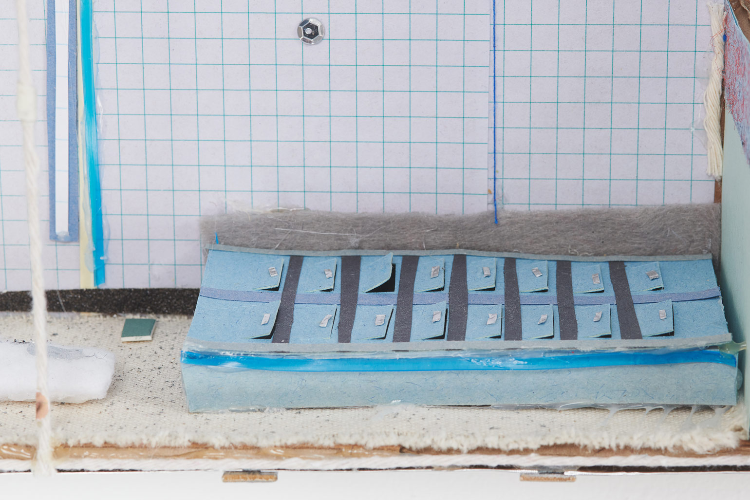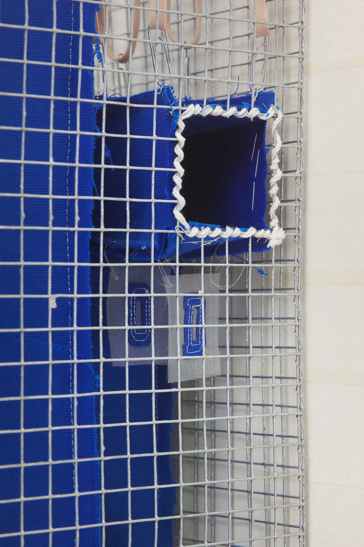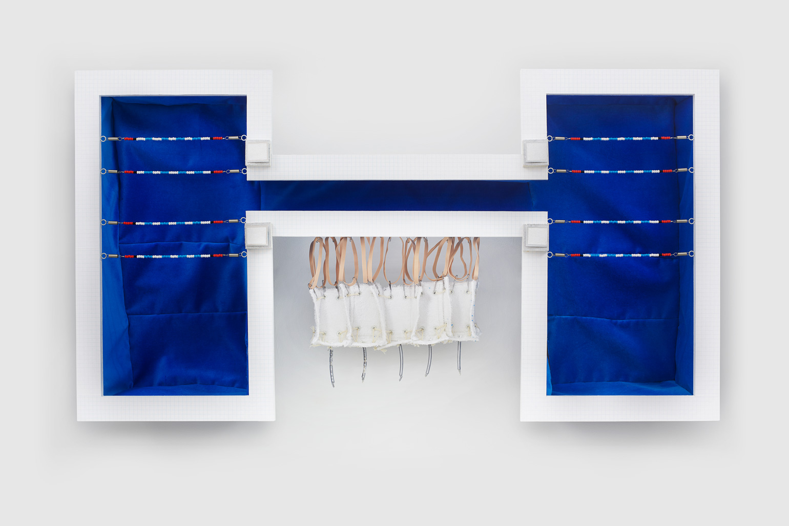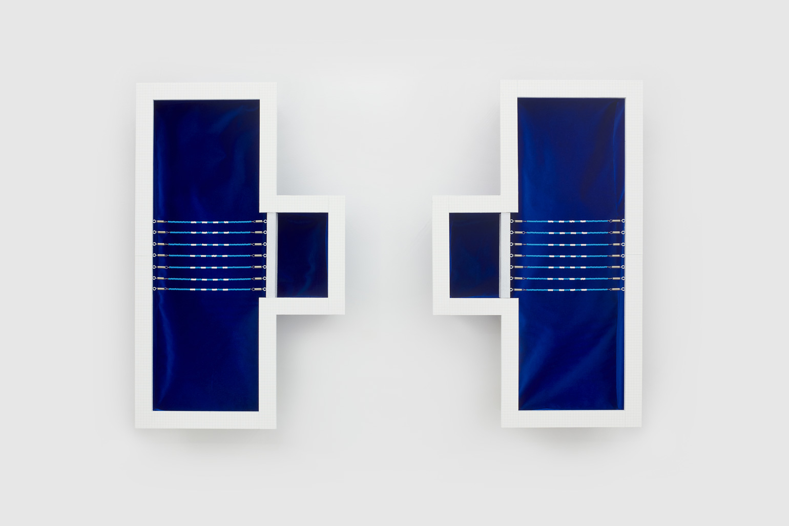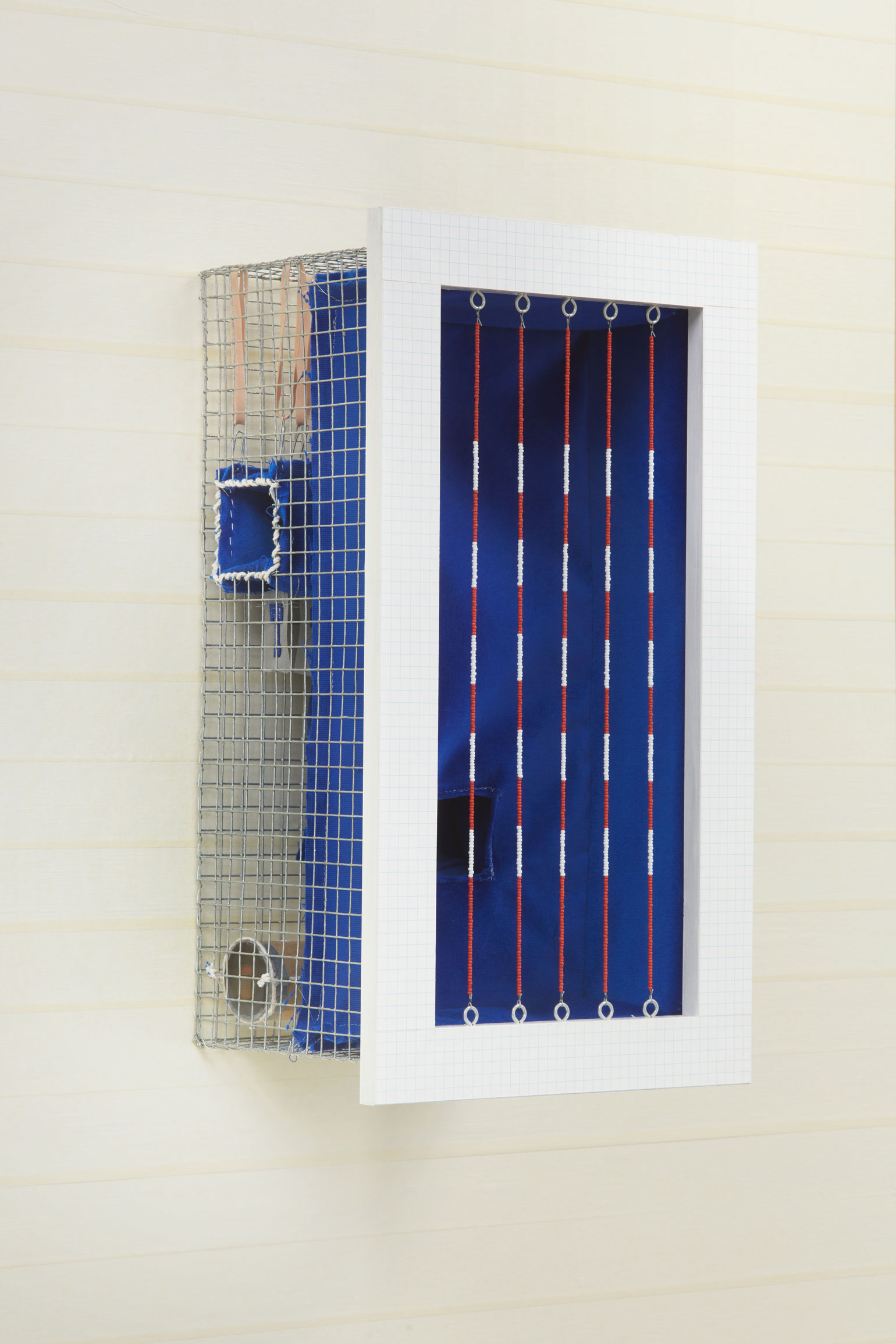 These heterogenous decisions around how in control the artist appears to be produce a bouquet of spindly arrows that allude to another question of control. Watt tells me he’s interested “in internal turmoil, epiphany, ecstasy, creative rushes experienced in ordered, manmade environments,” instantly invoking cruising, but more broadly highlighting a tension between excesses of feeling and spaces where expression is coded in specific ways—the swimming pool being one such example. This new body of work might be thought of, then, as an experiment in reproducing that tension for the viewer; a kind of edging. As Marianne Moore wrote: “The deepest feeling always shows itself in silence; / not in silence, but restraint.” The exquisite, sharply geometric pools, lined with blue velvet and replete with identical hand-beaded lane dividers are of course small replicas of life-sized swimming pools that are themselves simulations of natural swimming holes, with their dark floors, bottom feeders, weeds, and leeches. The architectural pool seeks to provide comparable refreshment, exercise, and leisure without danger, or as Watt put it: “total transparency and no consequence.” But even in the most iconographic works, to literally lean in towards the wall, behind the velvet, is to find something unsettling after all—infinitesimal, mostly out of focus signs of things amiss, or in progress, or forgotten, or tangled, or private.