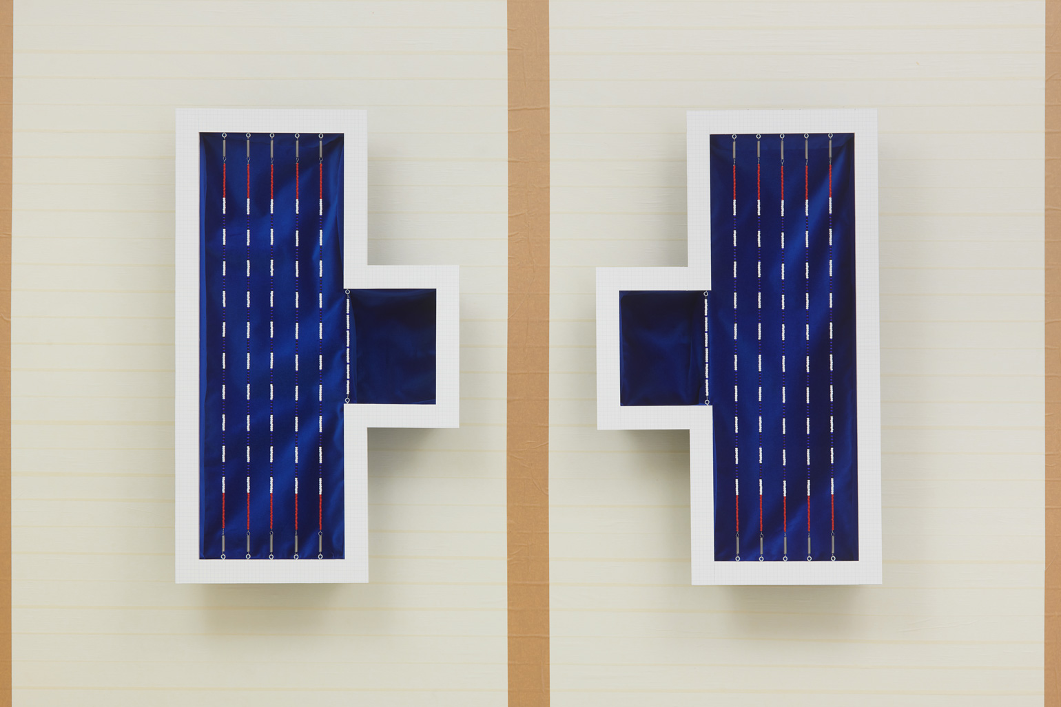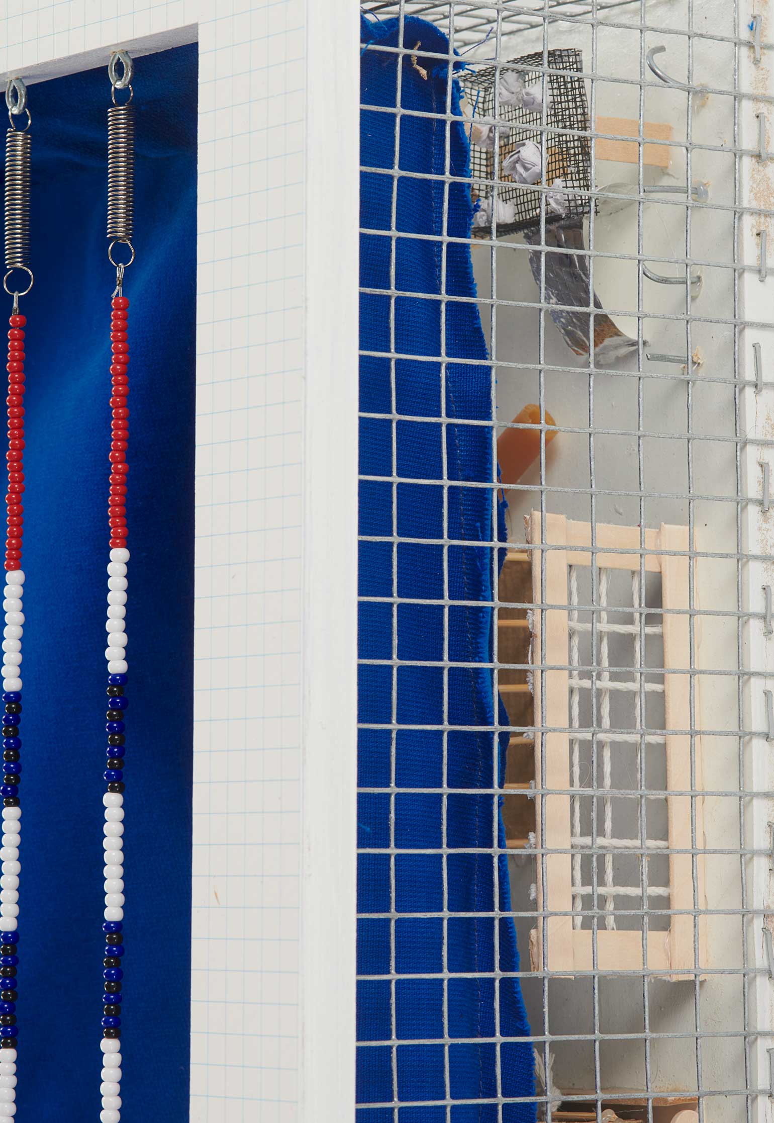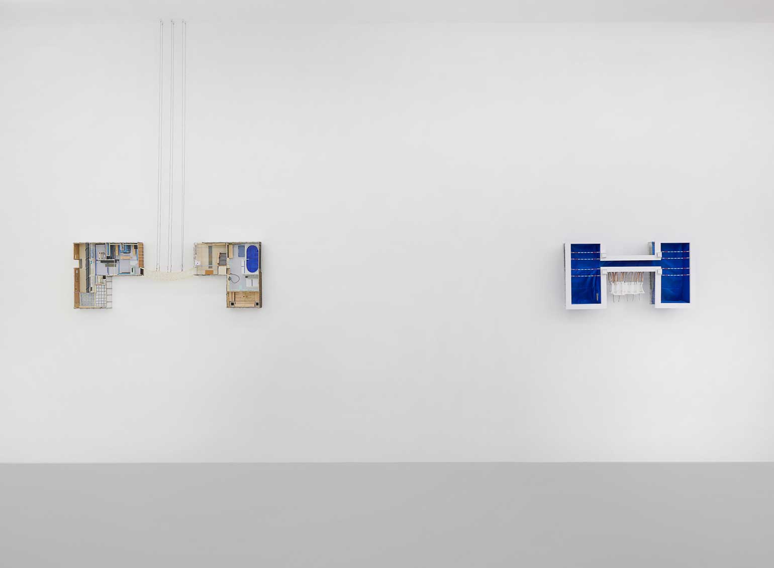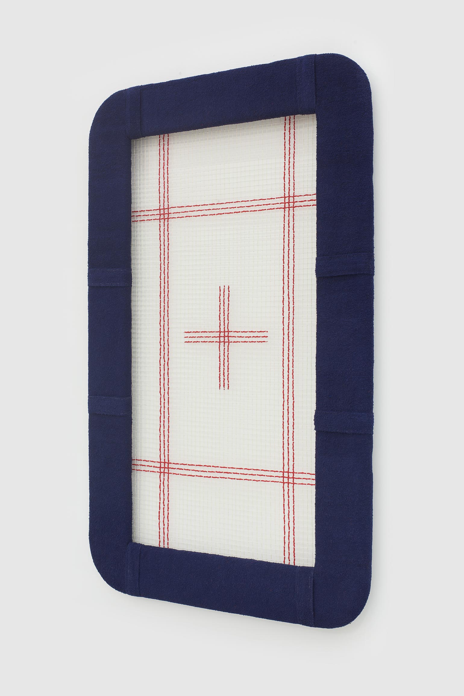These heterogenous decisions around how in control the artist appears to be produce a bouquet of spindly arrows that allude to another question of control. Watt tells me he’s interested “in internal turmoil, epiphany, ecstasy, creative rushes experienced in ordered, manmade environments,” instantly invoking cruising, but more broadly highlighting a tension between excesses of feeling and spaces where expression is coded in specific ways—the swimming pool being one such example. This new body of work might be thought of, then, as an experiment in reproducing that tension for the viewer; a kind of edging. As Marianne Moore wrote: “The deepest feeling always shows itself in silence; / not in silence, but restraint.” The exquisite, sharply geometric pools, lined with blue velvet and replete with identical hand-beaded lane dividers are of course small replicas of life-sized swimming pools that are themselves simulations of natural swimming holes, with their dark floors, bottom feeders, weeds, and leeches. The architectural pool seeks to provide comparable refreshment, exercise, and leisure without danger, or as Watt put it: “total transparency and no consequence.” But even in the most iconographic works, to literally lean in towards the wall, behind the velvet, is to find something unsettling after all—infinitesimal, mostly out of focus signs of things amiss, or in progress, or forgotten, or tangled, or private.
