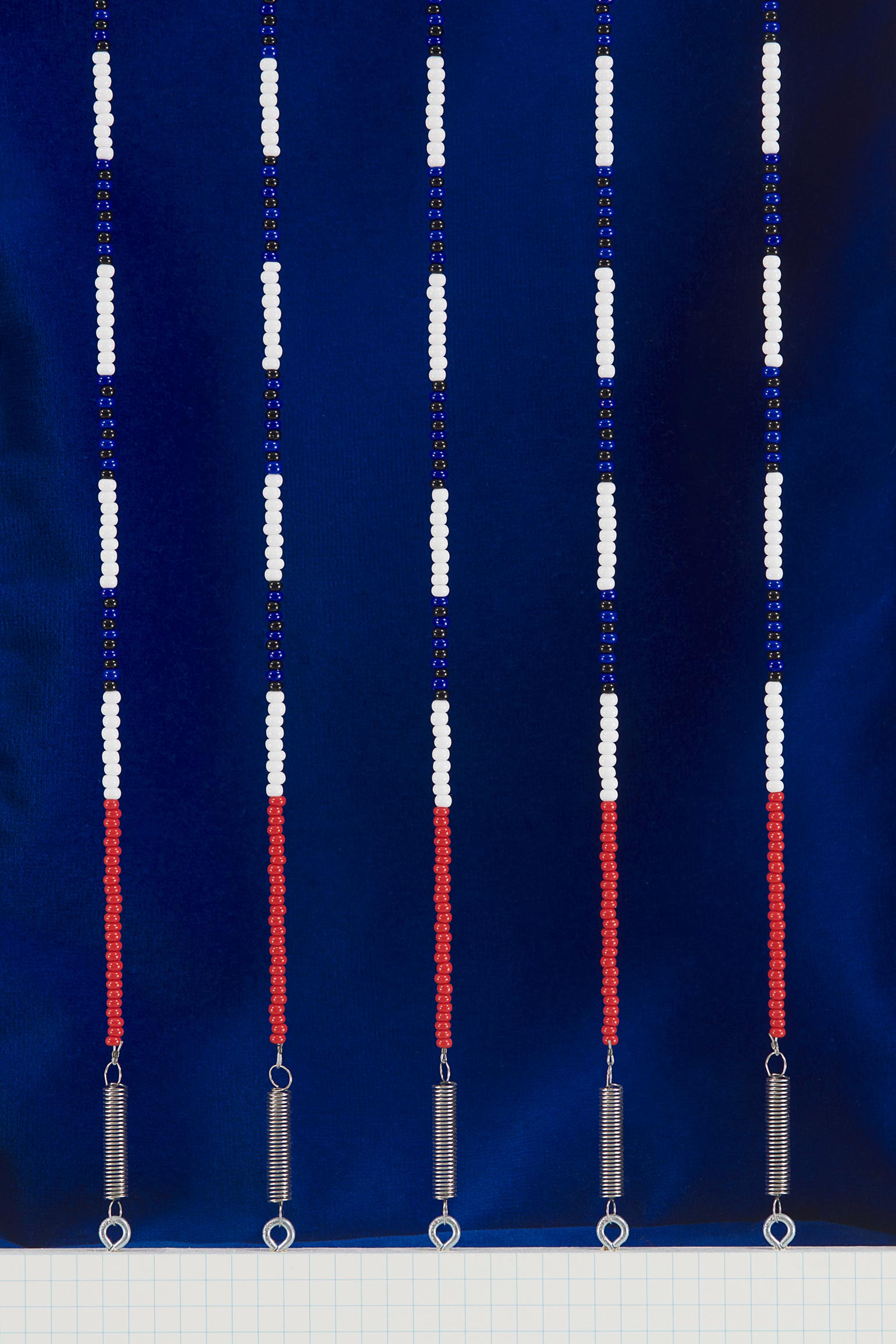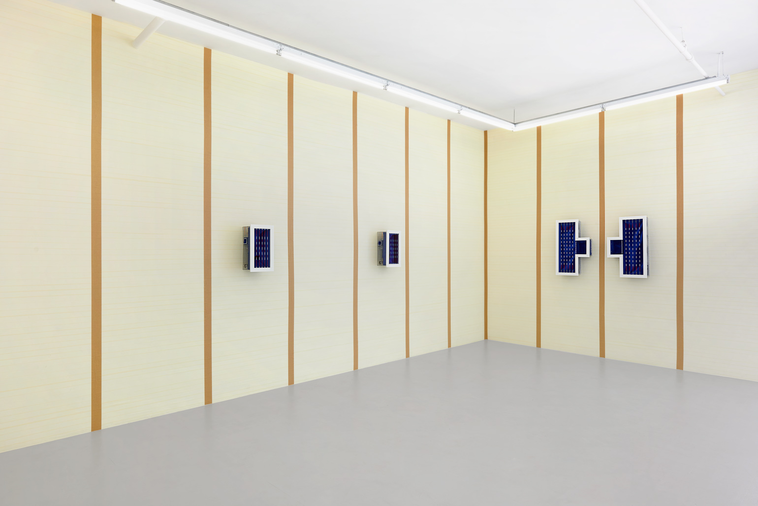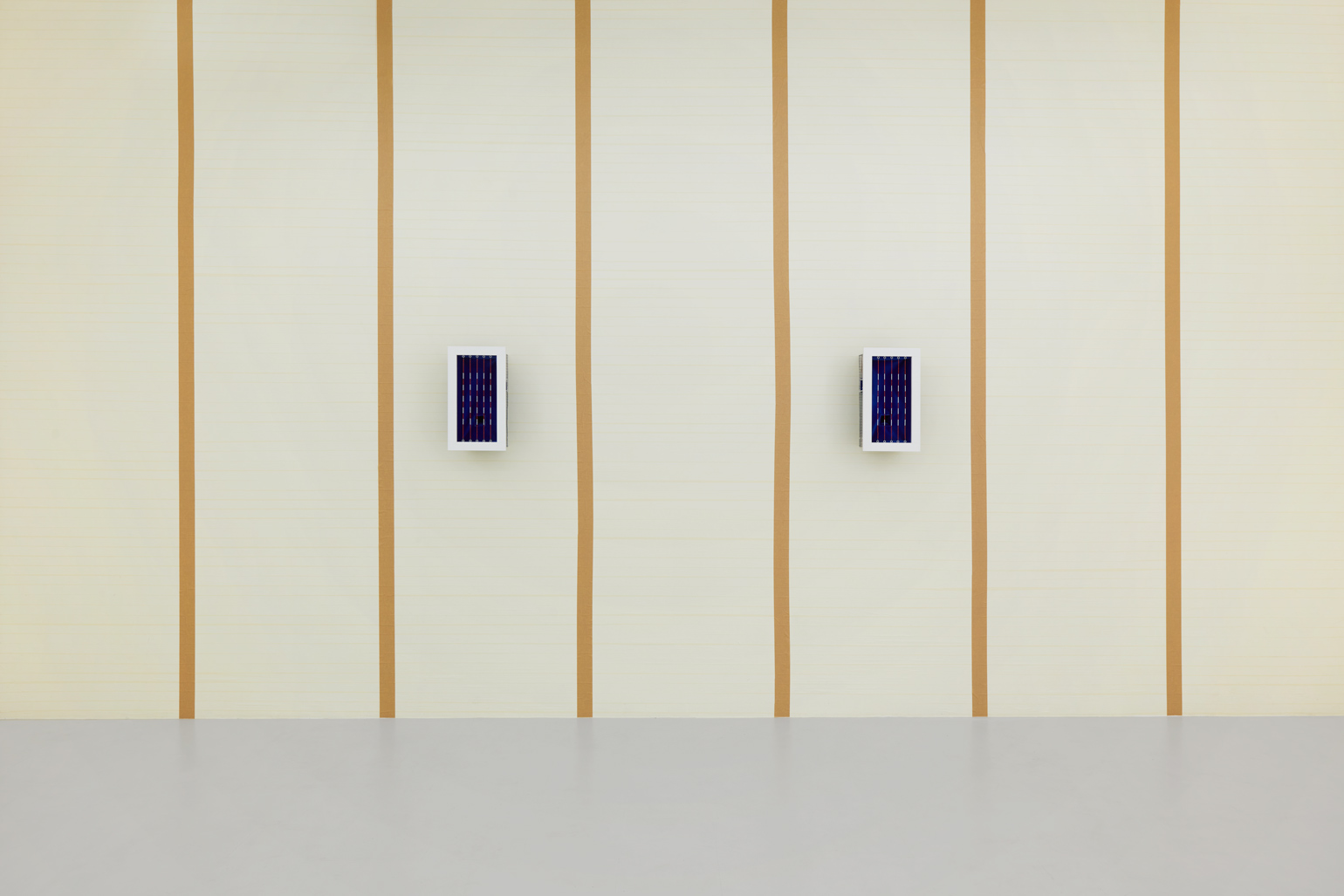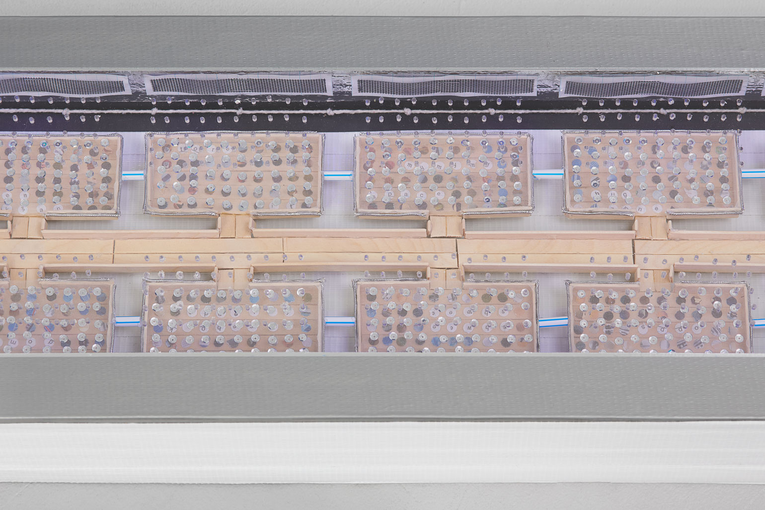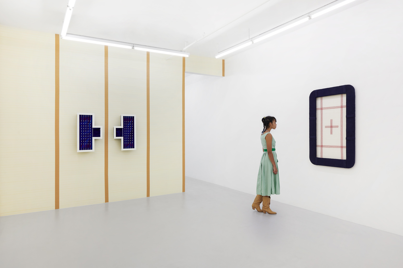 These heterogenous decisions around how in control the artist appears to be produce a bouquet of spindly arrows that allude to another question of control. Watt tells me he’s interested “in internal turmoil, epiphany, ecstasy, creative rushes experienced in ordered, manmade environments,” instantly invoking cruising, but more broadly highlighting a tension between excesses of feeling and spaces where expression is coded in specific ways—the swimming pool being one such example. This new body of work might be thought of, then, as an experiment in reproducing that tension for the viewer; a kind of edging. As Marianne Moore wrote: “The deepest feeling always shows itself in silence; / not in silence, but restraint.” The exquisite, sharply geometric pools, lined with blue velvet and replete with identical hand-beaded lane dividers are of course small replicas of life-sized swimming pools that are themselves simulations of natural swimming holes, with their dark floors, bottom feeders, weeds, and leeches. The architectural pool seeks to provide comparable refreshment, exercise, and leisure without danger, or as Watt put it: “total transparency and no consequence.” But even in the most iconographic works, to literally lean in towards the wall, behind the velvet, is to find something unsettling after all—infinitesimal, mostly out of focus signs of things amiss, or in progress, or forgotten, or tangled, or private.