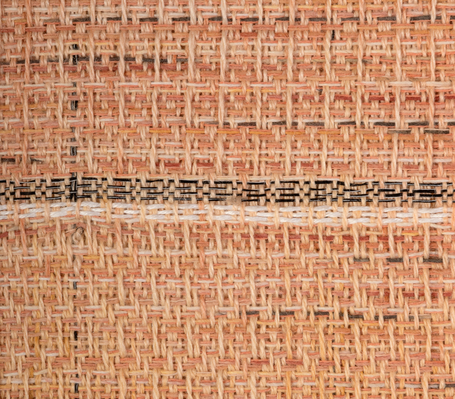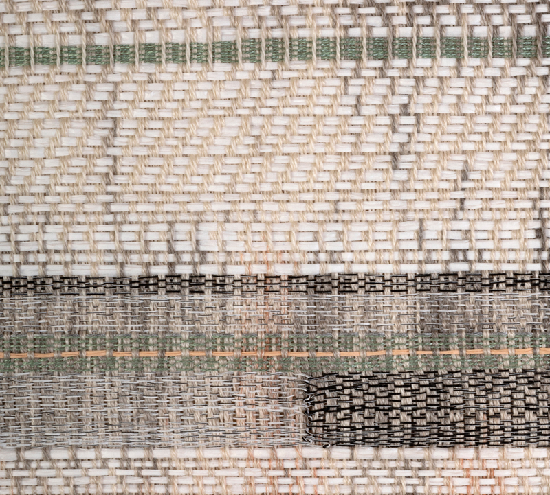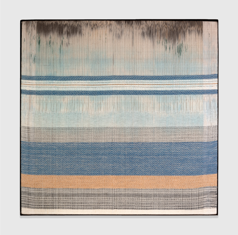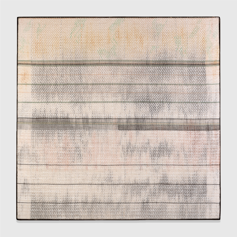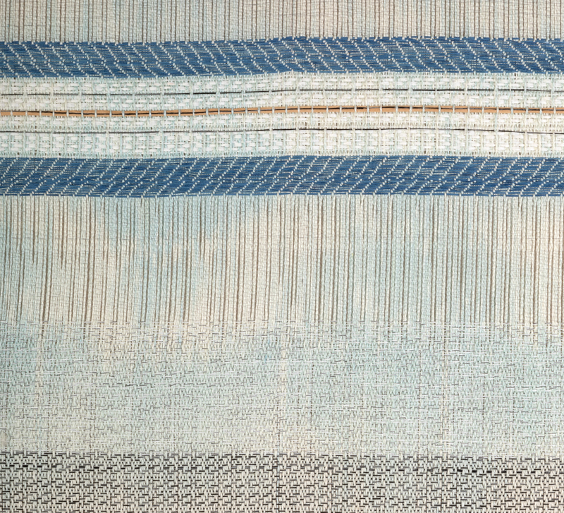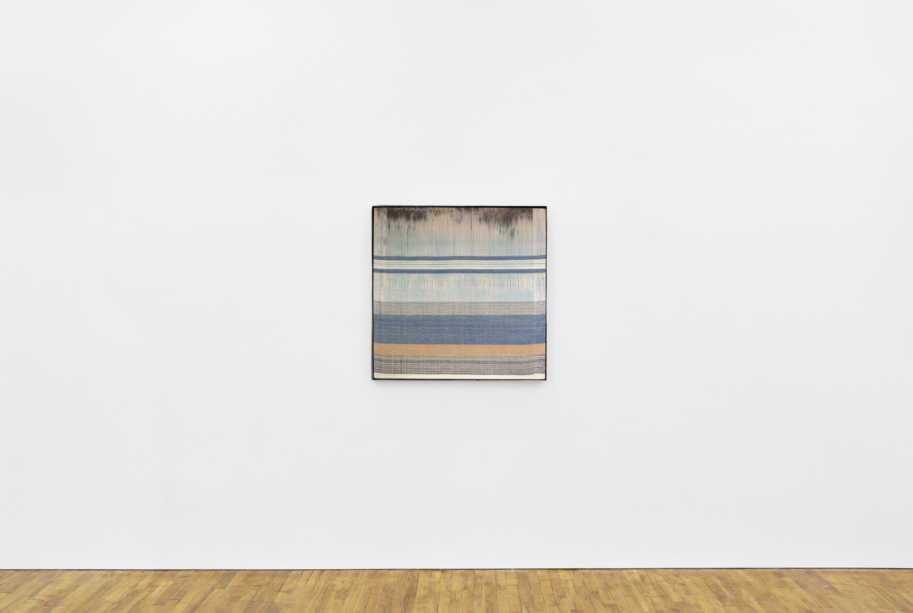 The language built into the process of weaving, the warp and weft as the basis of a fixed formal system, also calls attention to the materiality of the medium, a concept pioneered at the Bauhaus and notably in Anni Albers’ writing. In Albers’ celebrated 1957 essay, “The Pliable Plane,” she writes about the ways textiles imbue our surrounding environment with both spatial and pictorial information and have the potential to partition and thus shape interior spaces in novel ways. In Hohimer’s work, this concept could be applied to a kind of autotelic mapping, where the horizon line serves as a guide for sequences and formal decisions.