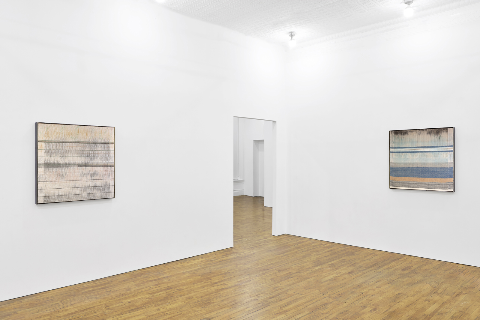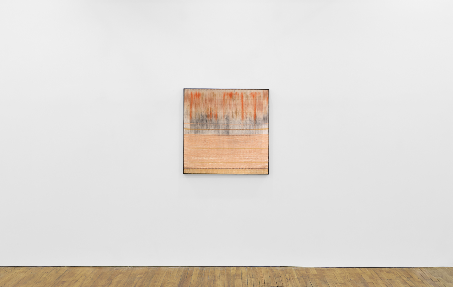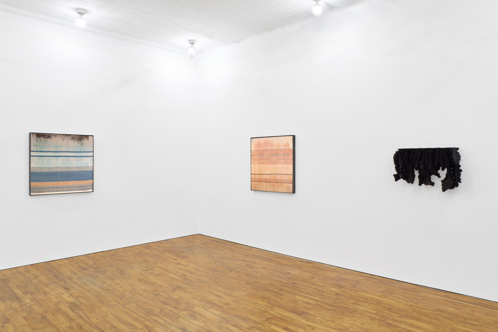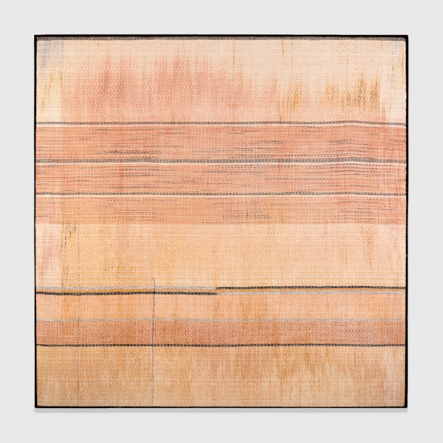 The method by which these works are produced involves the artist entering a nearly hallucinatory state, relinquishing conscious control and allowing memories and emotions to permeate the work. Hohimer winds her warp with thread spun from cotton grown in West Texas and dyed with natural materials, including clay collected from surrounding areas. As she dresses the loom and begins to weave, her hands move in unbroken rhythm. This extended, embodied focus manifests in Color field-like expanses of pigment where closeness and distance blend and the weave’s pattern is imprinted by the land in unpredictable ways. This produces the vertical striations that are most pronounced in works such as Portal to Atonement, and Say Yes To The River, where concentrations of pigment at the top of the compositions seem to portend the swell just before a storm. In other instances, she incorporates pine paper, and sisal or agave fiber, with a specific restraint, embedding the quality of the materials in the overall configuration, while leaving organic signifiers for the viewer to consider.