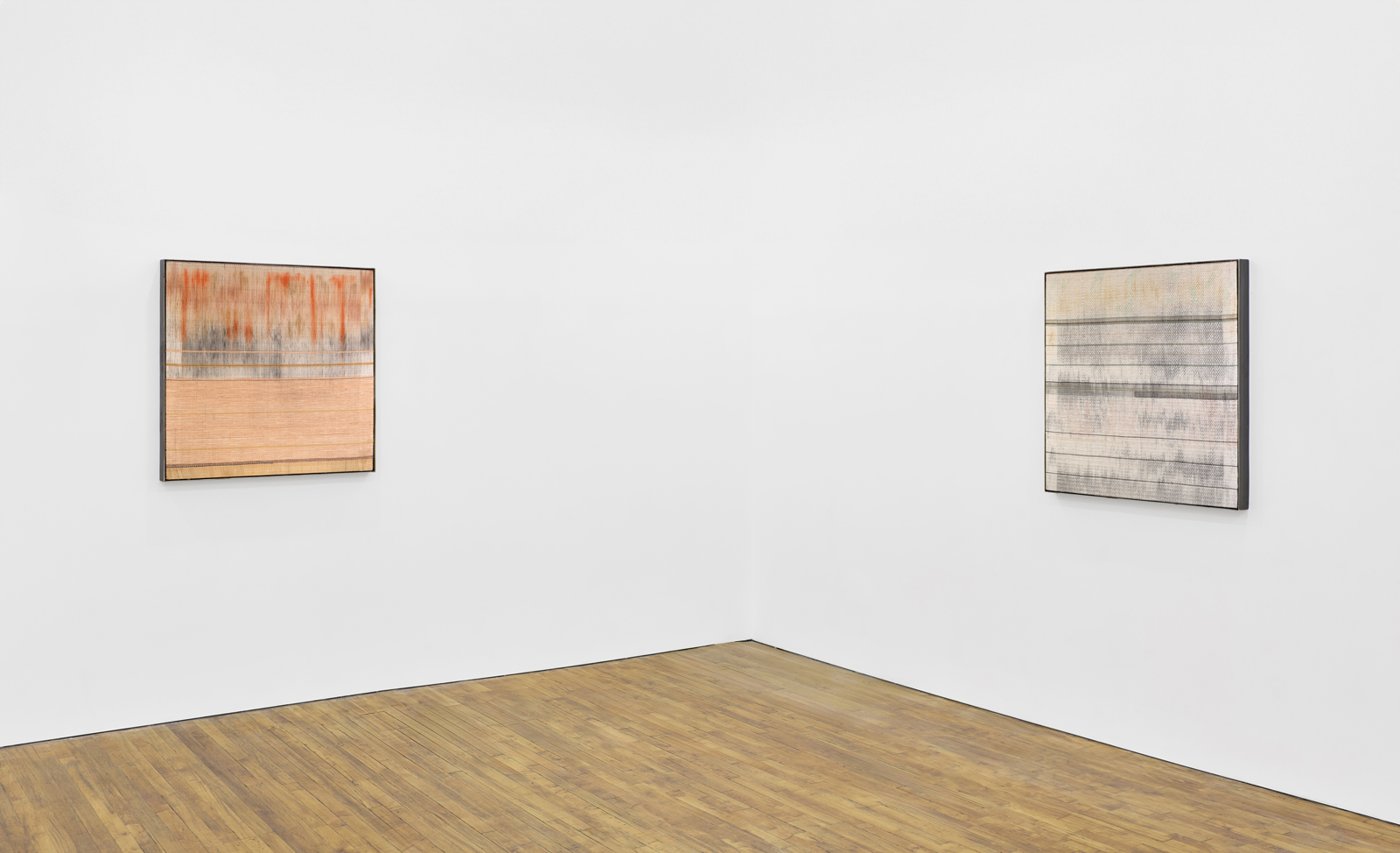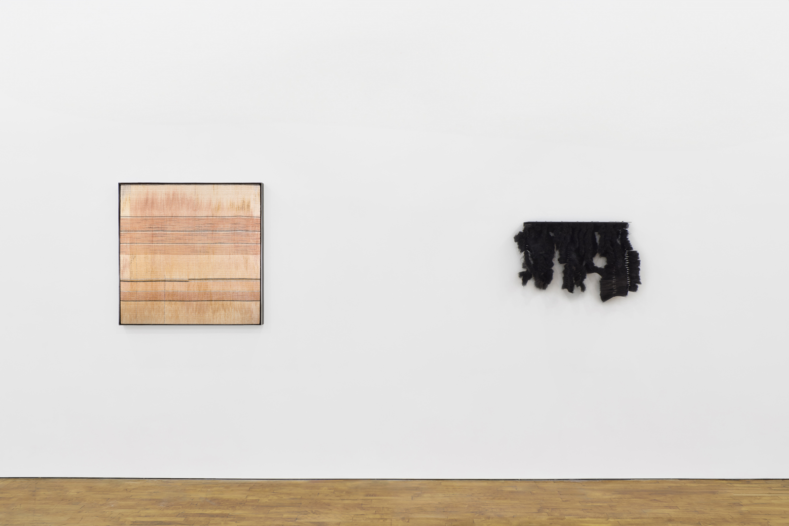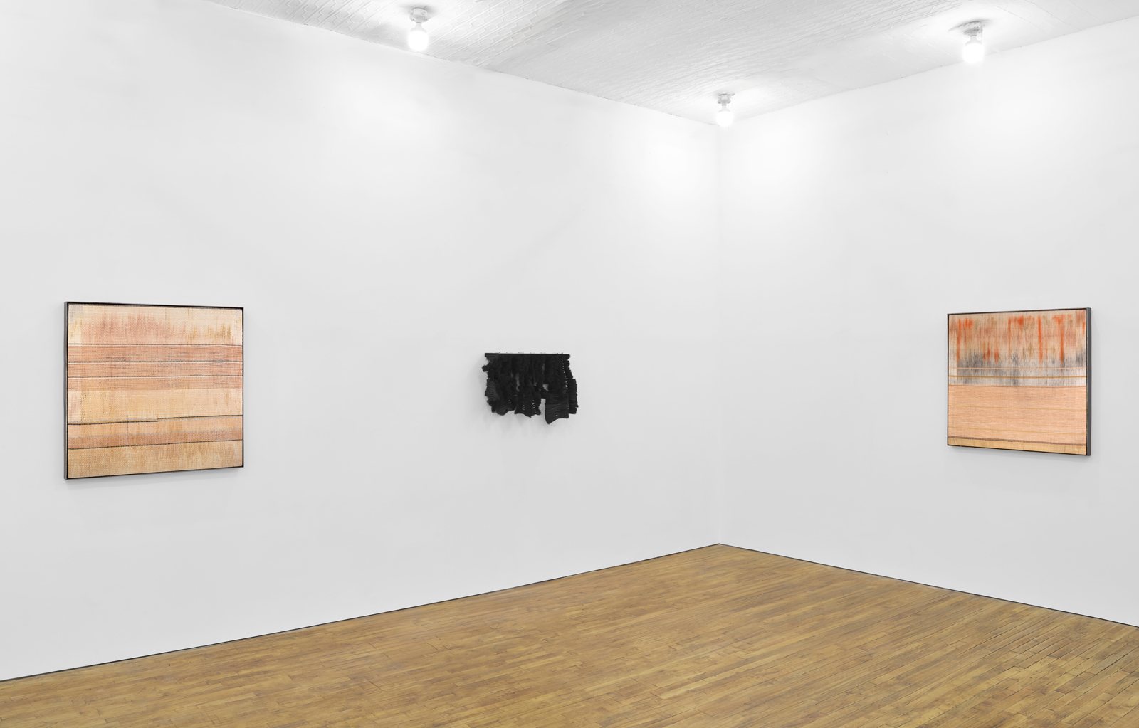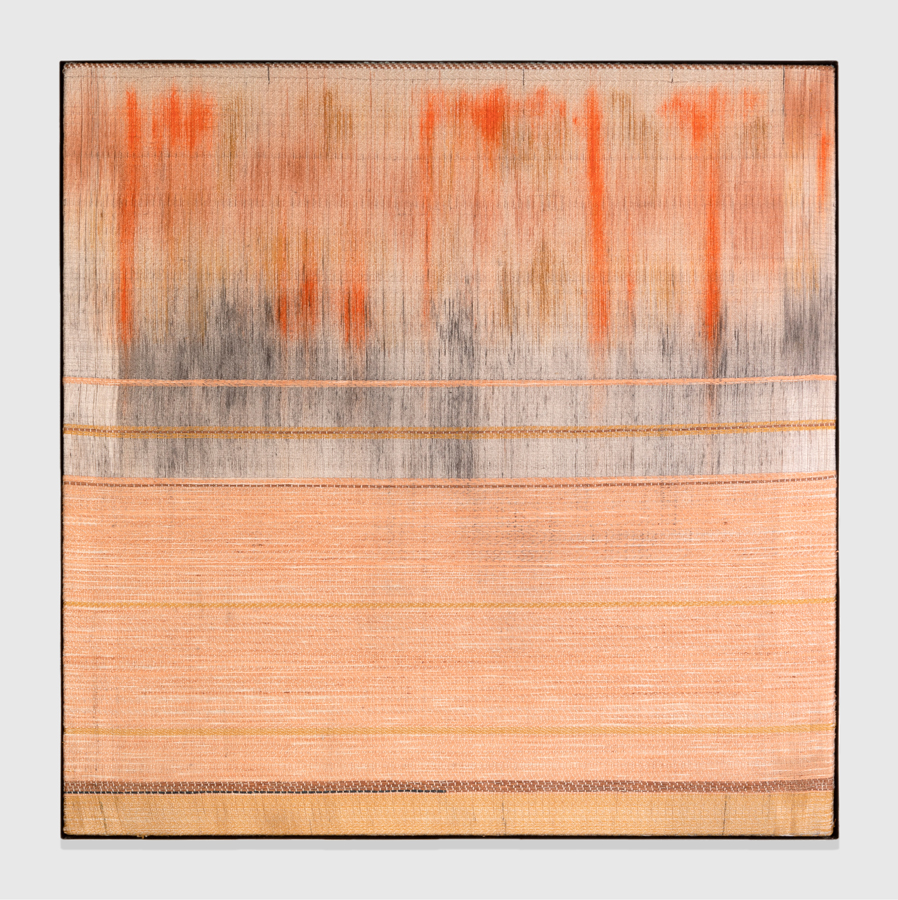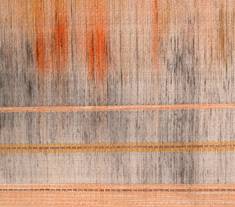 The method by which these works are produced involves the artist entering a nearly hallucinatory state, relinquishing conscious control and allowing memories and emotions to permeate the work. Hohimer winds her warp with thread spun from cotton grown in West Texas and dyed with natural materials, including clay collected from surrounding areas. As she dresses the loom and begins to weave, her hands move in unbroken rhythm. This extended, embodied focus manifests in Color field-like expanses of pigment where closeness and distance blend and the weave’s pattern is imprinted by the land in unpredictable ways. This produces the vertical striations that are most pronounced in works such as Portal to Atonement, and Say Yes To The River, where concentrations of pigment at the top of the compositions seem to portend the swell just before a storm. In other instances, she incorporates pine paper, and sisal or agave fiber, with a specific restraint, embedding the quality of the materials in the overall configuration, while leaving organic signifiers for the viewer to consider.