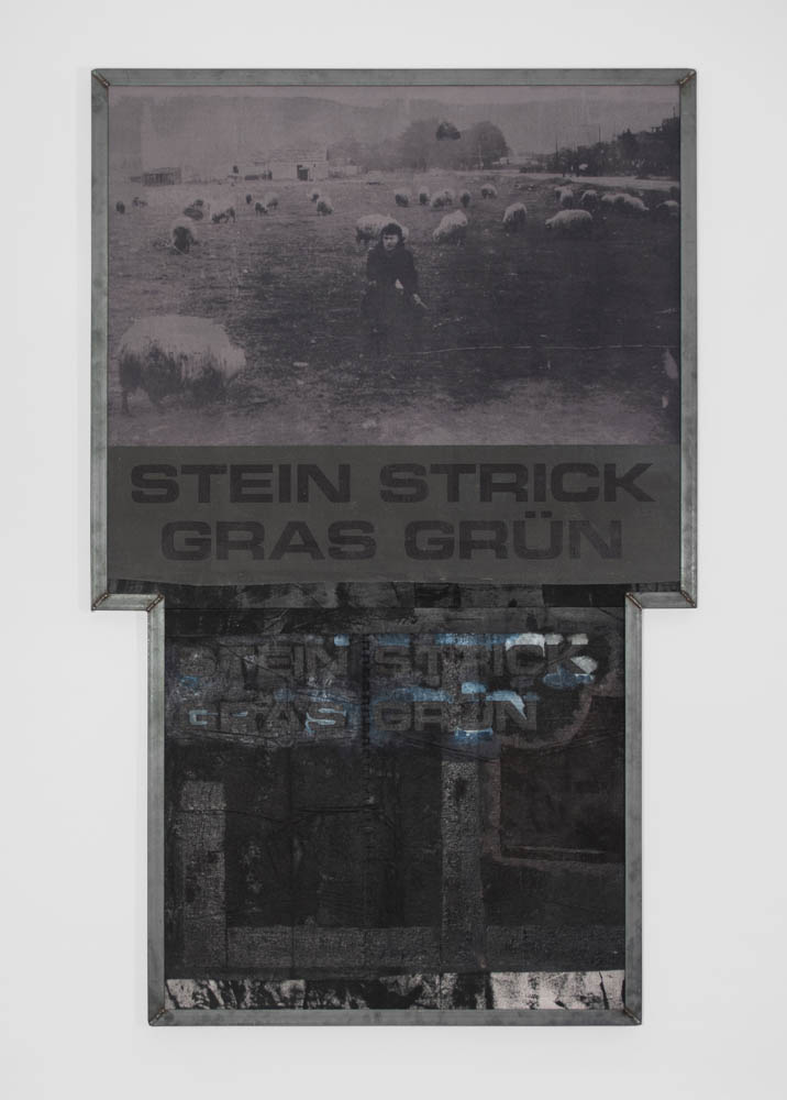 Darja Bajagić, A Lion Among Sheep: Stein, Strick, Gras, Grün, 2022. Acrylic, embalmer’s thread, oil, and UV print on canvas; steel frame, 70 1/4 × 44 1/8 × 1 1/8 in / 178,4 × 112,1 × 2,9 cm
