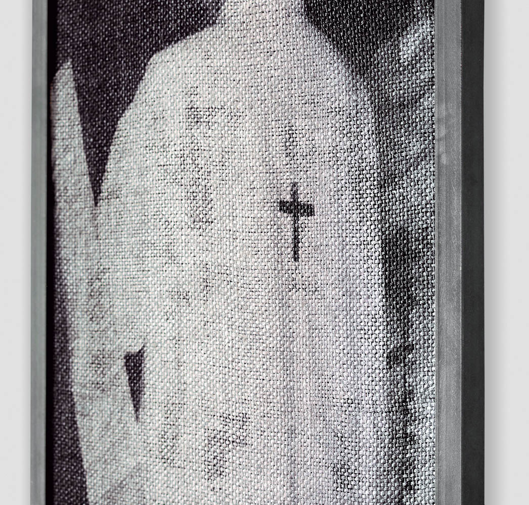 Darja Bajagić, Baptism by Blood (Mother & Child), 2022 (detail). Acrylic, embalmer’s thread, and UV print on burlap; steel frame, 65 1/2 × 42 3/4 × 1 1/8 in / 166,4 × 108,6 × 2,9 cm