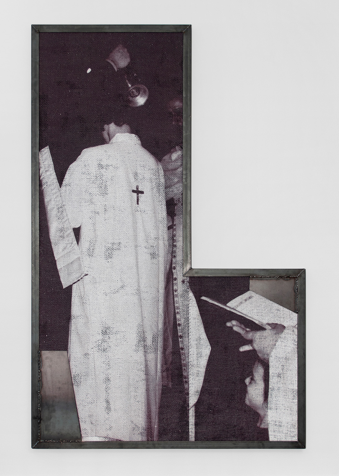 Darja Bajagić, Untitled, 2021. Acrylic, burlap, embalmer’s thread, and UV print on canvas; steel frame, 49 × 43 × 2 in / 124,46 × 109,22 × 5,08 cm