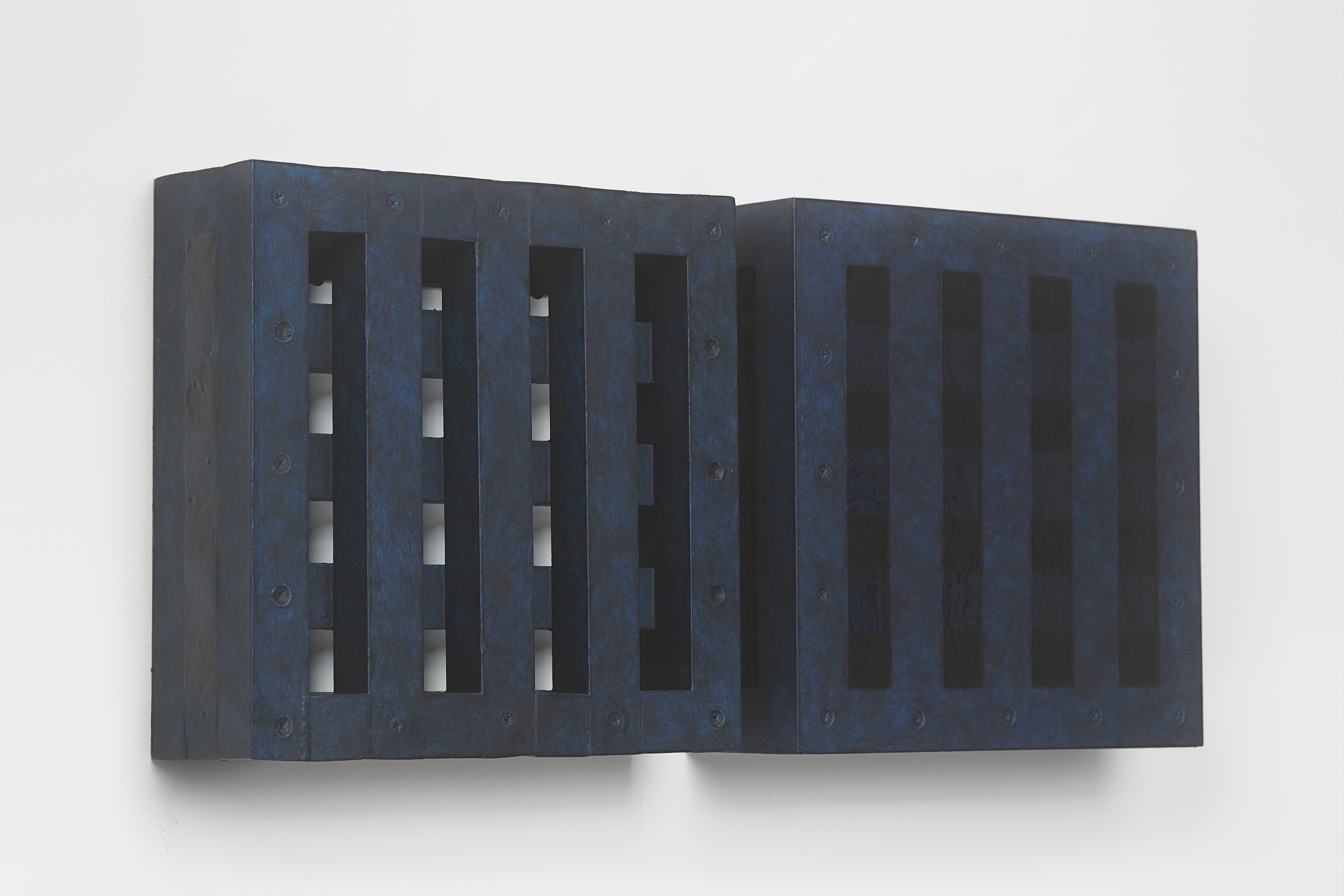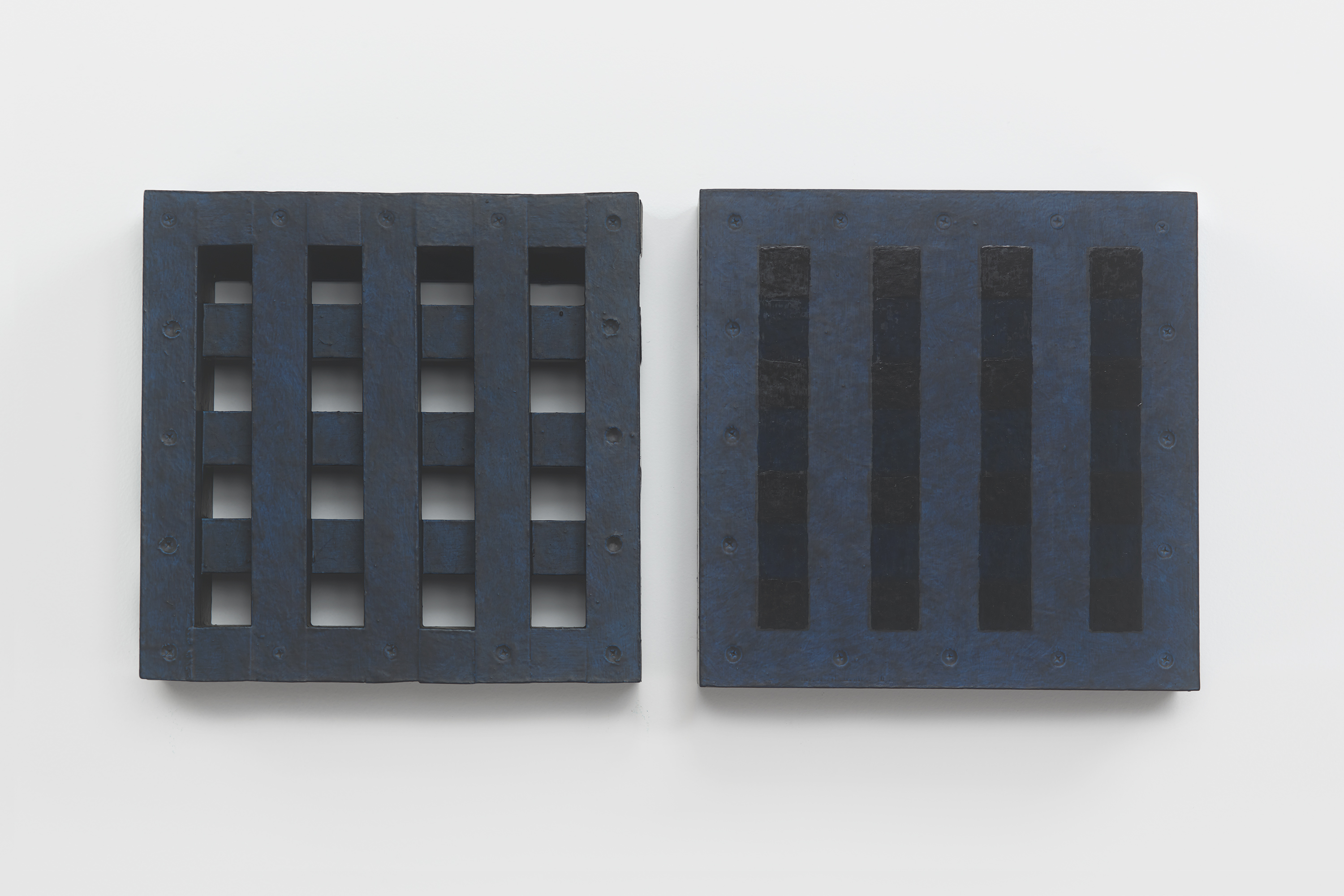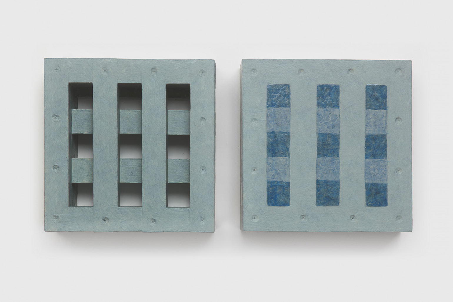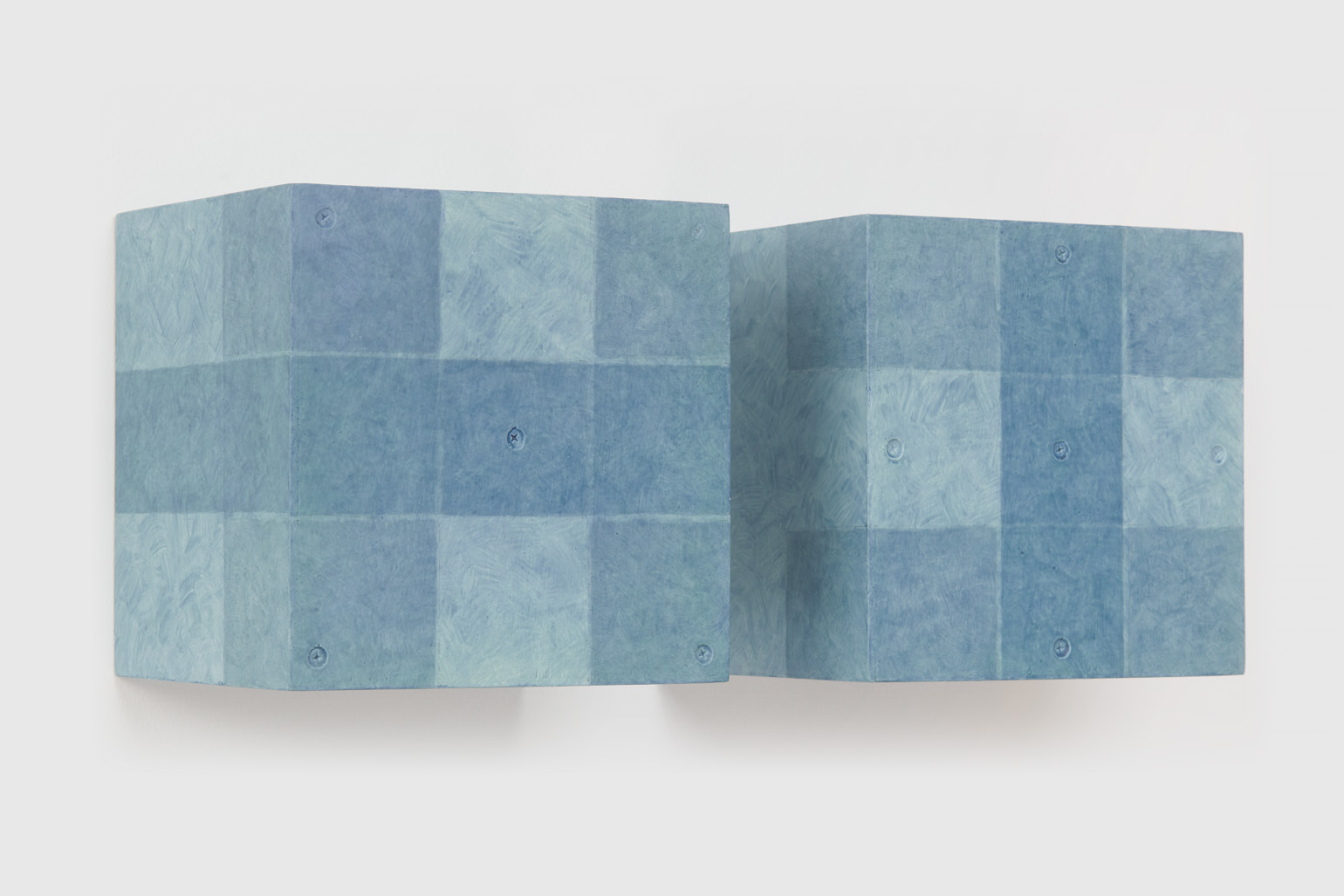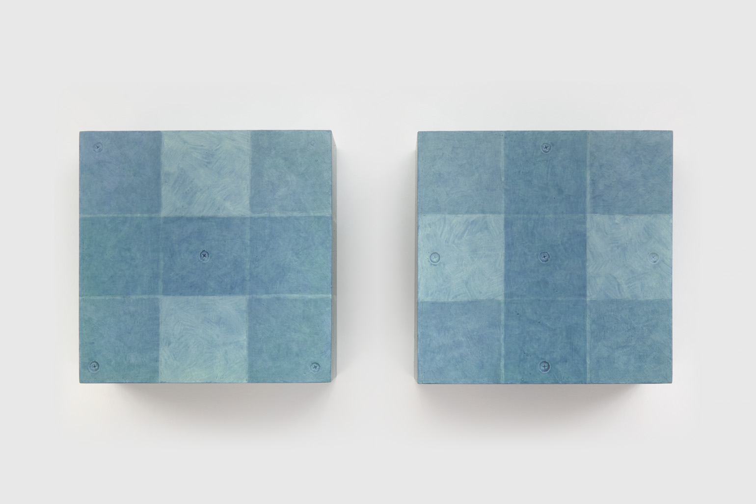 The works included in this exhibition were all made during the night-time hours: a curious connection to Uglow, who would break his self-imposed rules in the studio during the evening. Large grids are paired with small twin cubes that command presence on a smaller scale. The twin cubes hang as pairs. The left element is a constructed piece, the right is an illusion of the left existing in the slippage between sculpture and painting.