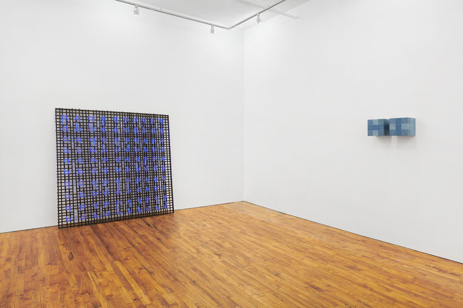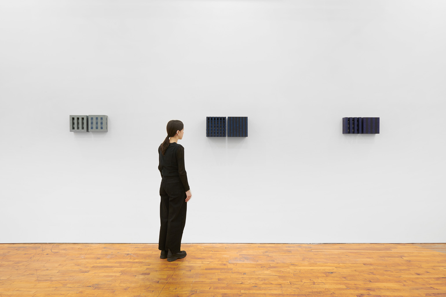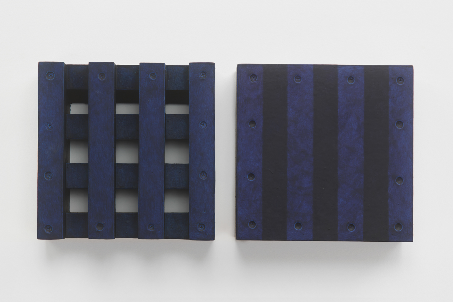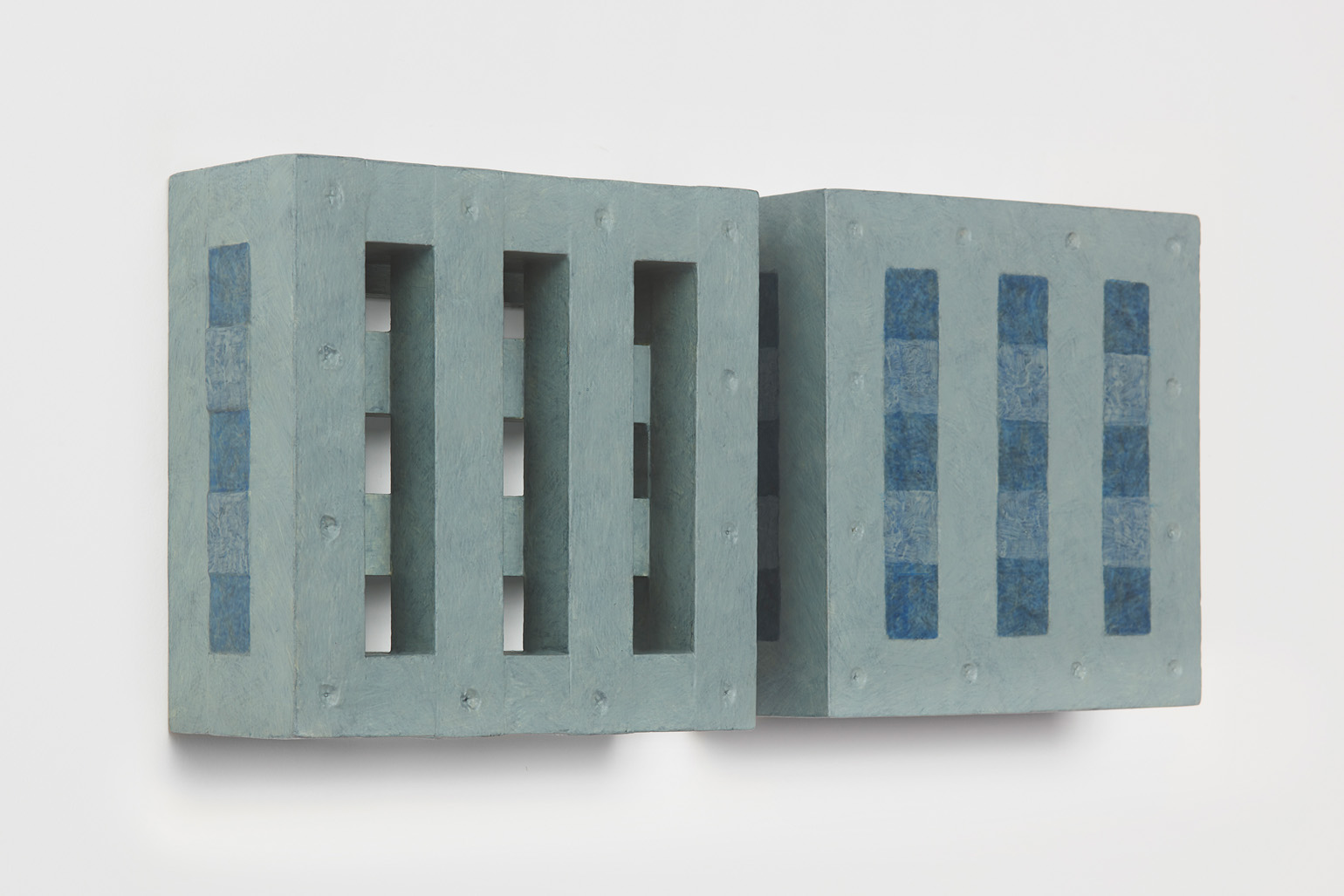 The works included in this exhibition were all made during the night-time hours: a curious connection to Uglow, who would break his self-imposed rules in the studio during the evening. Large grids are paired with small twin cubes that command presence on a smaller scale. The twin cubes hang as pairs. The left element is a constructed piece, the right is an illusion of the left existing in the slippage between sculpture and painting.