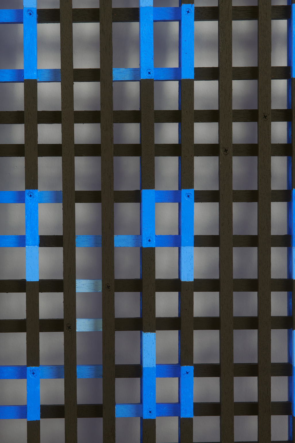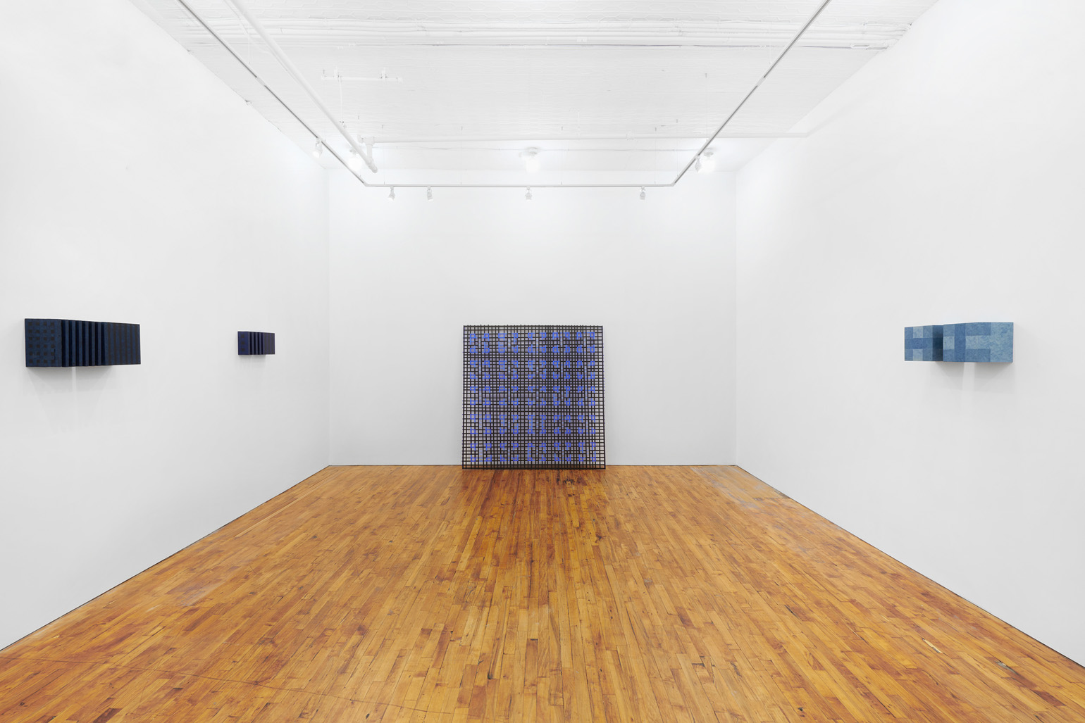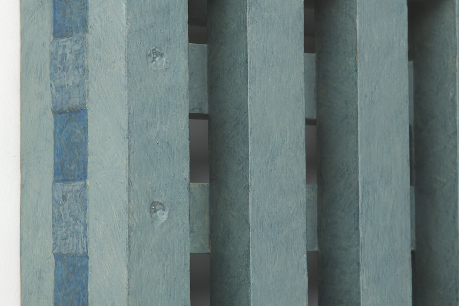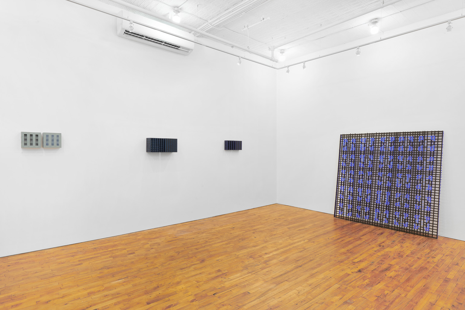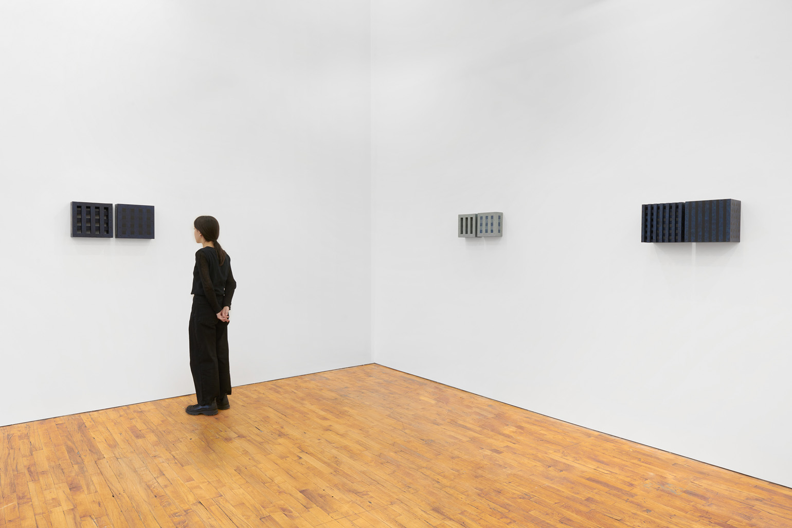 The works included in this exhibition were all made during the night-time hours: a curious connection to Uglow, who would break his self-imposed rules in the studio during the evening. Large grids are paired with small twin cubes that command presence on a smaller scale. The twin cubes hang as pairs. The left element is a constructed piece, the right is an illusion of the left existing in the slippage between sculpture and painting.