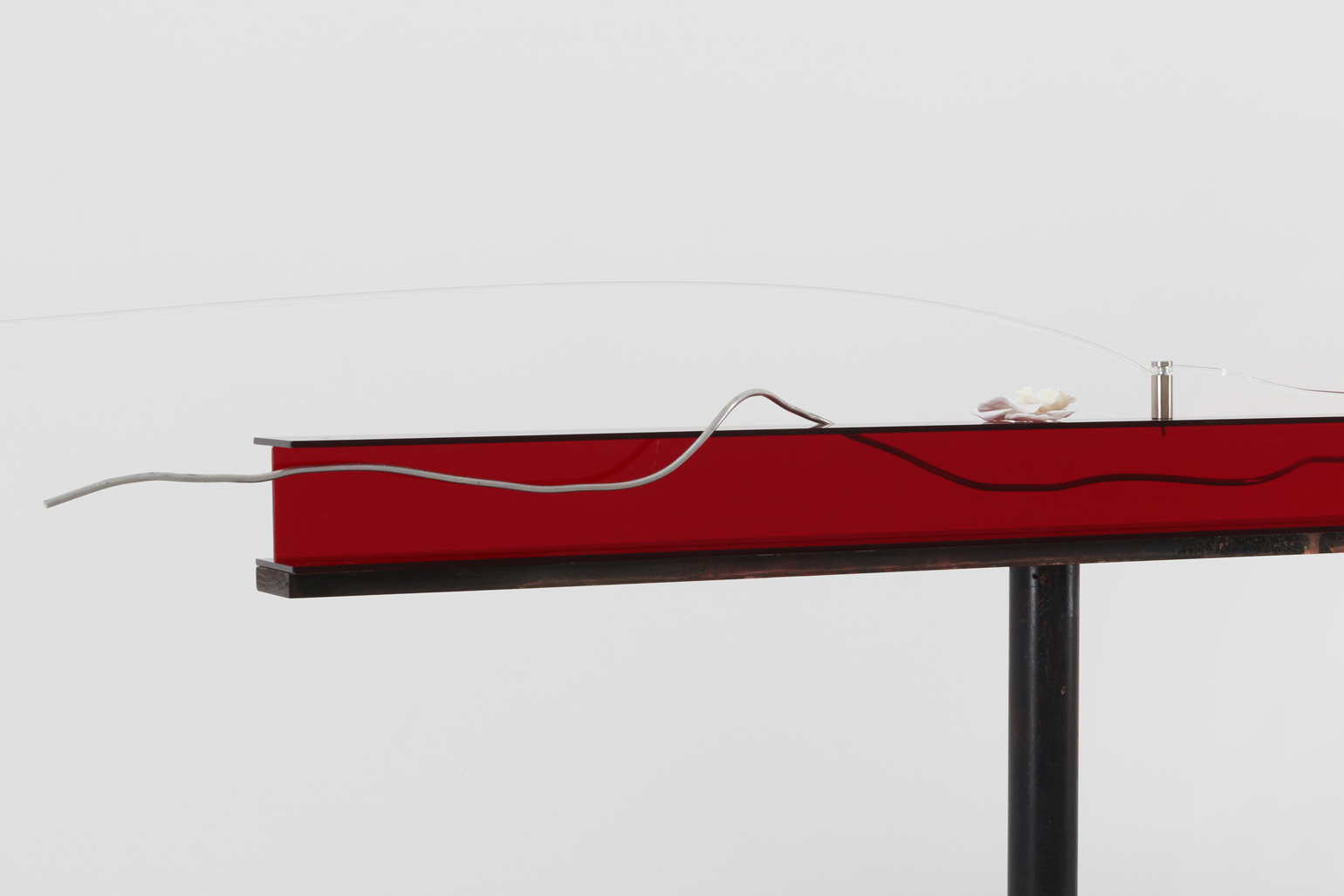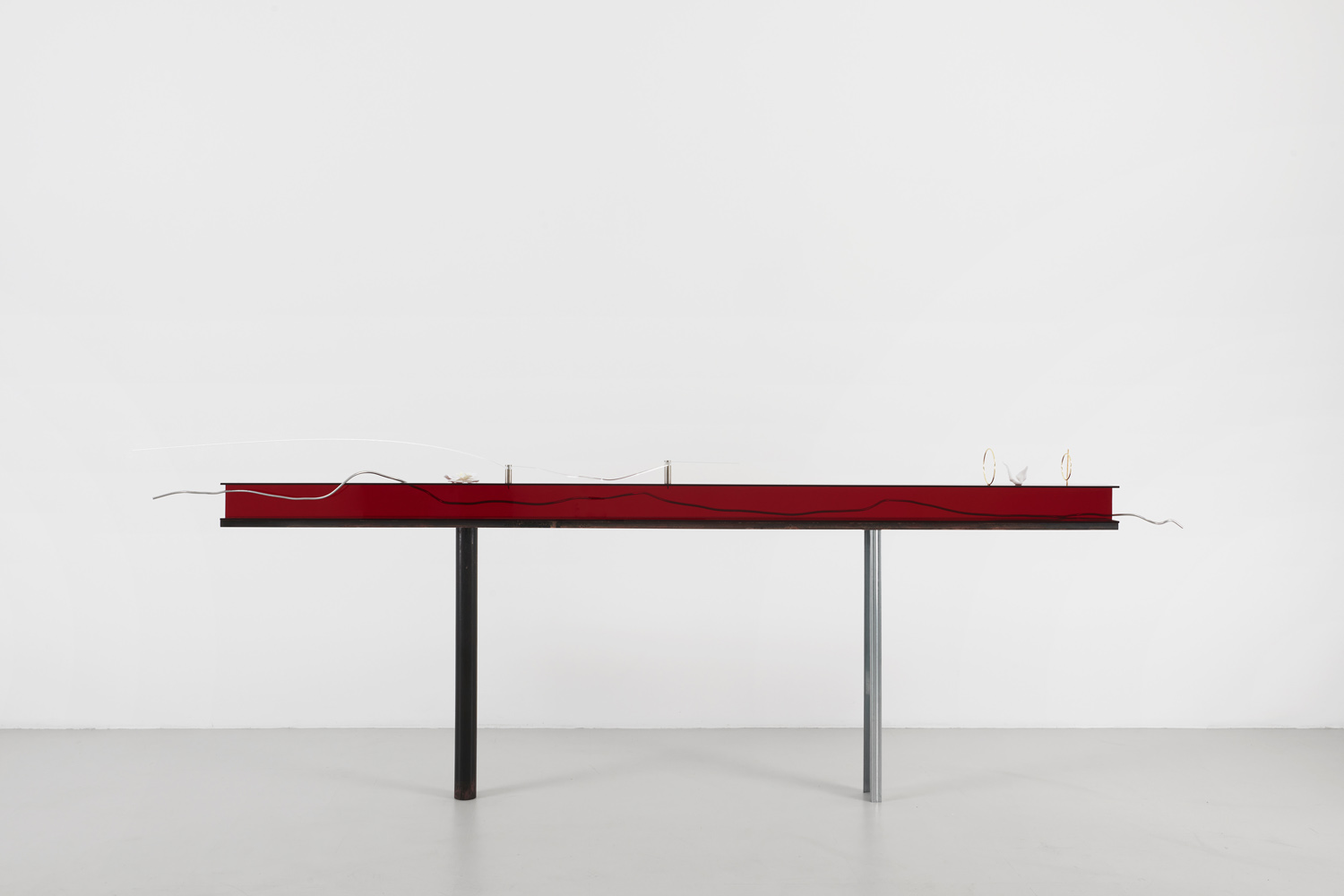 Priscilla Jeong, Workers of Five Point Chamber: Red 1 (Safe 16), 2021. Brass, acrylic, aluminum, steel, iron, pvc, wood, hydrogen peroxide, thermoplastic. 48 × 100 × 5 in / 121,9 × 254 × 12,7 cm