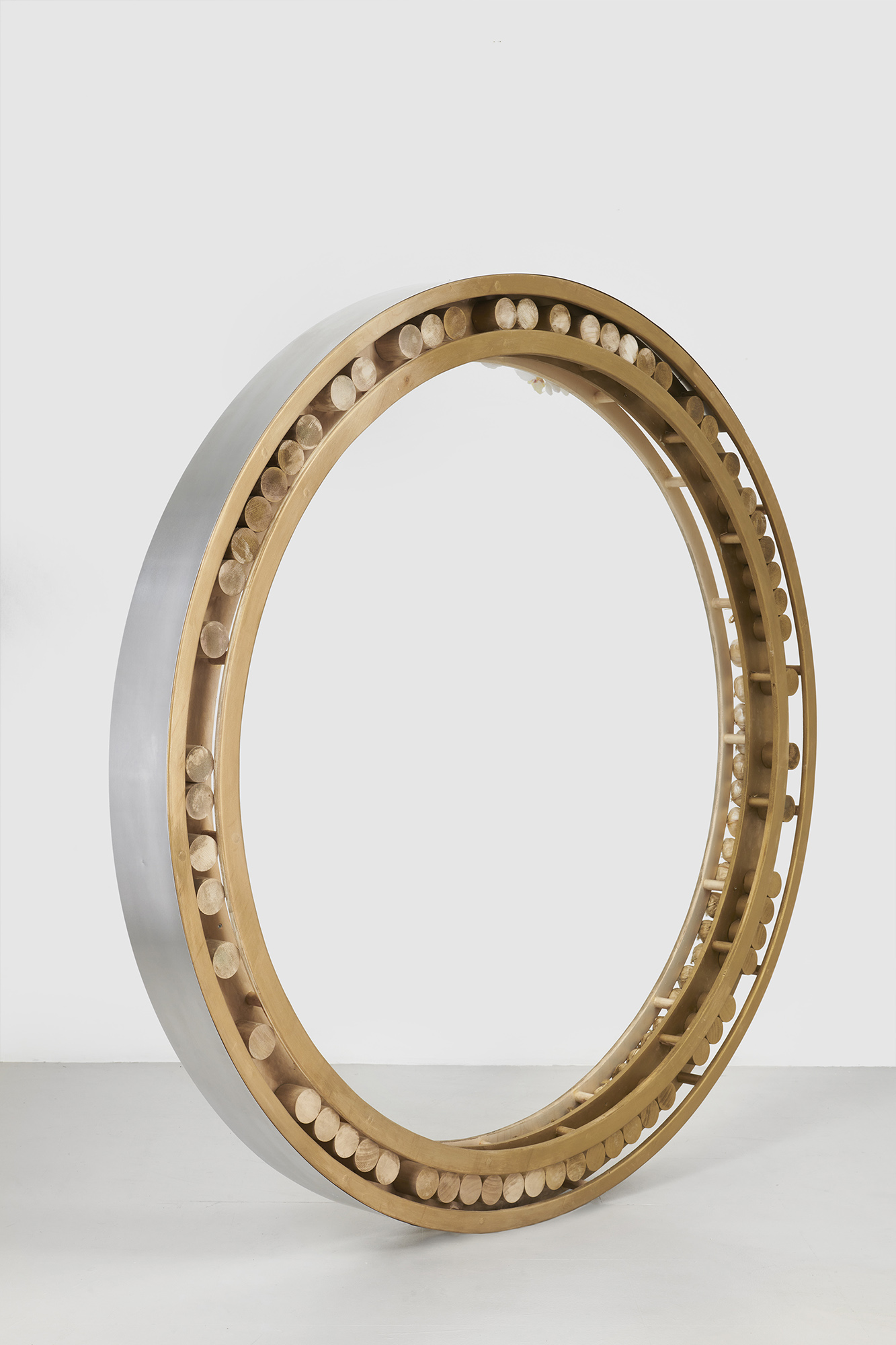 Priscilla Jeong, Workers of Five Point Chamber: Red 1 (Safe 16), 2021 (detail). Brass, acrylic, aluminum, steel, iron, pvc, wood, hydrogen peroxide, thermoplastic. 48 × 100 × 5 in / 121,9 × 254 × 12,7 cm