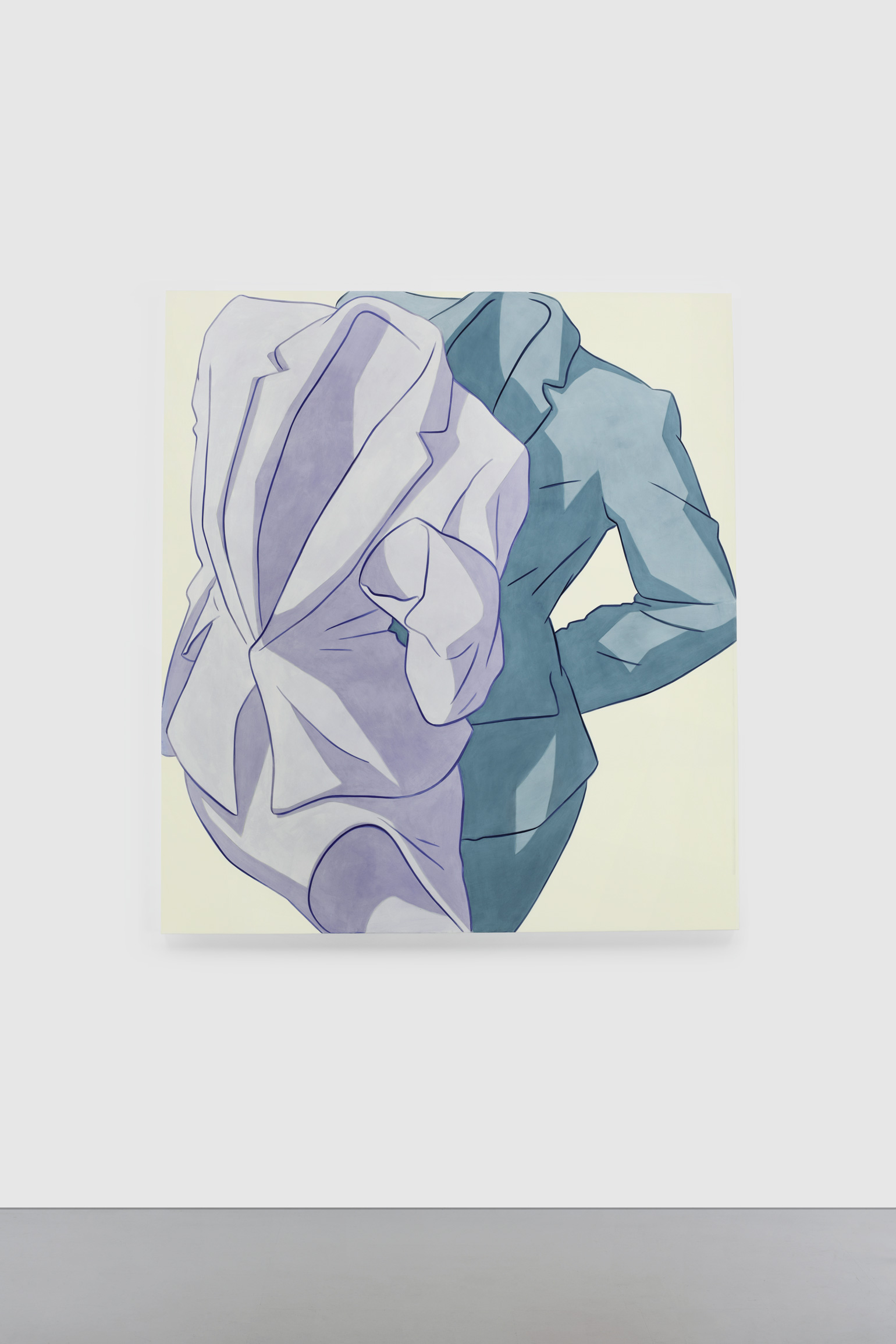Ivy Haldeman, Two Suits, Sitting, Cuff to Lapel, Belly Down, Shoulders Tilt (Red, Blue Horizontal), 2021. Acrylic on canvas, 67 × 60 inches / 170 × 152 cm