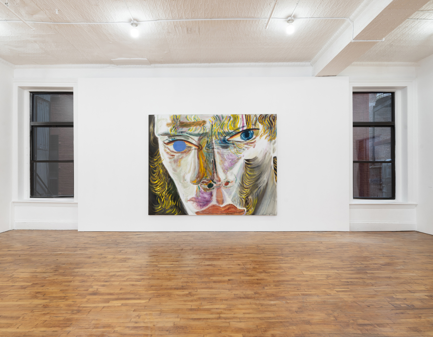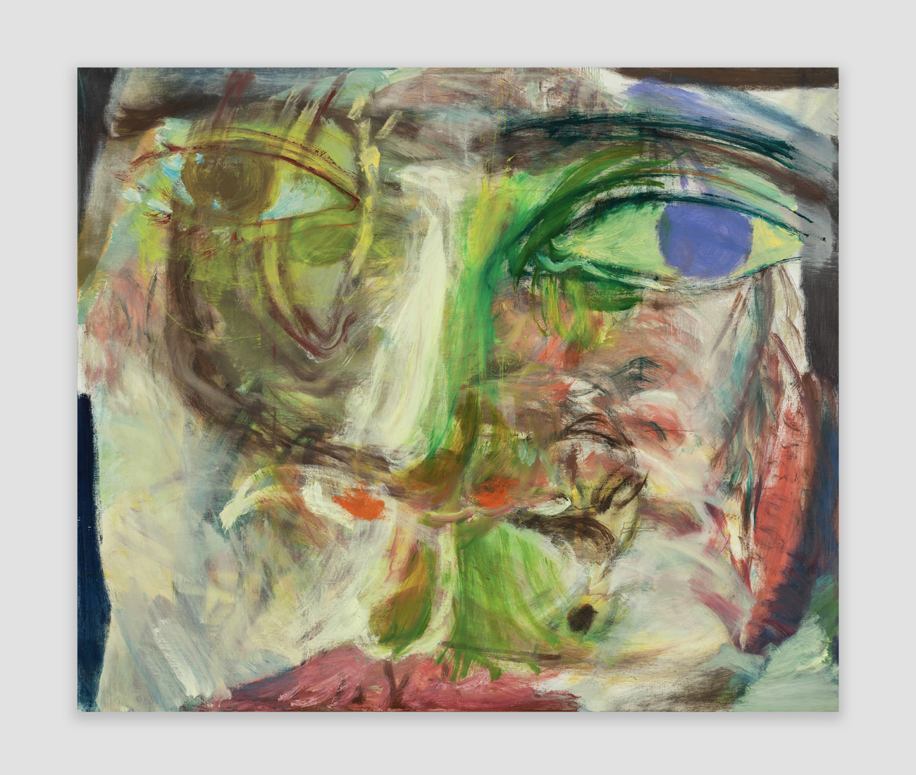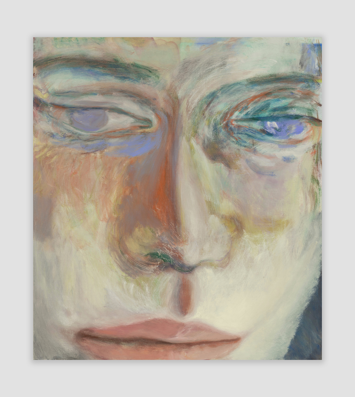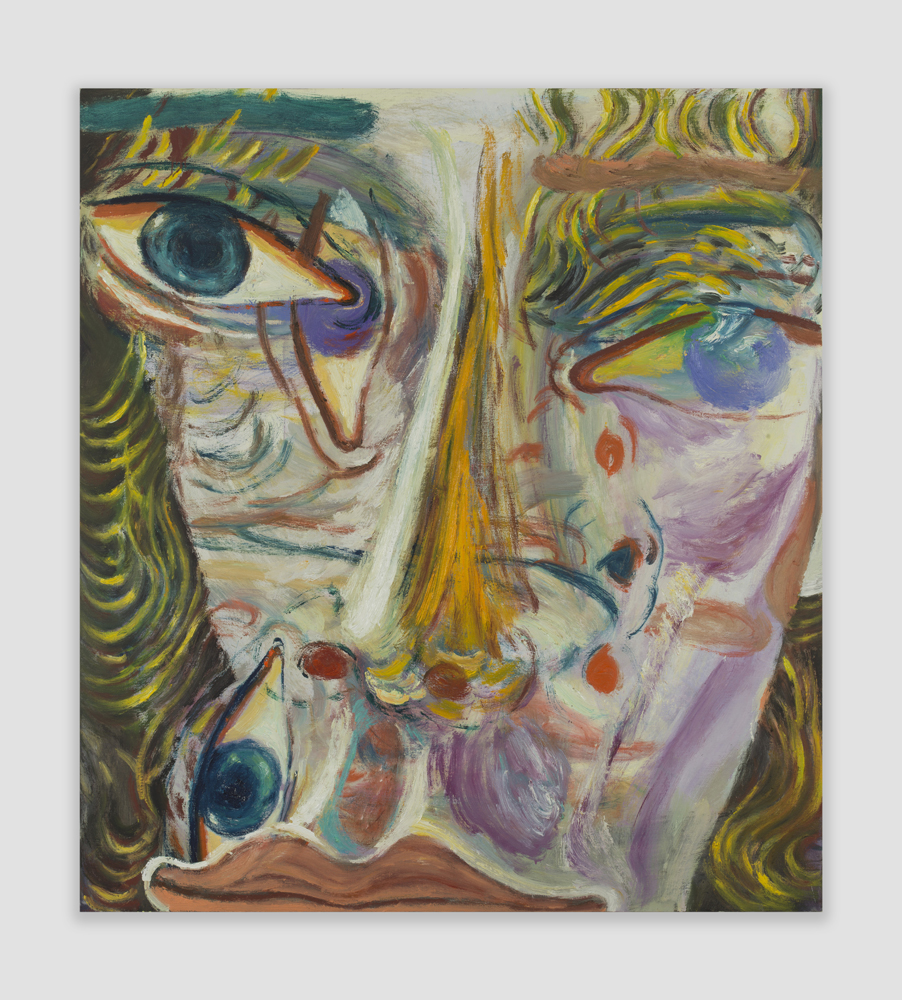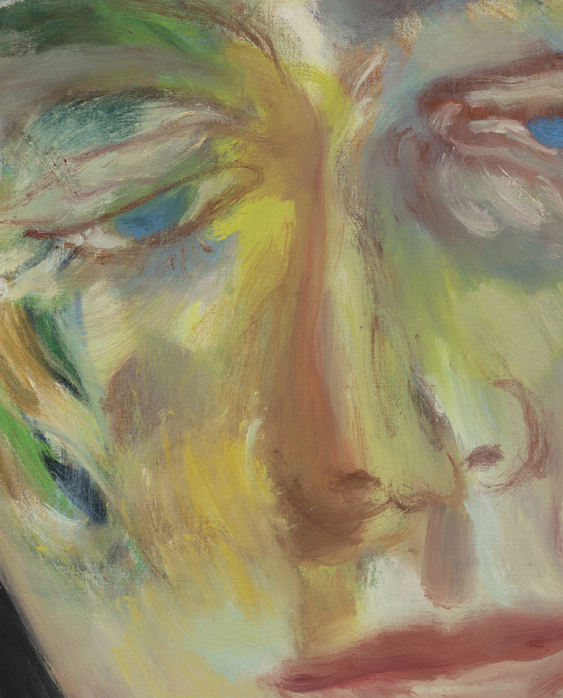 In his work, Jiang elucidates how self-expression through portraiture can mirror the transhistorical and transcultural lineage of artistic tradition, intertwining influences ranging from Chinese calligraphy and Greco-Roman mythologies to playful sketches by his daughter and the abstract expressionist tradition. His perpetual exploration and pursuit of the unconscious mind illustrates an existential search into human existence, struggle, love, and mortality, as well as the relational dynamics between self and other, and subject and object. Moving away from his inherent identity, Jiang intentionally depicts figures that are decidedly not him, typically characterized by curly blond and brown hair, heterochromatic eyes, and facial features that amalgamate elements from diverse ethnicities. Through this, the artist scrutinizes others—sometimes confrontationally—places them in spaces to be observed, and repositions himself by accentuating his own otherness.