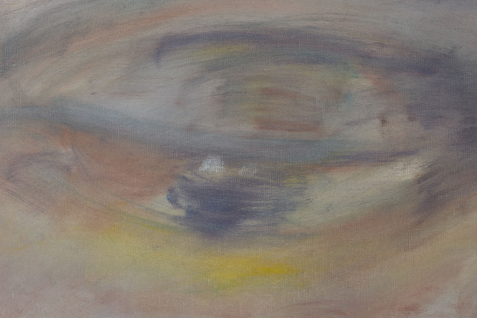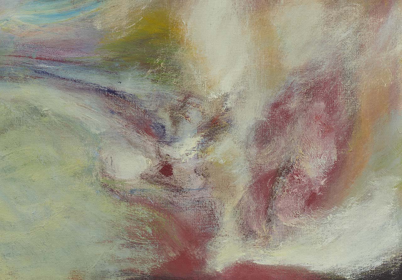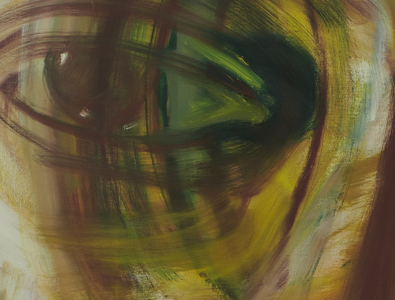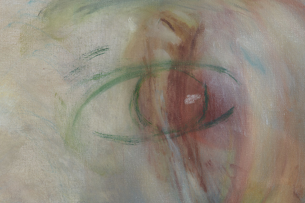 Many traces of the physical struggle have been left behind here on the canvas. Brushstrokes perfectly match the curve of the artist’s swinging arm. Every painting is a battle, an attack on and defense of the built-in knowledge from experience and perception. You must be standing close enough. You must be close enough to escape the slavery of the eyes. You are tugged by this force, so mighty that it can control the entire field of your consciousness and even recognize the unknown. Takuan Sōhō would call it “unconsciously conscious” or “consciously unconscious.”
