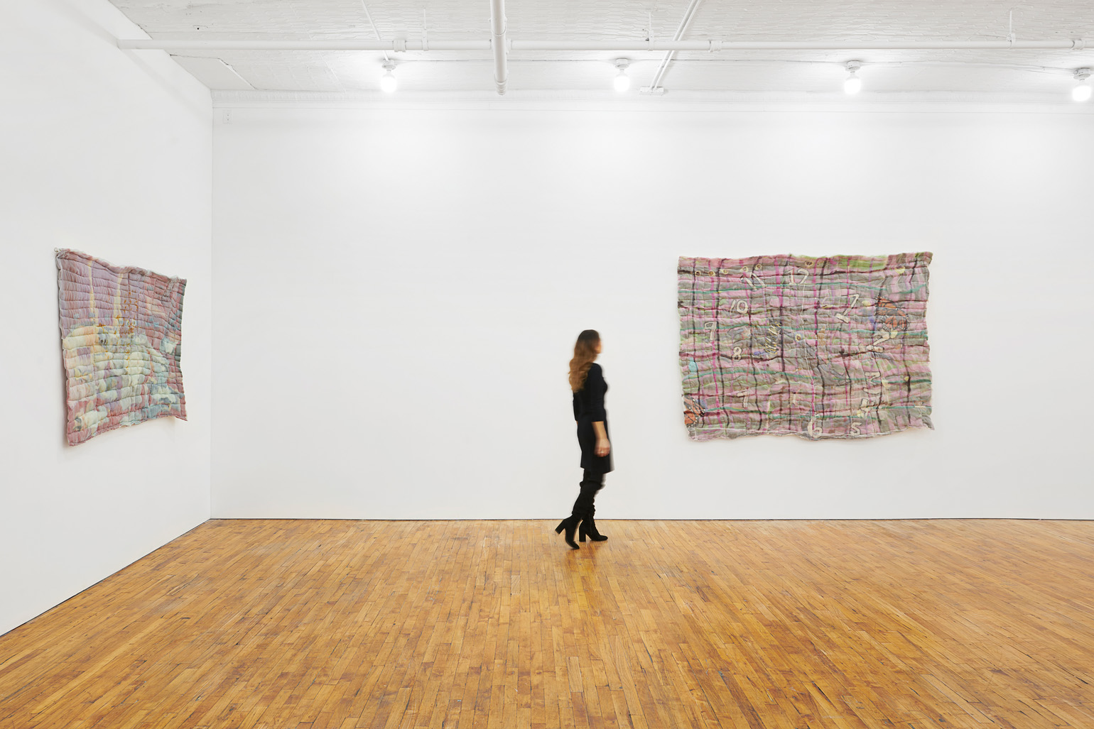The title of the show, “Live,” evokes both instantaneity and longevity: the fleeting live event, a mandate, or an aspirational refrain. The quilts probe these meanings by instantiating ephemeral thoughts, moods, and pictures in durable wool containers. Displaying what looks to be a palm tree bending in the wind, Depression (2022) offers a tongue-in-cheek meditation on individual melancholy routed through the iconography of storm watching, a change in climate becoming a metaphor of individual tumult. In Endgame (2023), squares reminiscent of Tetris blocks fall from the sky, as men careen around a circle of rods and spokes reminiscent of a Ferris wheel, alluding to the pleasures and risks of game-playing both literal and metaphorical.