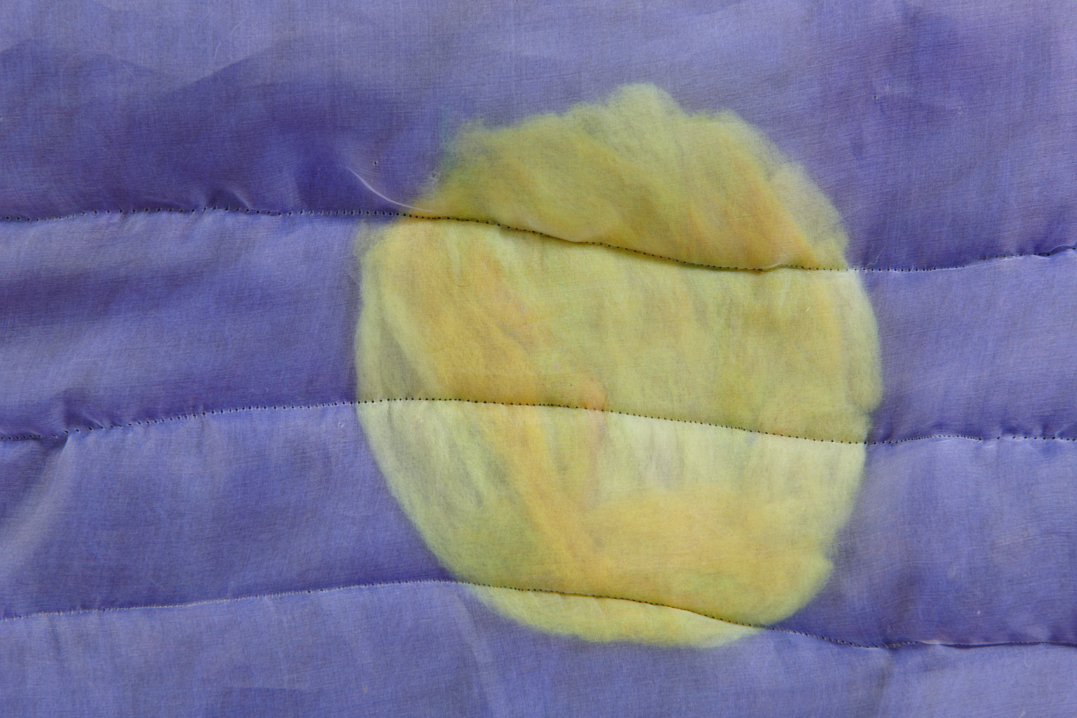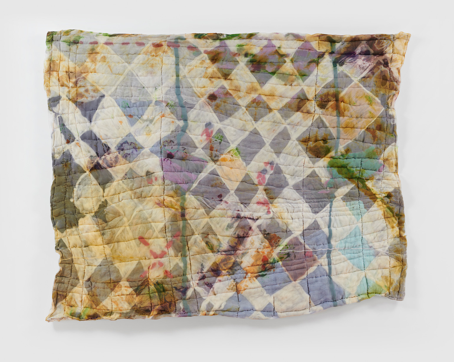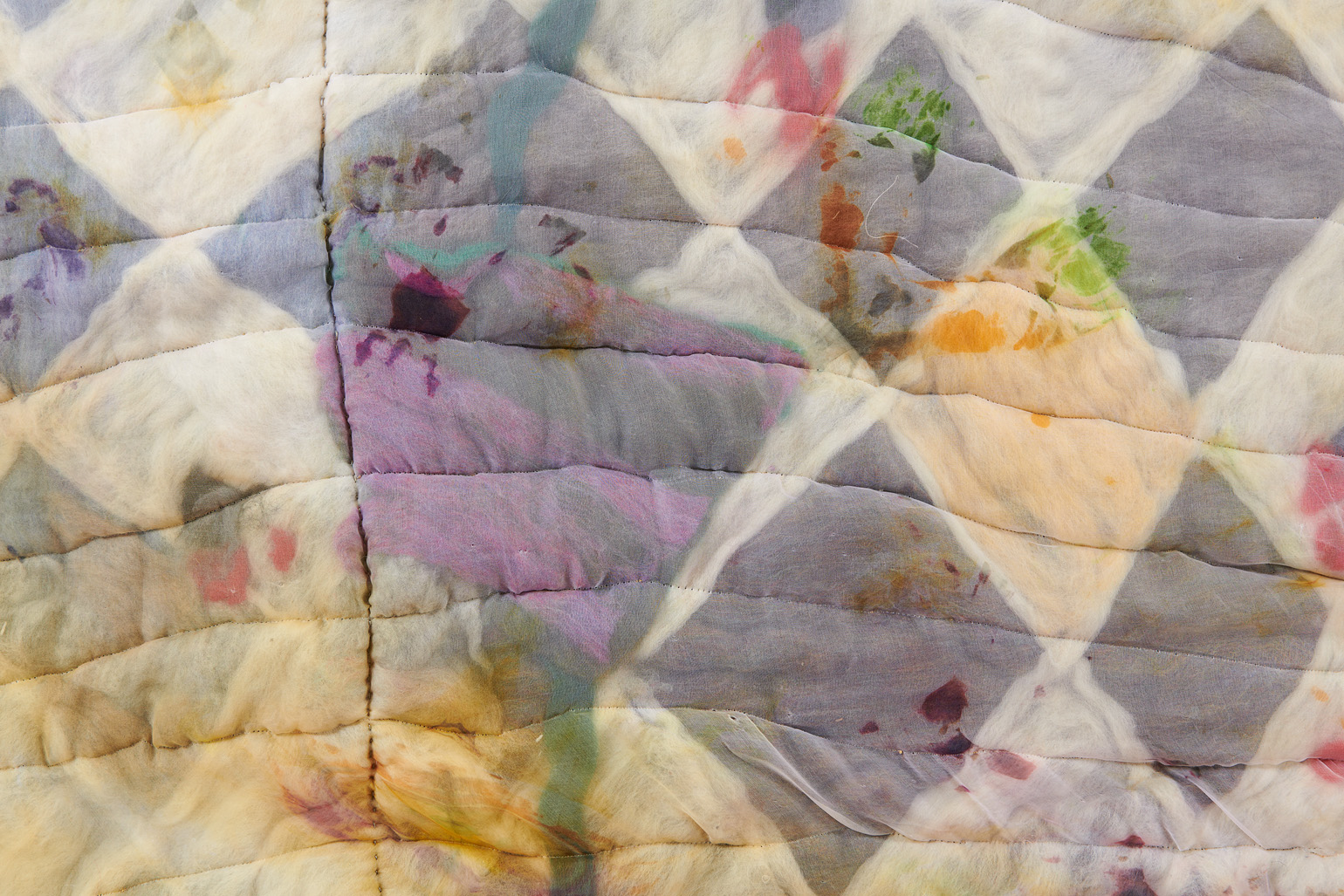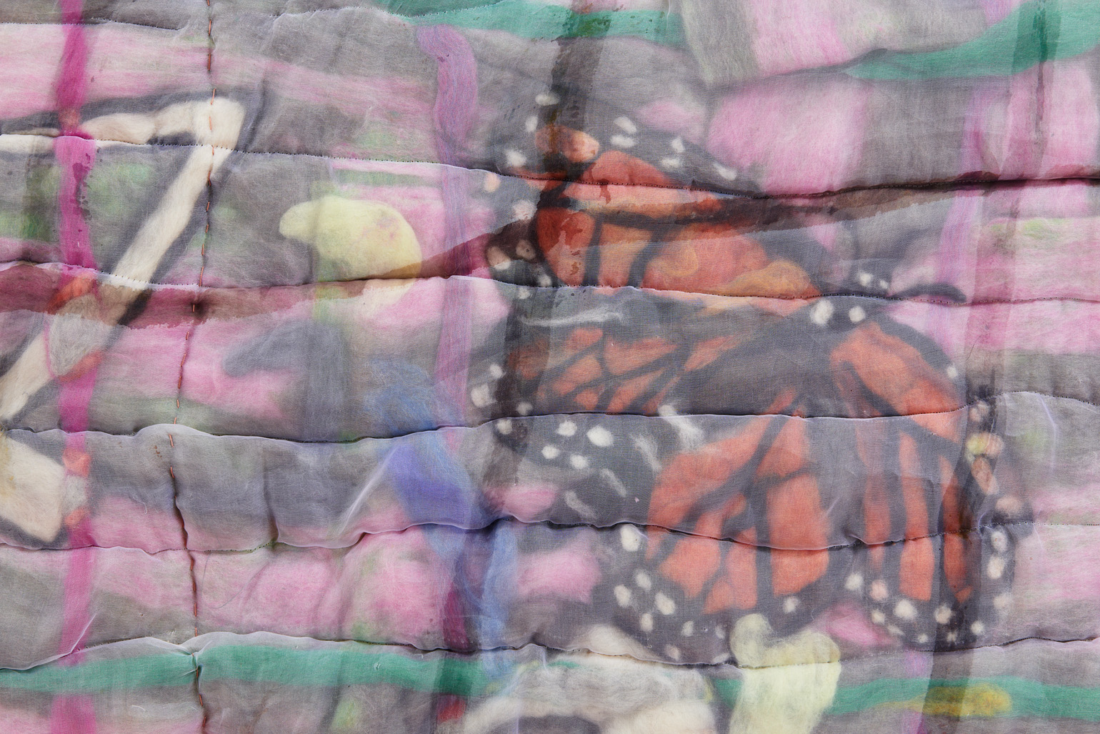To create each quilt, Chance uses both wet and needle felting techniques. Raw tufts of wool are soaped, bathed, stretched, poked, and compressed until the fibers cohere and flatten into manipulable felt. Chance then hand-colors, arranges, collages, and sews these fragments into larger compositions. As a final step, he encases the wool in a layer of silk organza — a gesture of protection akin to cradling the ensemble in resin or varnish, as well as one of occlusion, further burying the layers and hours accumulated within each piece.
