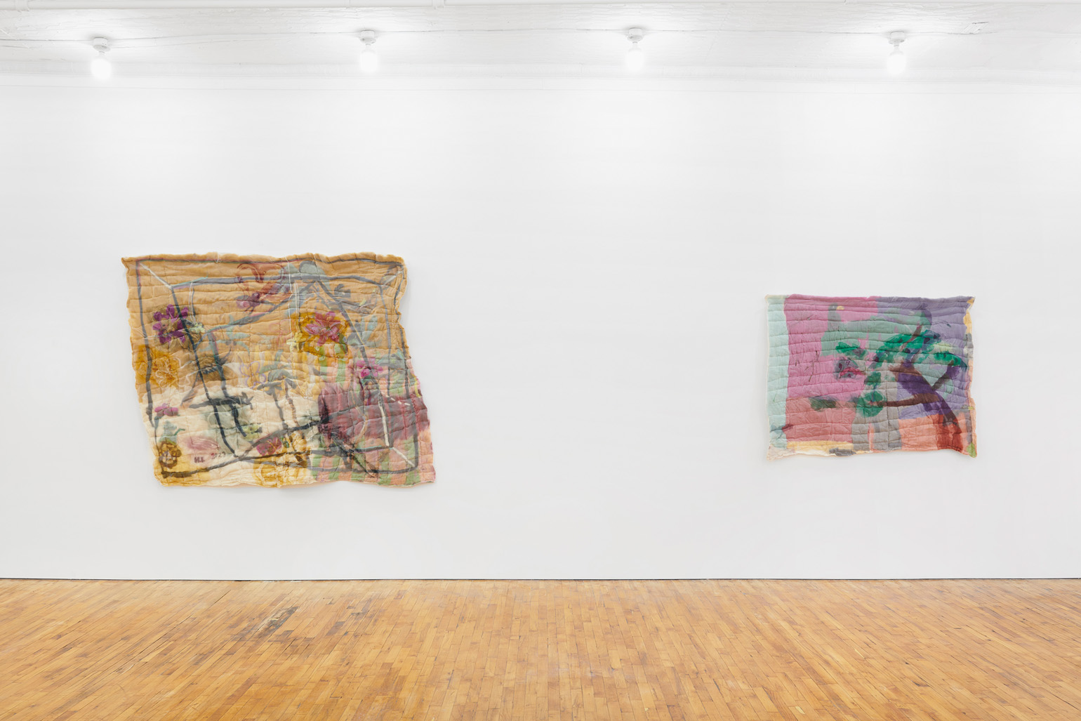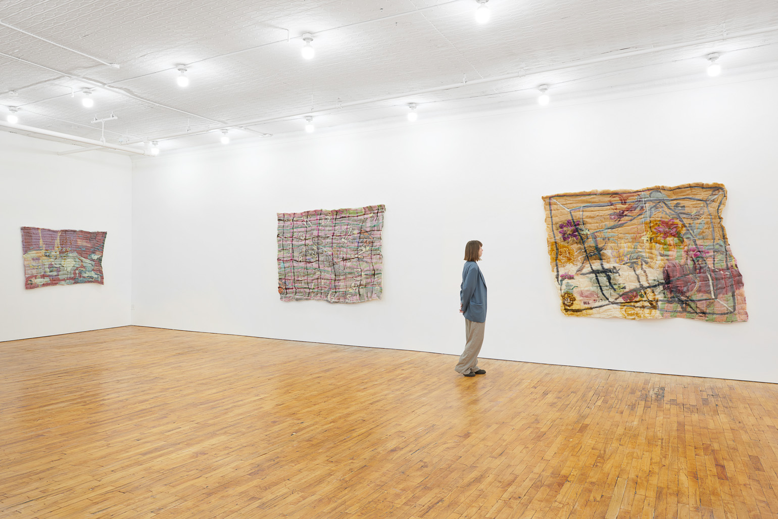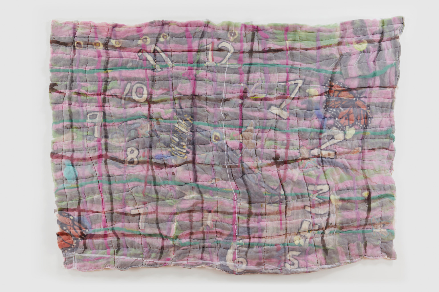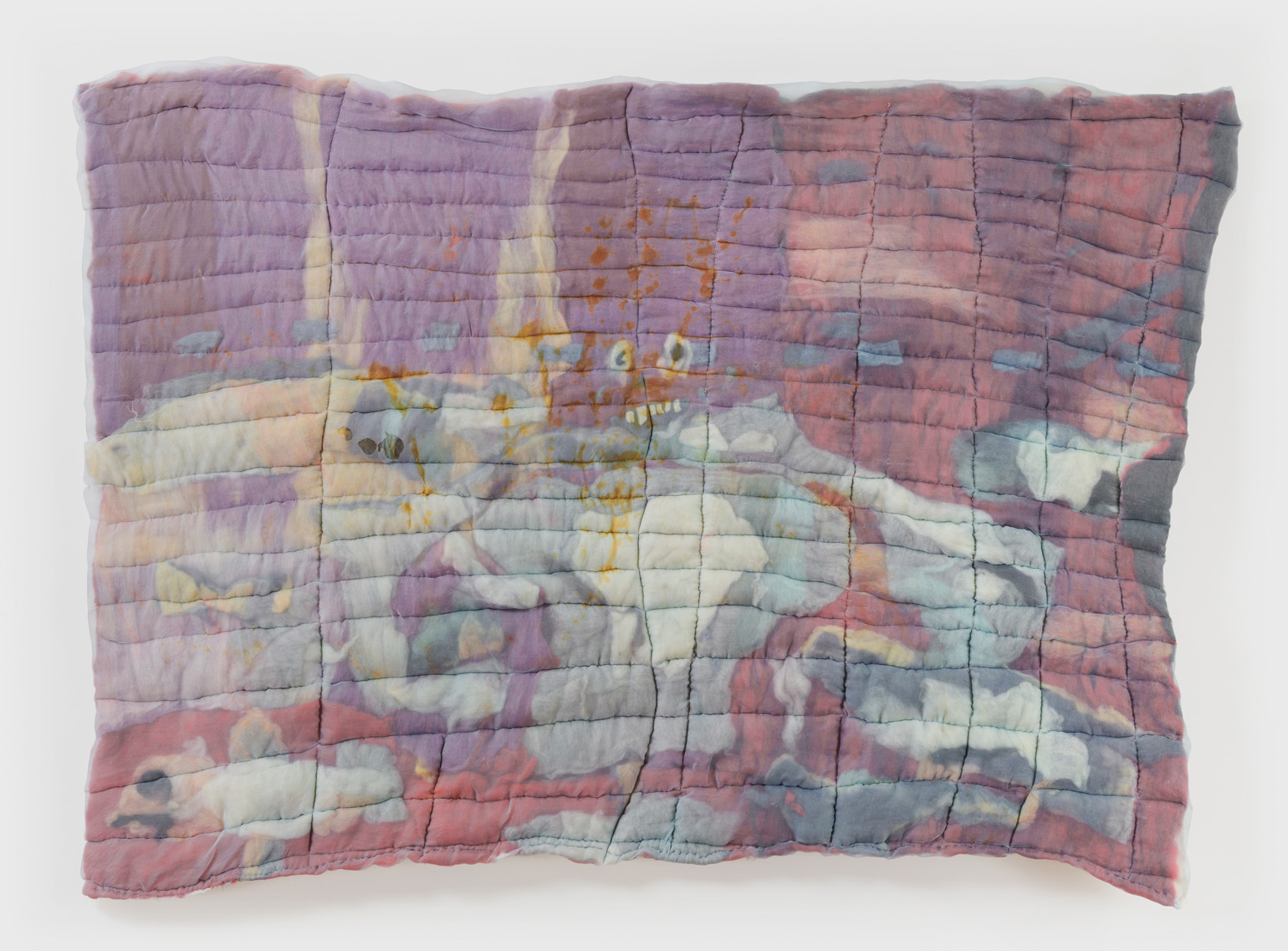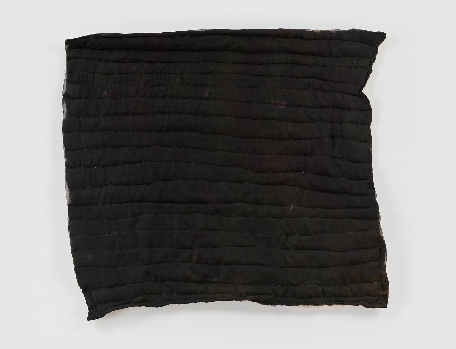 To create each quilt, Chance uses both wet and needle felting techniques. Raw tufts of wool are soaped, bathed, stretched, poked, and compressed until the fibers cohere and flatten into manipulable felt. Chance then hand-colors, arranges, collages, and sews these fragments into larger compositions. As a final step, he encases the wool in a layer of silk organza — a gesture of protection akin to cradling the ensemble in resin or varnish, as well as one of occlusion, further burying the layers and hours accumulated within each piece.