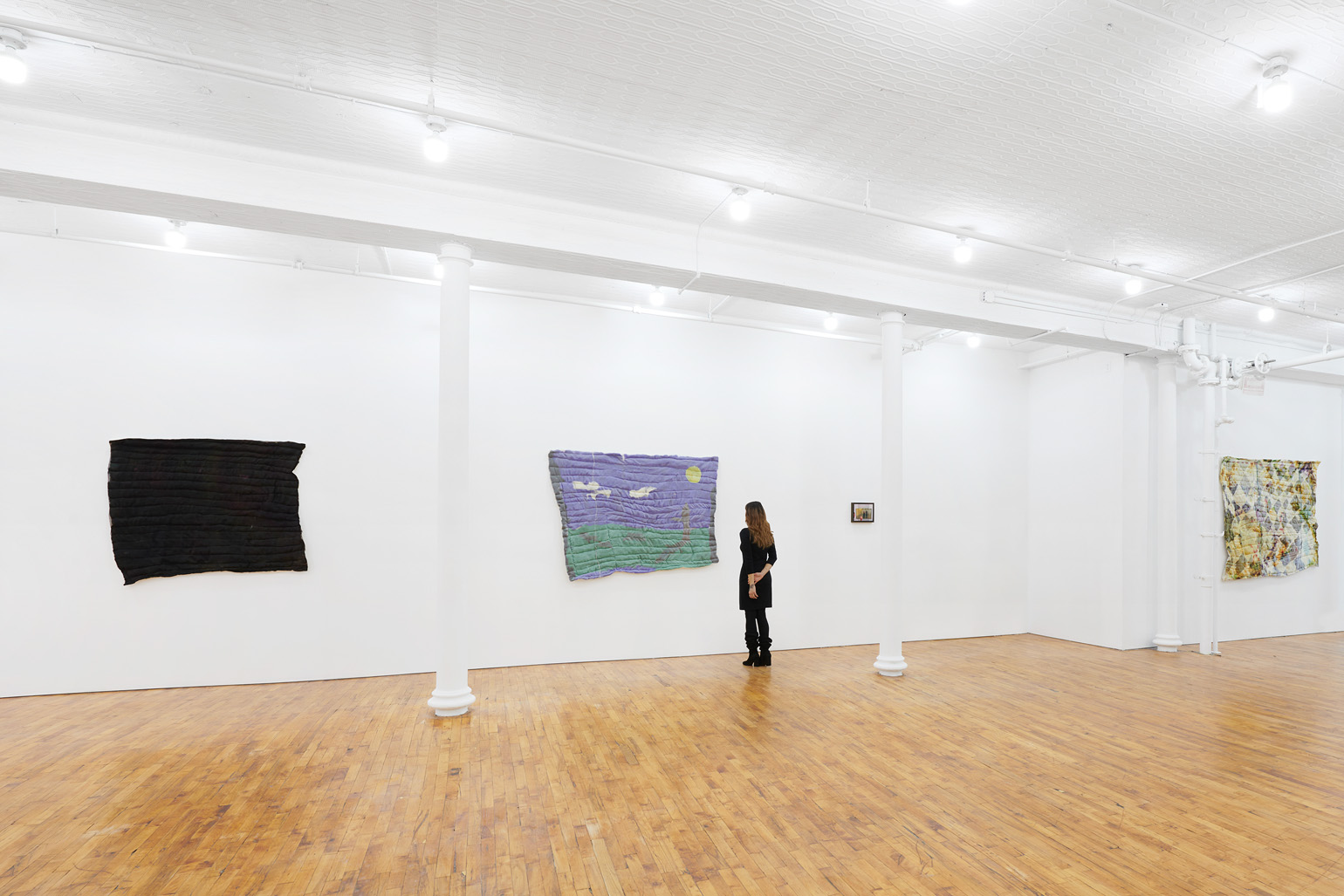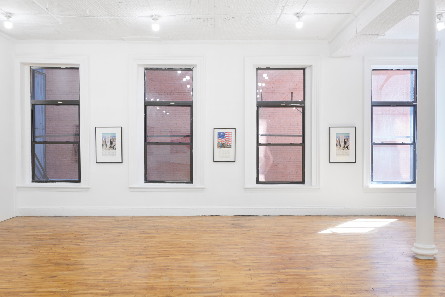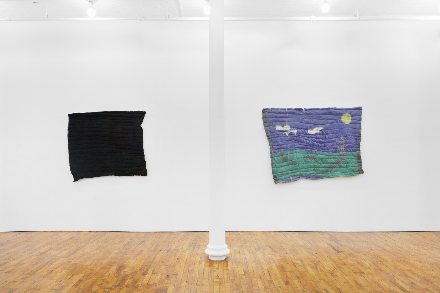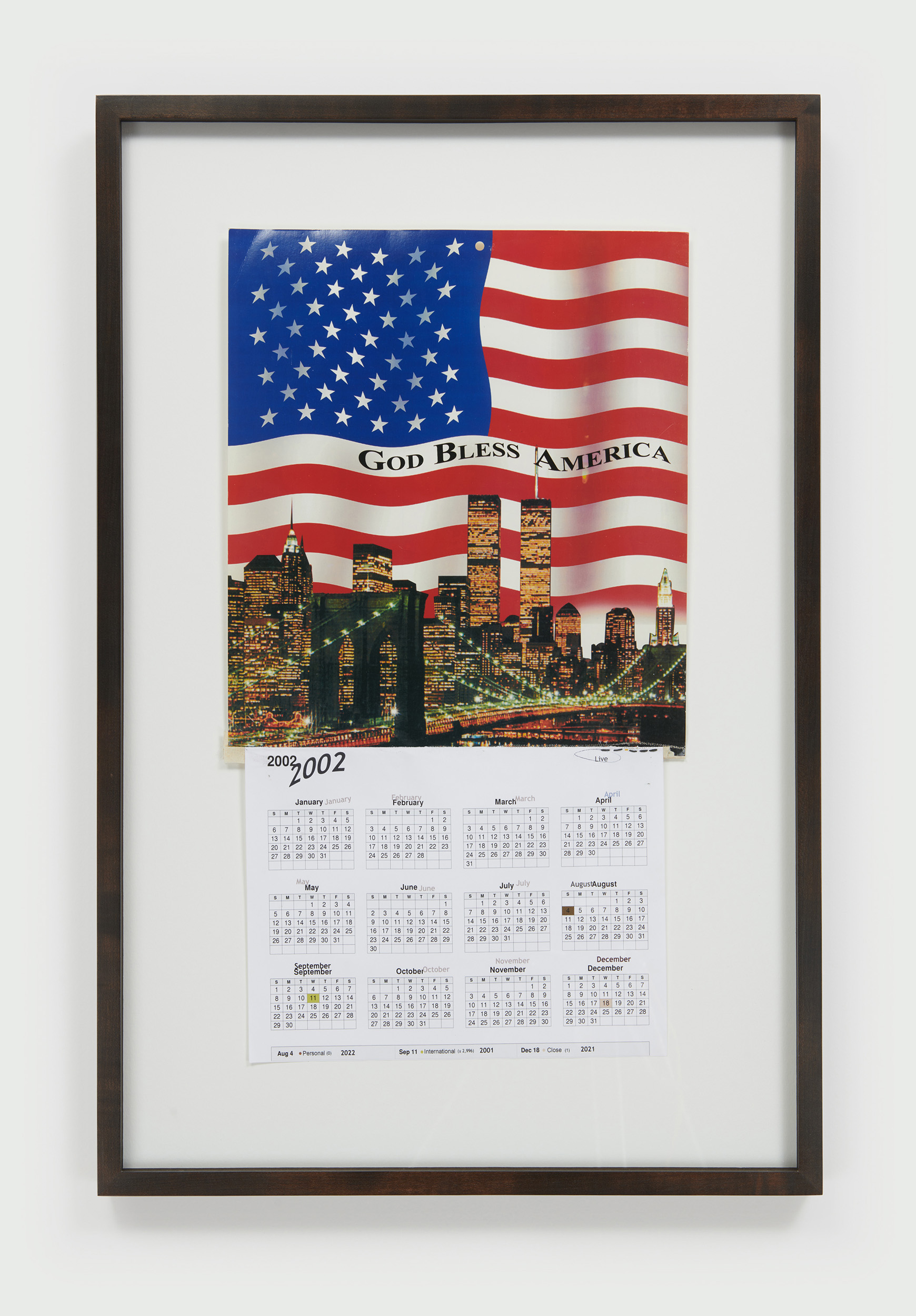 Shown alongside the quilts are a series of found calendars from 2002 that were produced to honor and commemorate 9/11. Their pages plot the days and months of the new year beneath high-resolution photographs of the intact Twin Towers. The film theorist Thomas Elsasser describes Hollywood productions as the “fakes we love to make authentic.” Chance embraces this idea, locating authentic feelings in these images.
