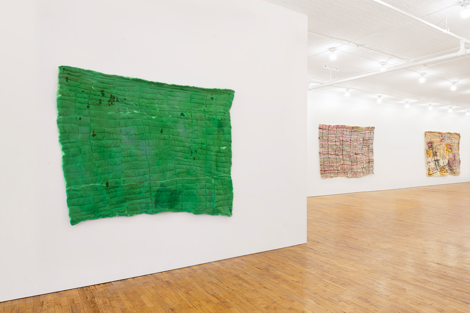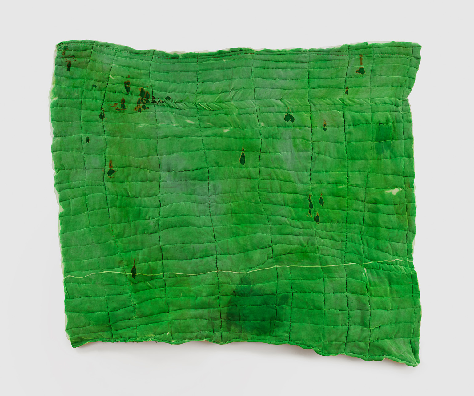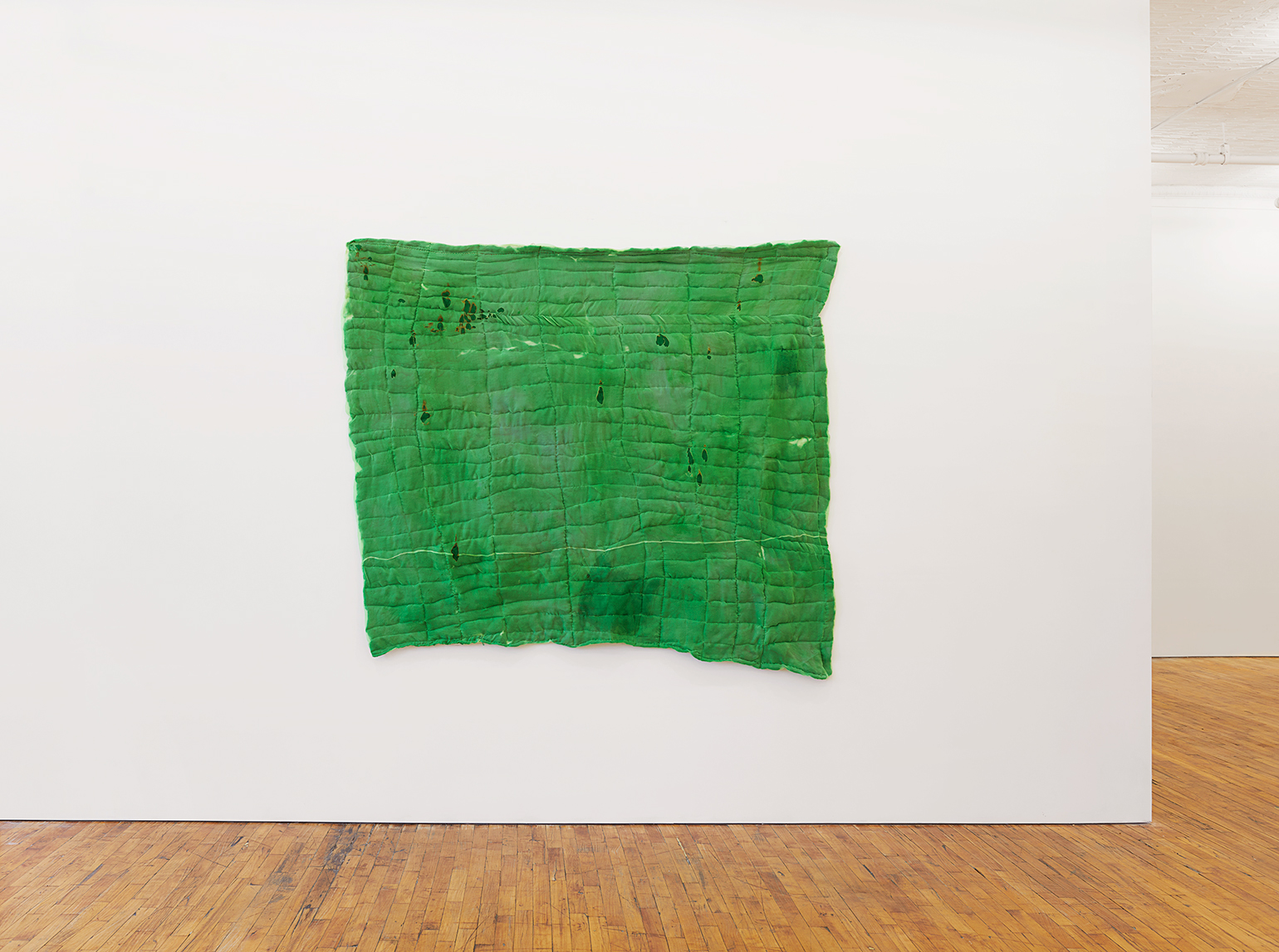The green screen is an object manufactured to disappear. When deployed in Hollywood productions, it dissolves into computer-generated abundance. Justin Chance’s Green Screen, 2023, a hand-dyed quilt in a shade of chroma-key green, playfully refuses this erasure, calling attention to the green screen as both object and subject. Honoring its namesake as more than a mere site of projection, Chance’s version of the green screen sees it transformed into an arresting and highly personal artifact. Its surface bears the intimate marks of its maker: the fabric is flecked and mottled, soft and supple, it falls in loose unscripted motions, no longer just a handmaiden of digital storytelling but the protagonist of its own fluid narrative.