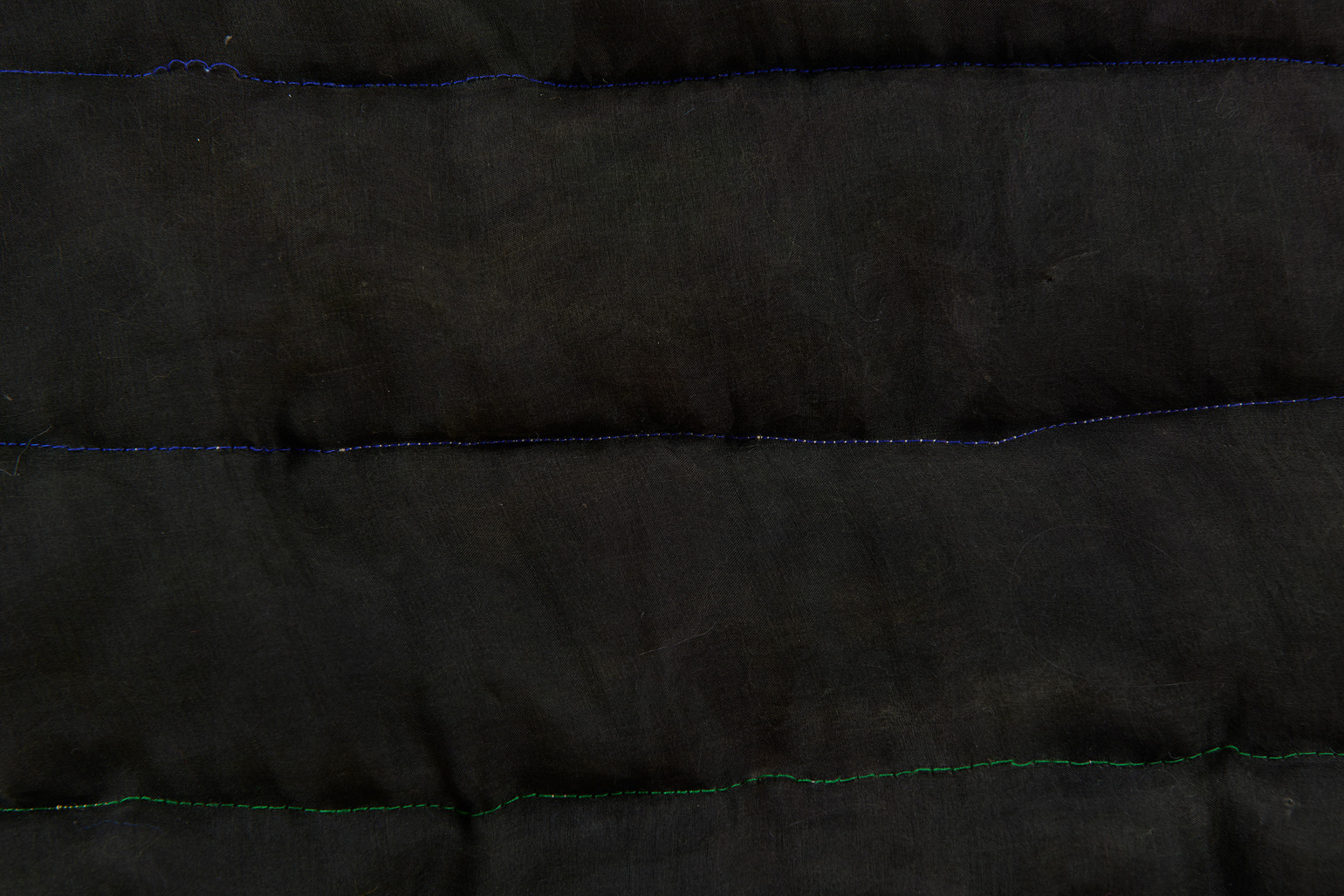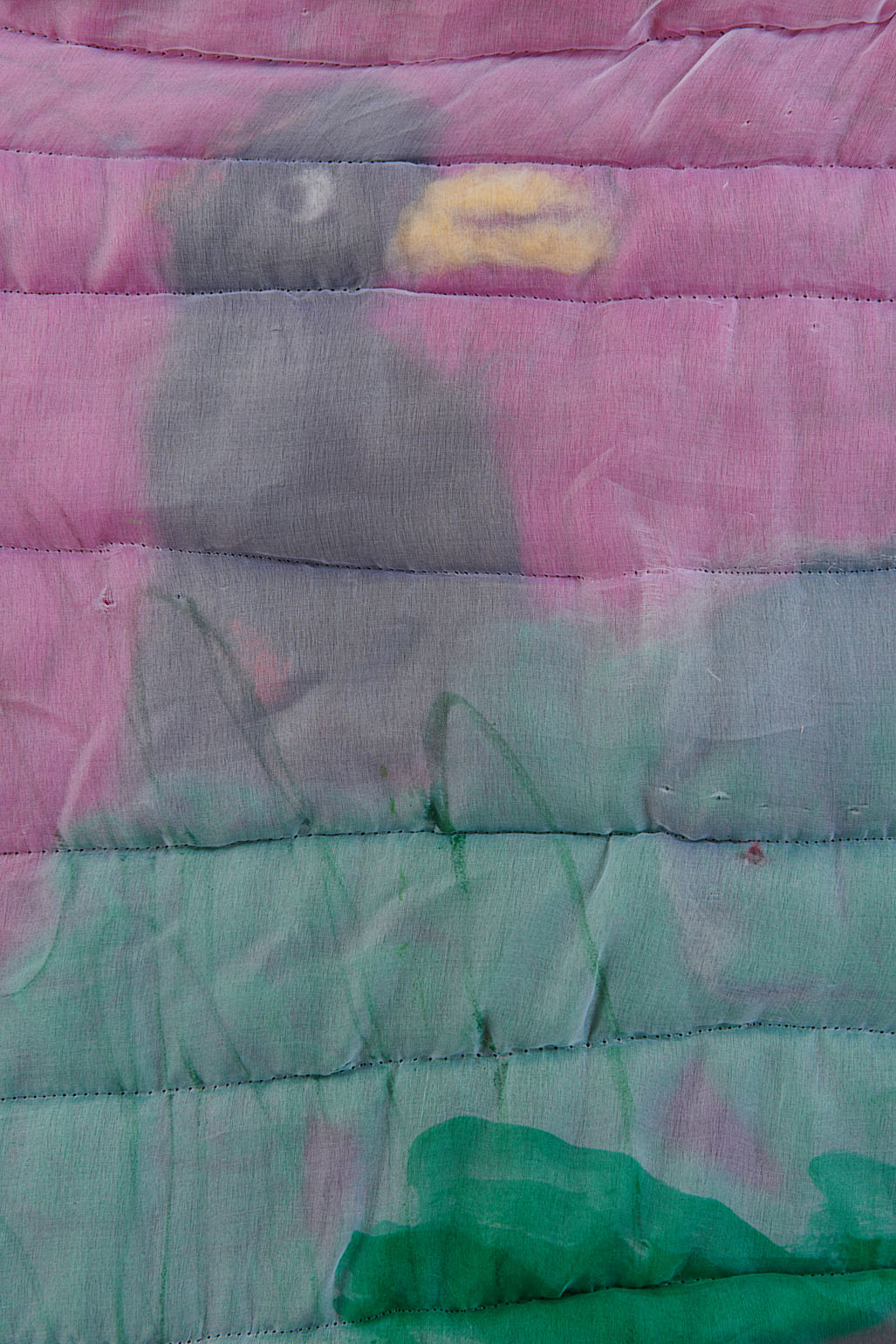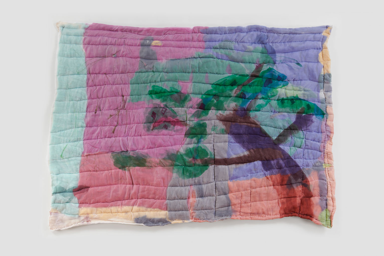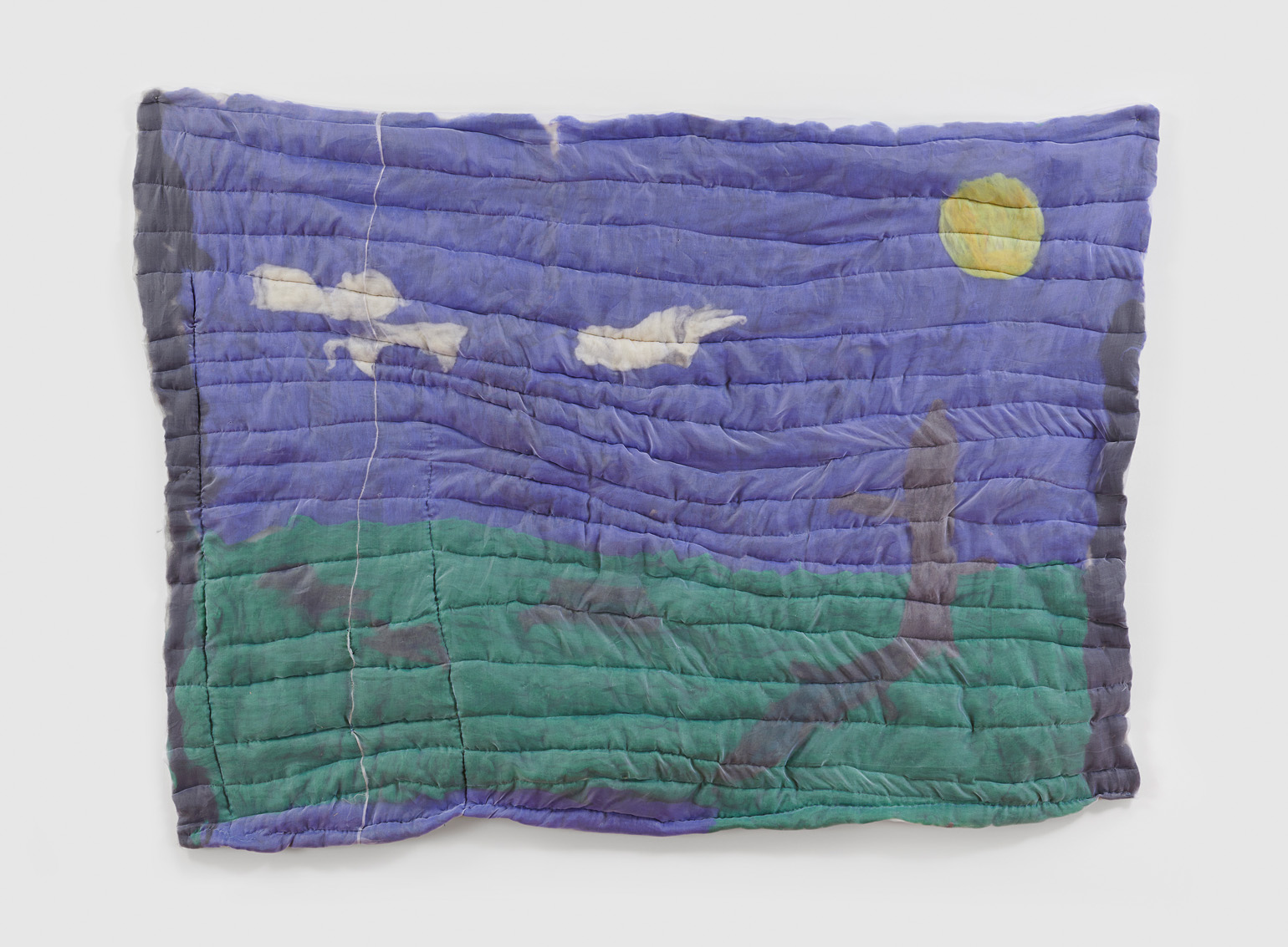 The green screen is an object manufactured to disappear. When deployed in Hollywood productions, it dissolves into computer-generated abundance. Justin Chance’s Green Screen, 2023, a hand-dyed quilt in a shade of chroma-key green, playfully refuses this erasure, calling attention to the green screen as both object and subject. Honoring its namesake as more than a mere site of projection, Chance’s version of the green screen sees it transformed into an arresting and highly personal artifact. Its surface bears the intimate marks of its maker: the fabric is flecked and mottled, soft and supple, it falls in loose unscripted motions, no longer just a handmaiden of digital storytelling but the protagonist of its own fluid narrative.
