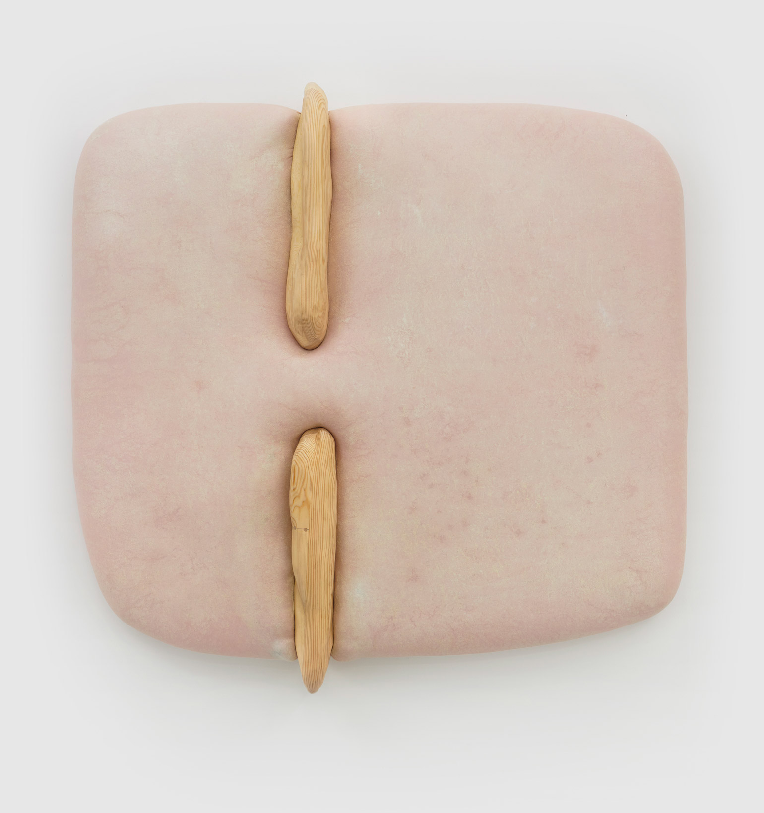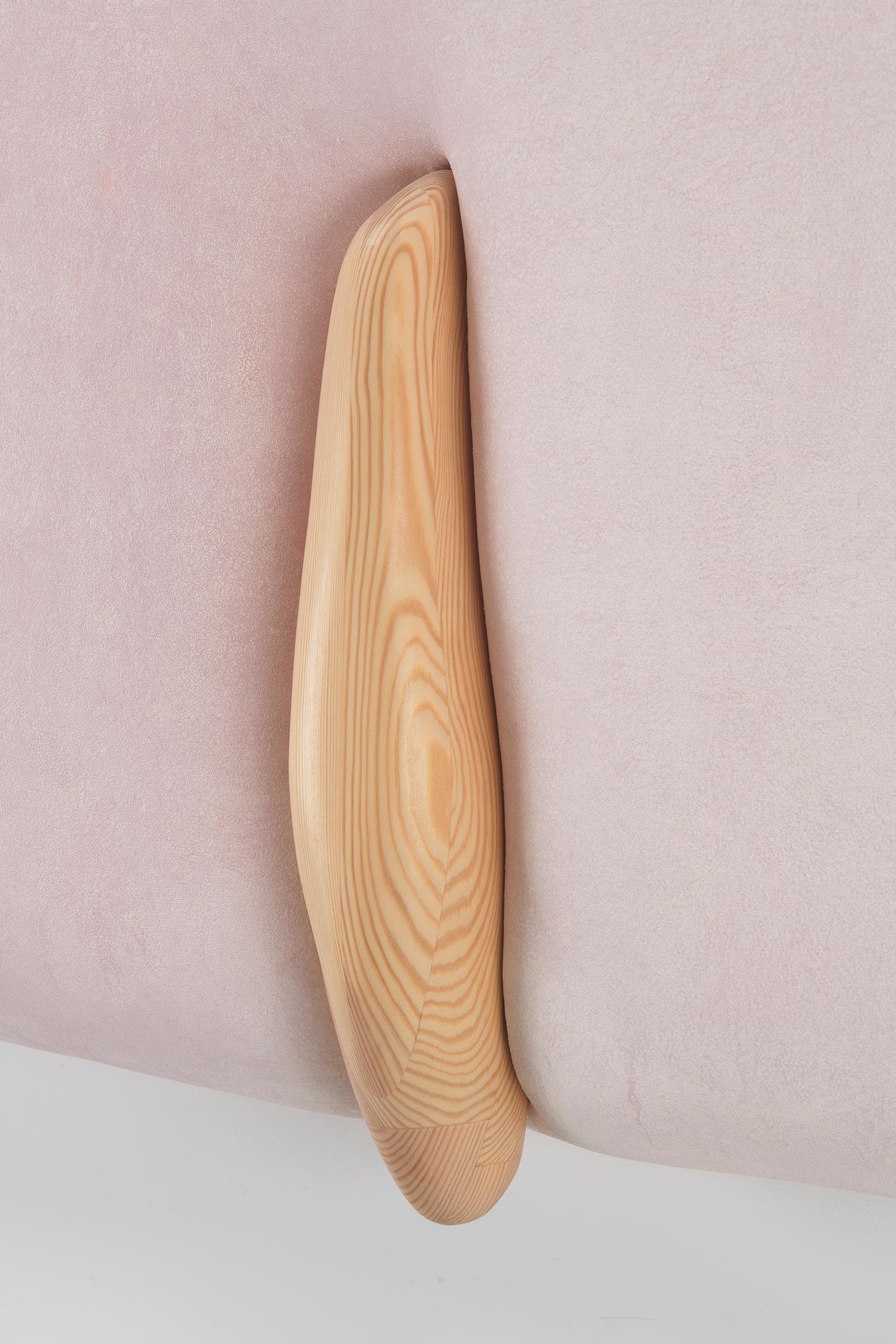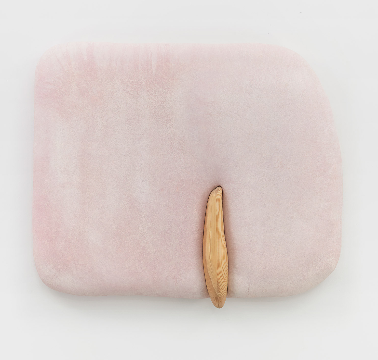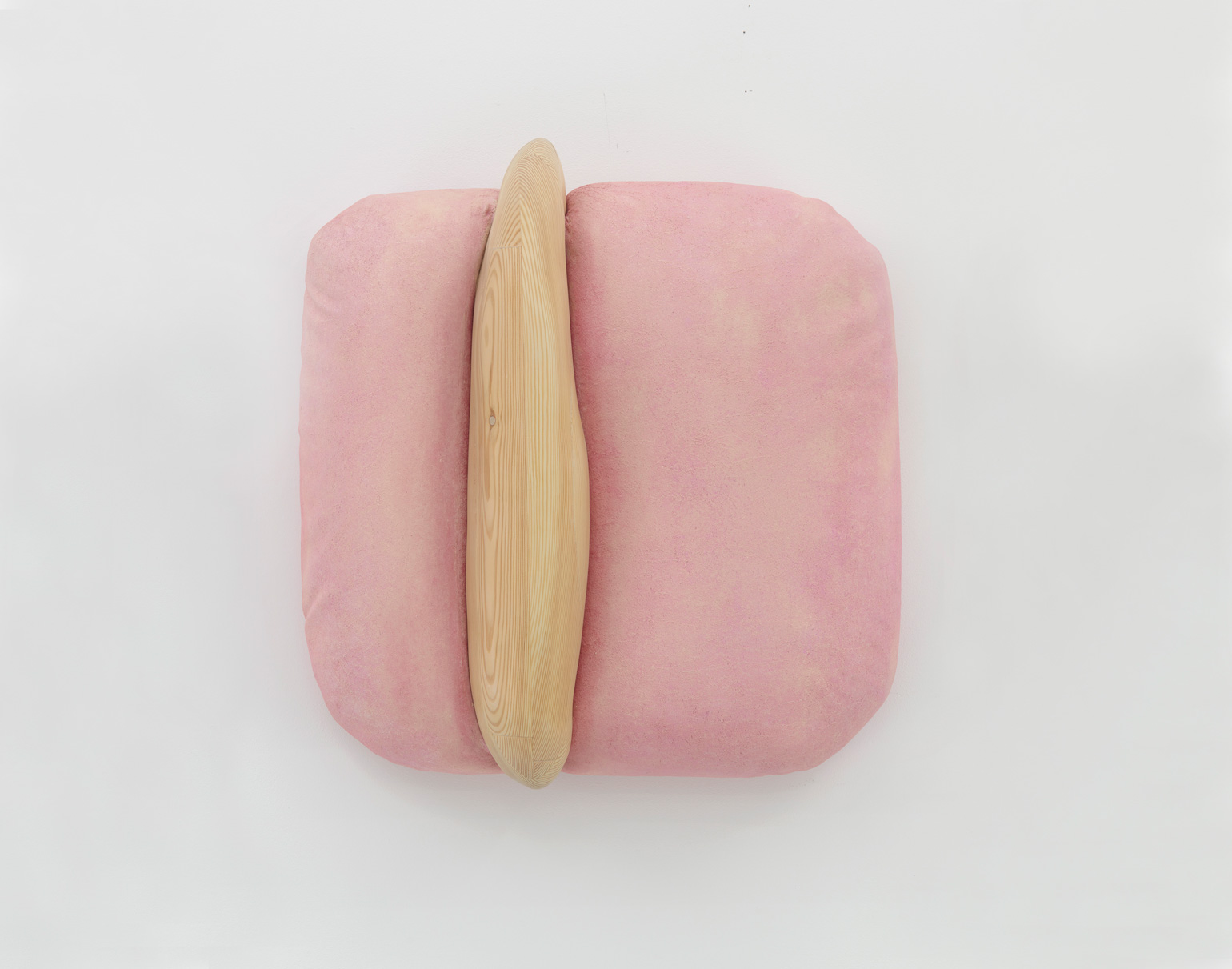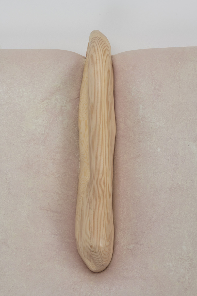 Whether clinging to the wall or freely-suspended, these objects churn codified binaries beyond expectation – visceral/epidermal, prosthetic/native, sensuous/aversive, primeval/plasticine – their sculptural logics minted from substances that would be at home at home: expanded foams, tufted velvet, a touch-up coat of eggshell acrylics, plain-woven canvas, joists of timber, the liniment-like glimmer of varnish, nails, the melodious note of soft-hewn pine. Under Kothe’s hand, they are massaged into the soft securities of a domestic milieu and the pliant, if evanescent, warped comforts of the not-quite flesh.